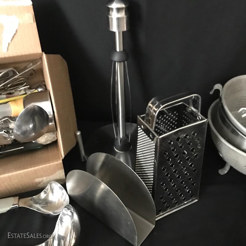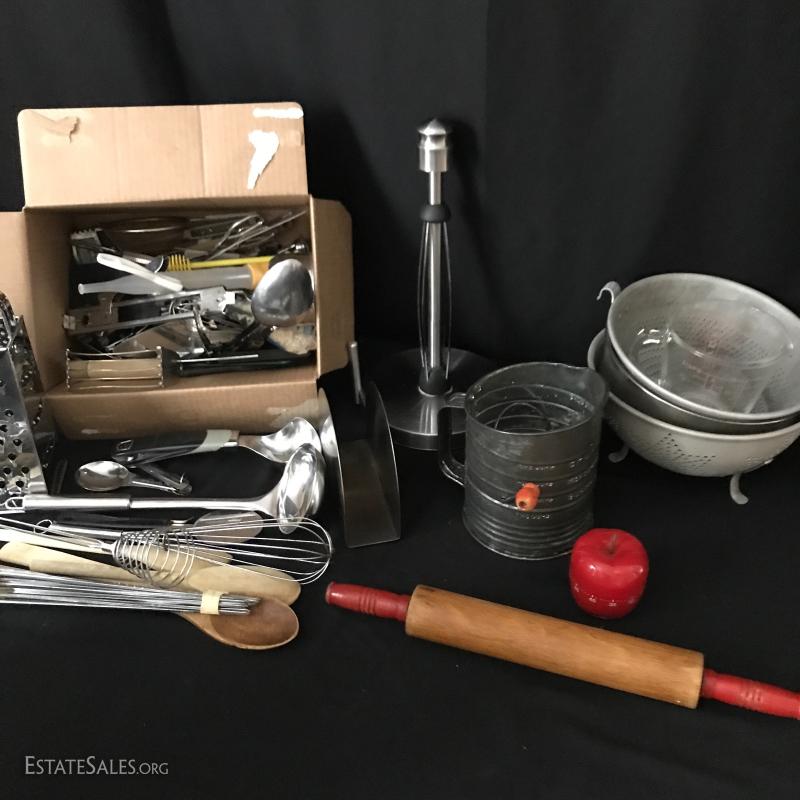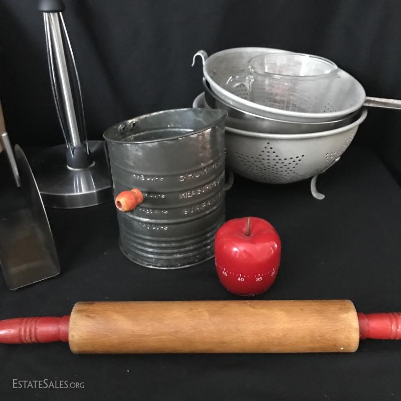 Vintage red handle rolling pin and sifter. Other misc. utensils include grater, towel holder, timer, napkin holder, skewers, wooden spoons and more. Shipping available or local pick up in Asheville, NC.