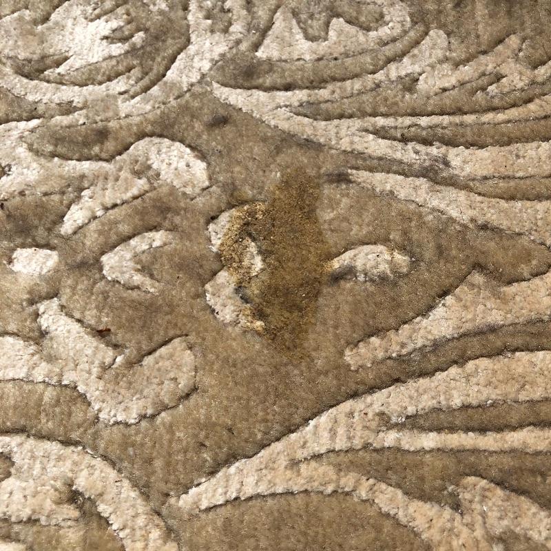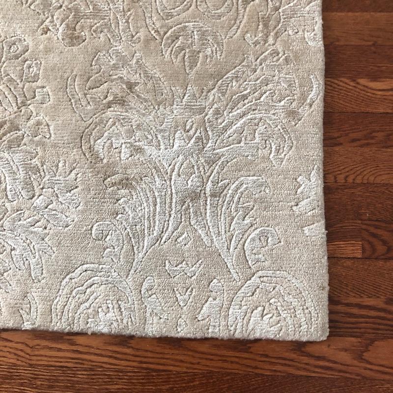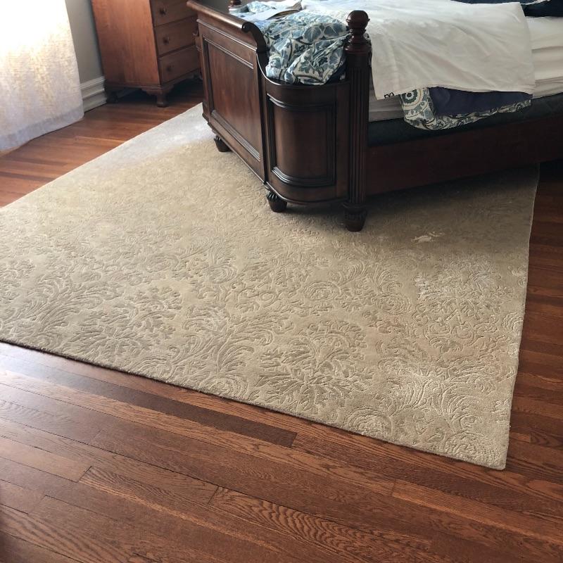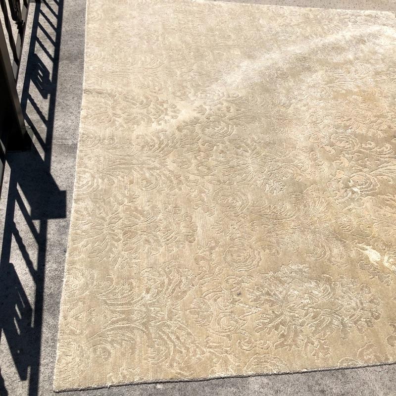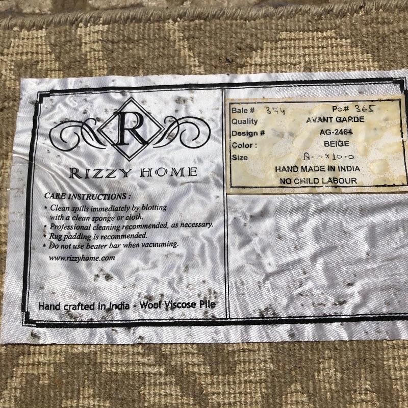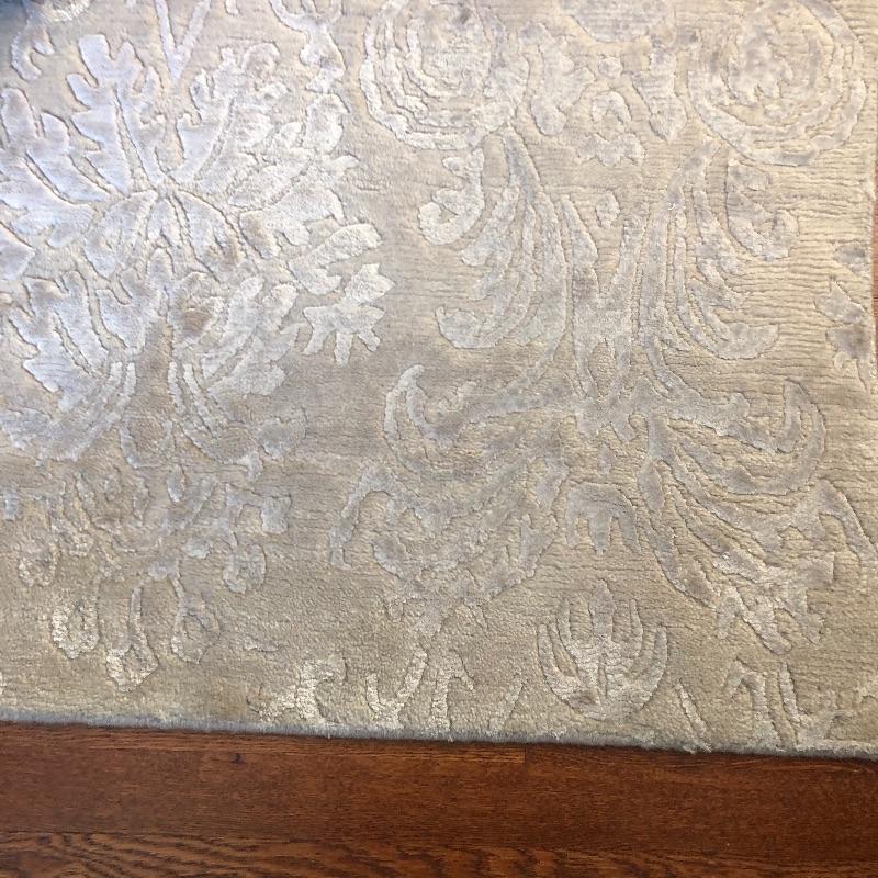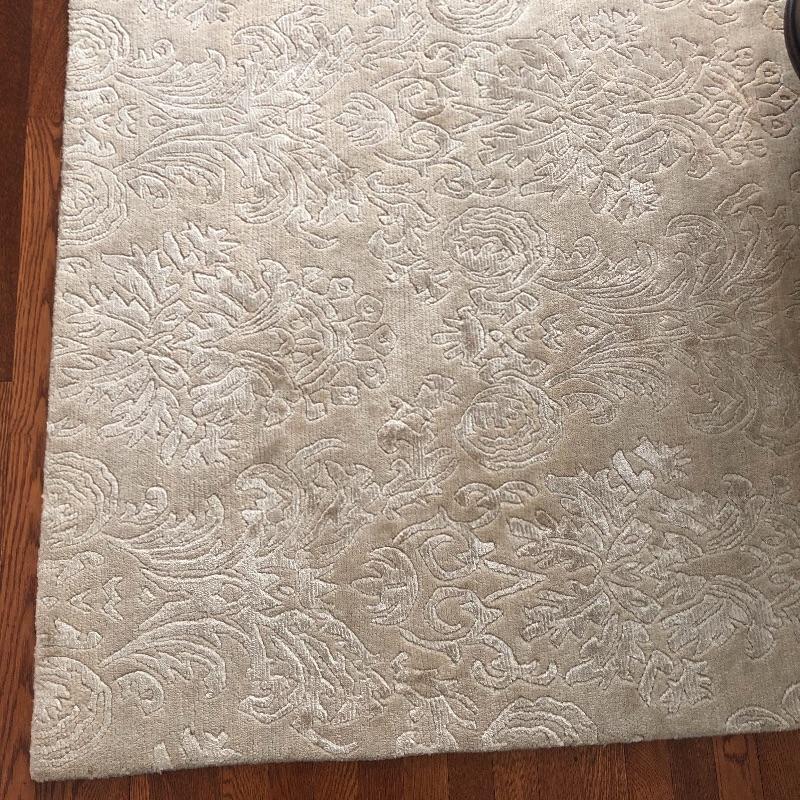 This beige area rug with pattern will protect your floors and keep your feet warm. Rug has some stains and dust, see pictures. Rug measures 96” x 117”. Rug pad included. Bring help item is substantial and up two flights of stairs.
