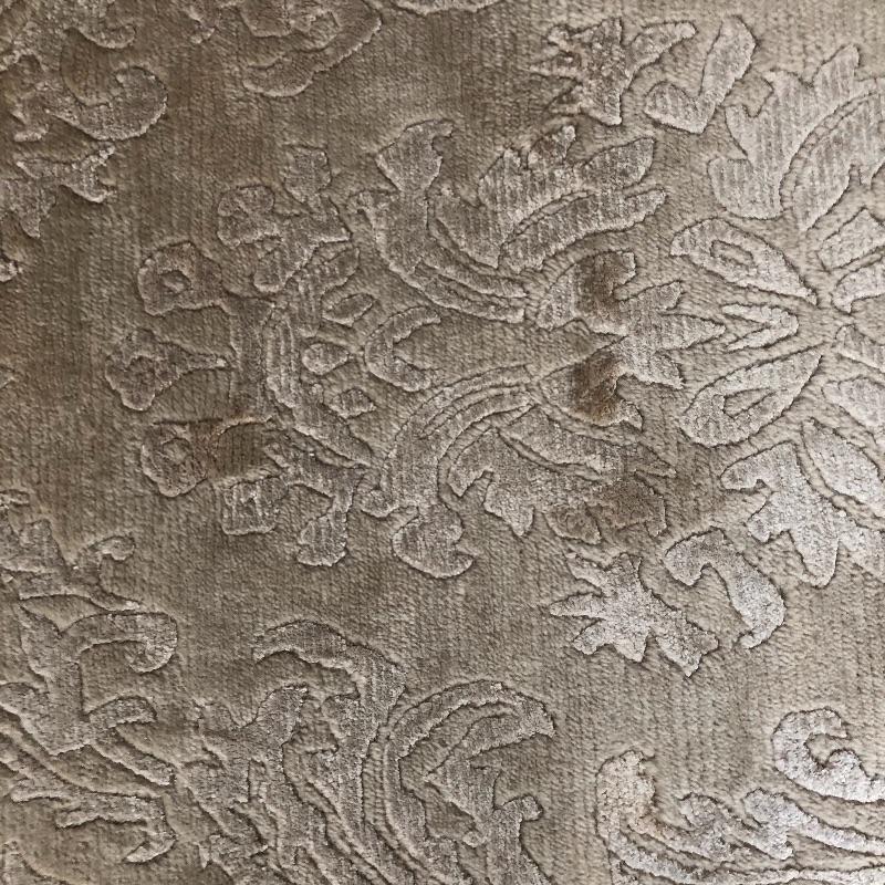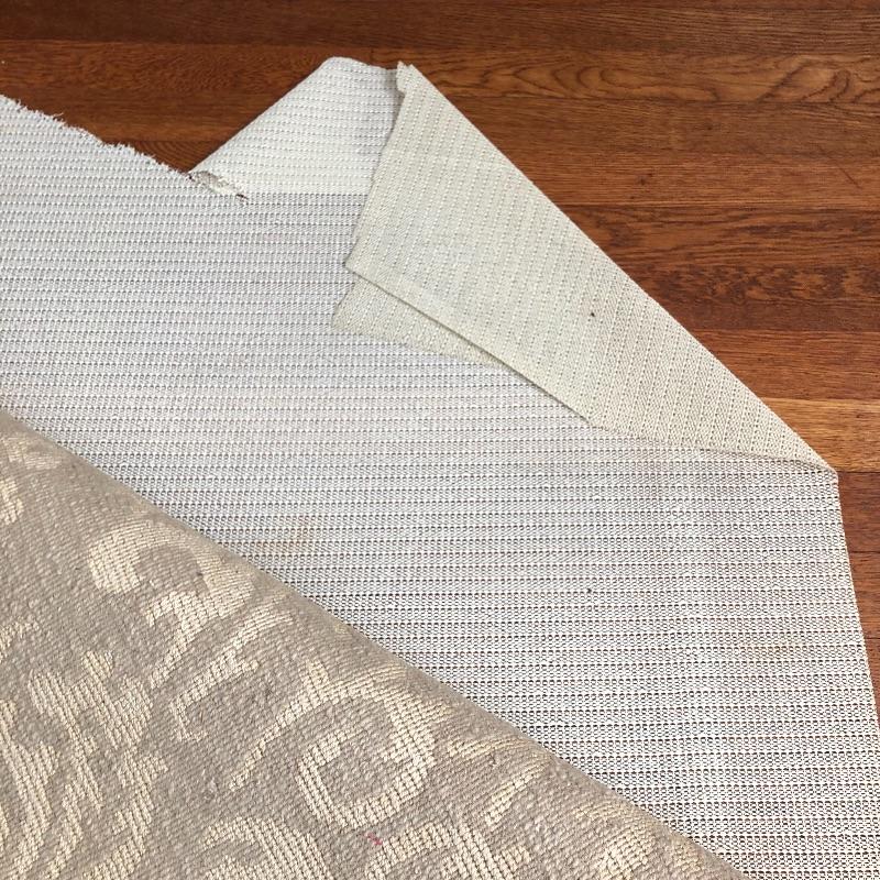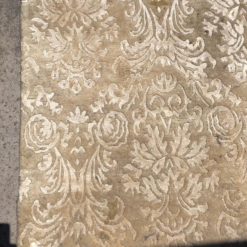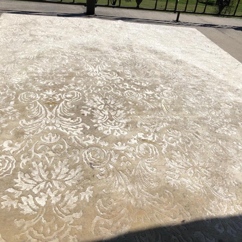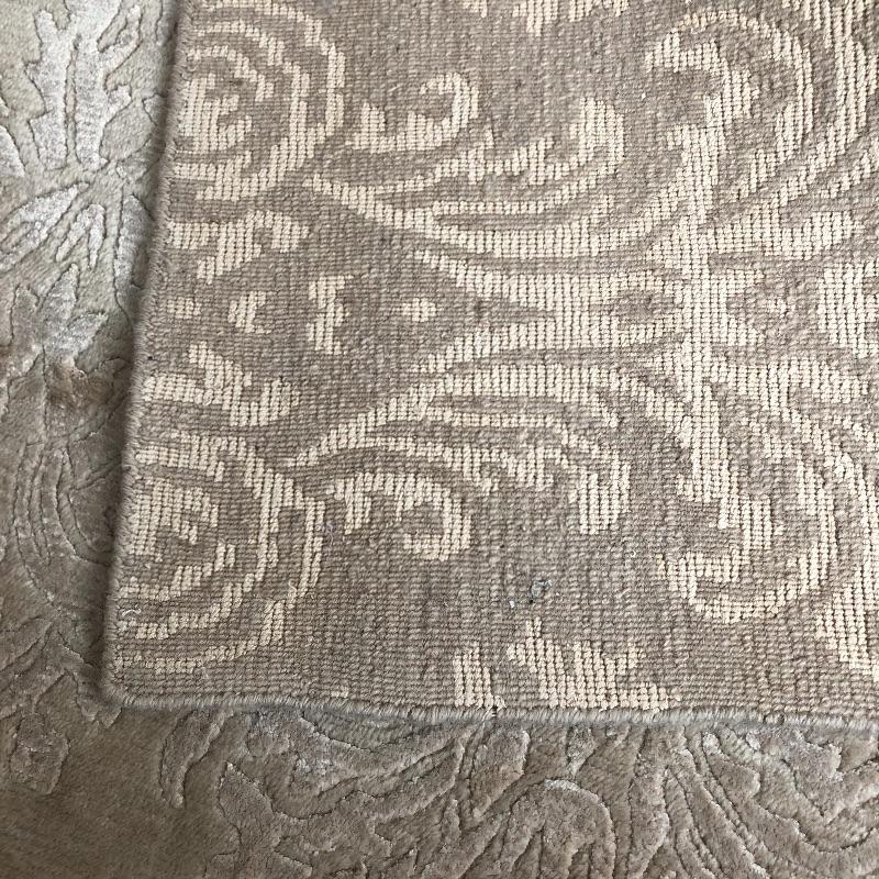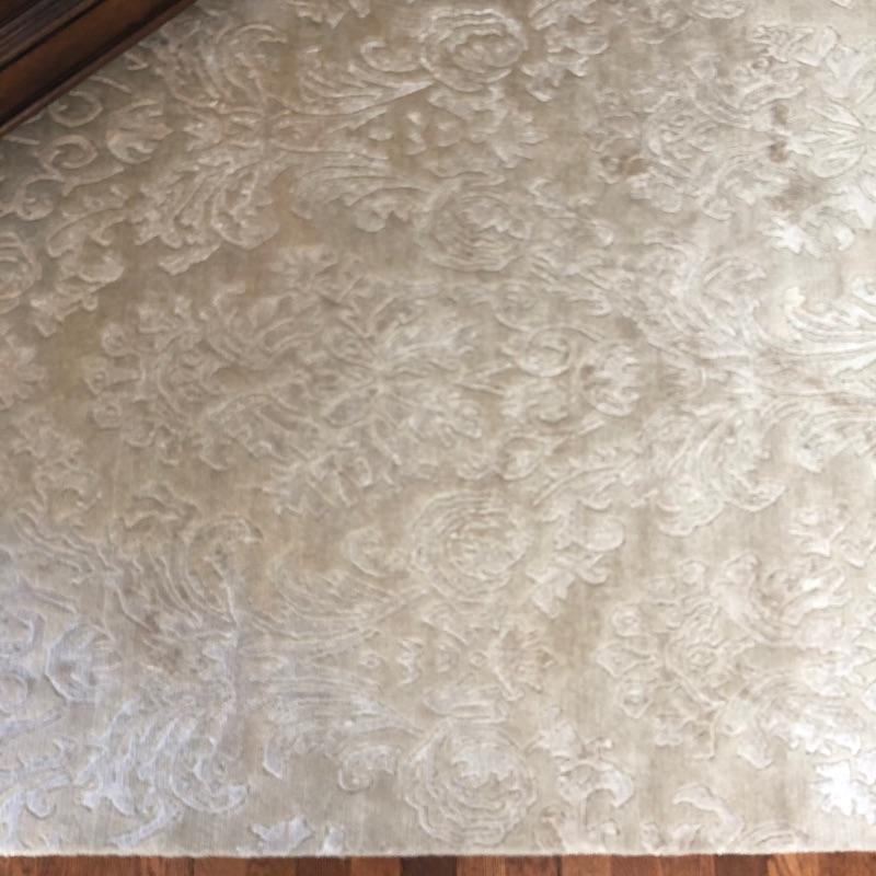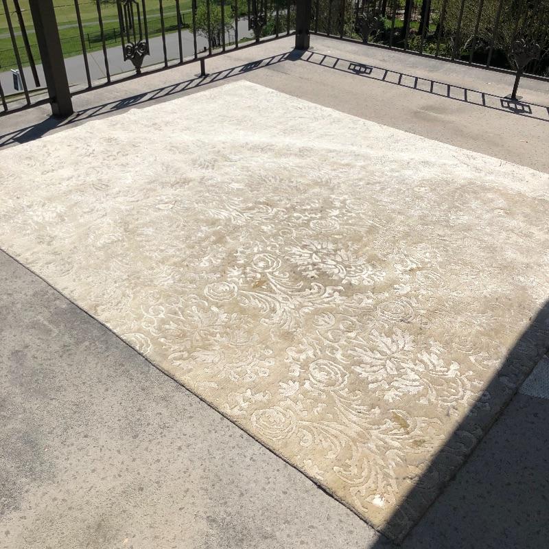This beige area rug with pattern will protect your floors and keep your feet warm. Rug has some stains and dust, see pictures. Rug measures 96” x 117”. Rug pad included. Bring help item is substantial and up two flights of stairs.