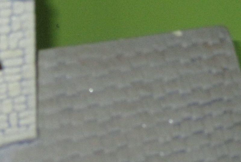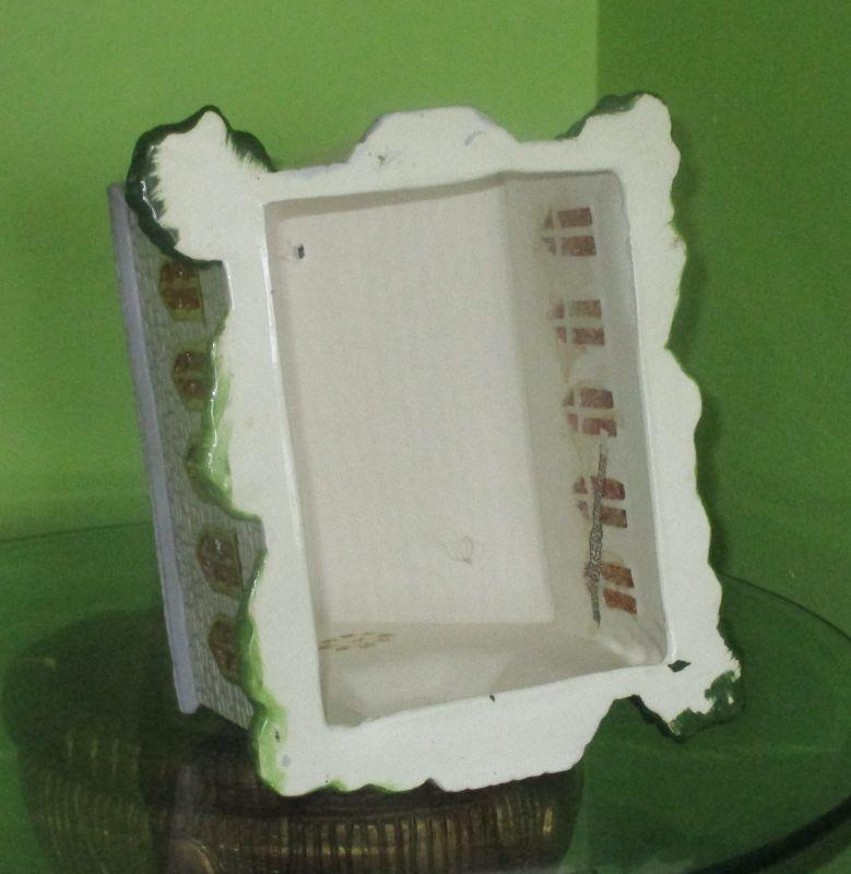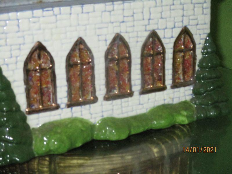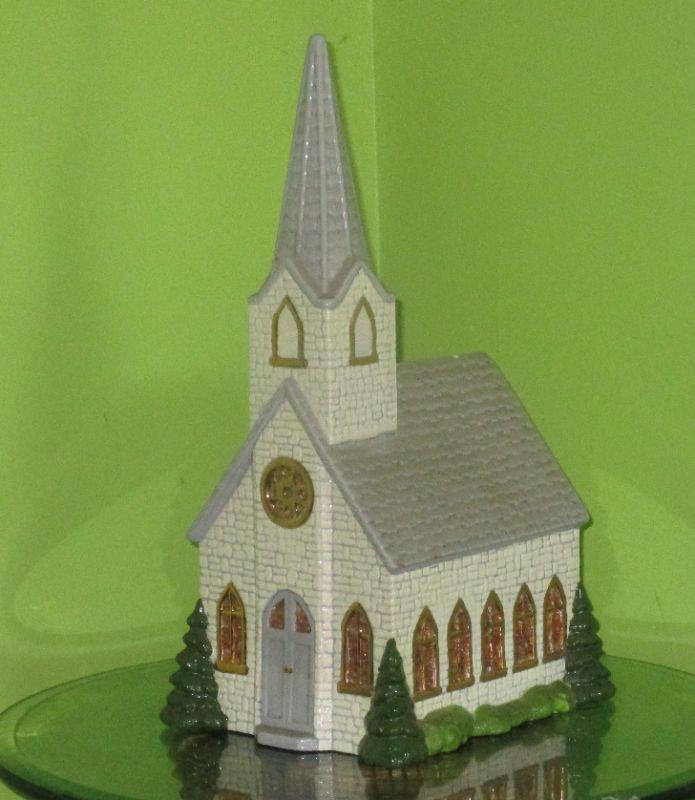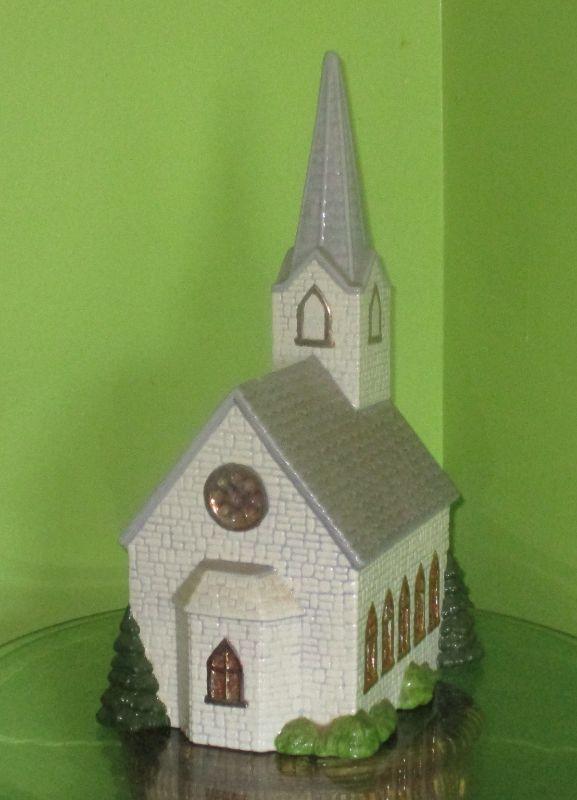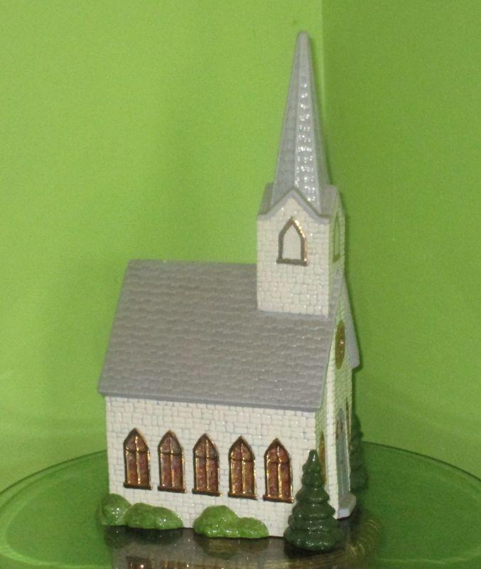 The windows have a crushed like glass in each to give the effect of stained glass. It is 17.5" at the highest point and in very good condition with one small chip of paint on the back peak of the roof.