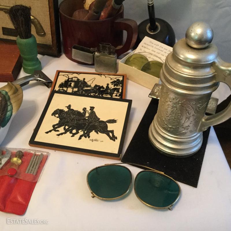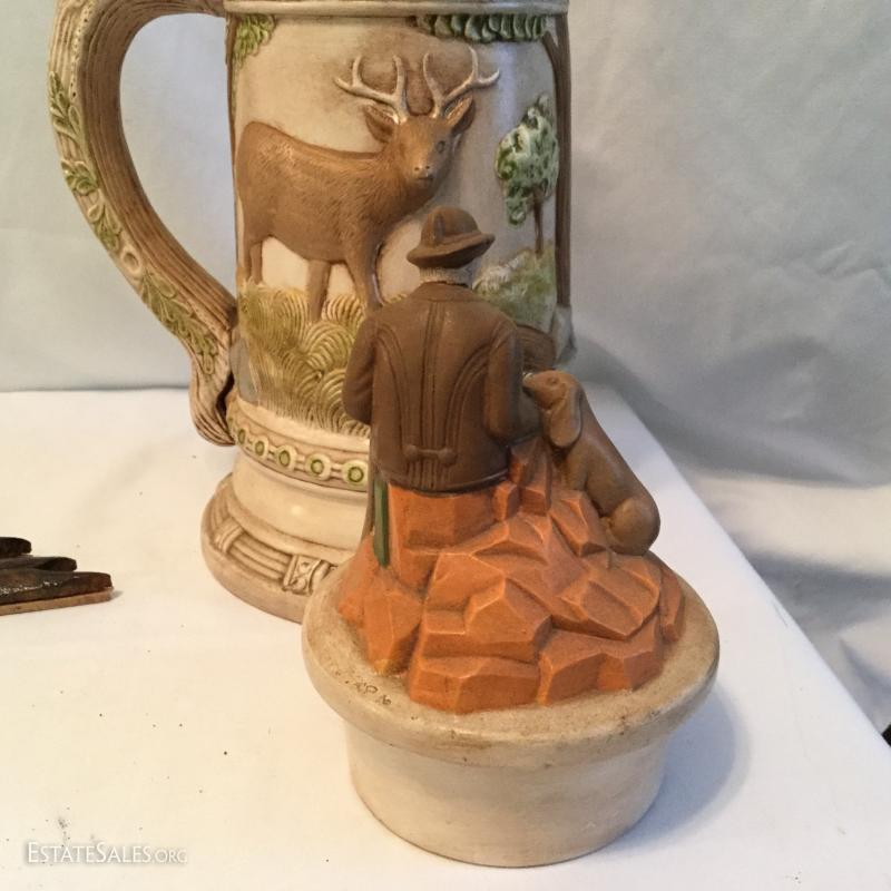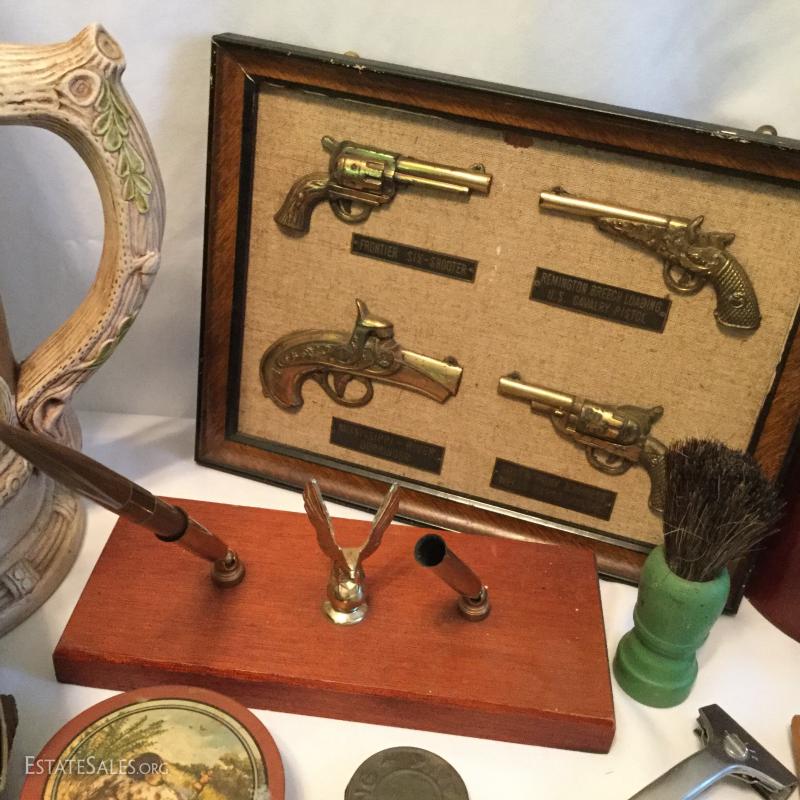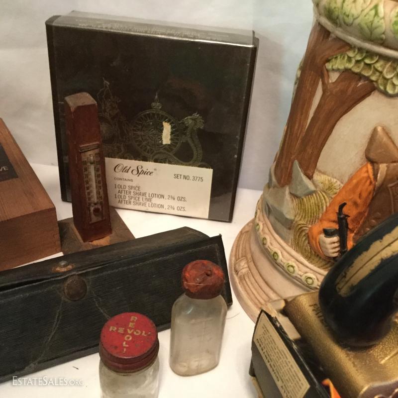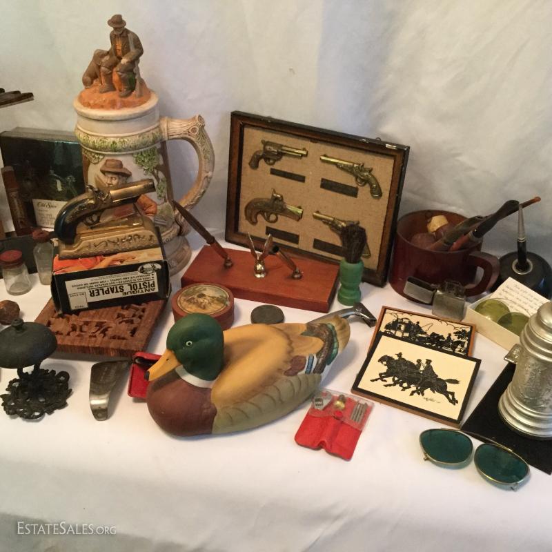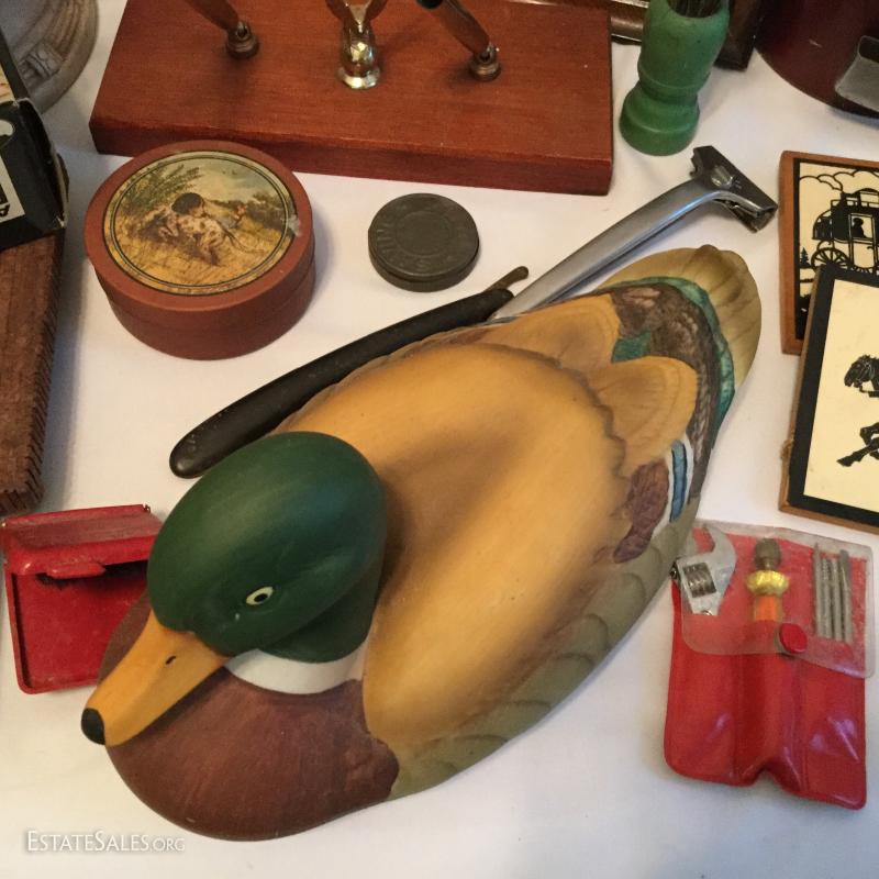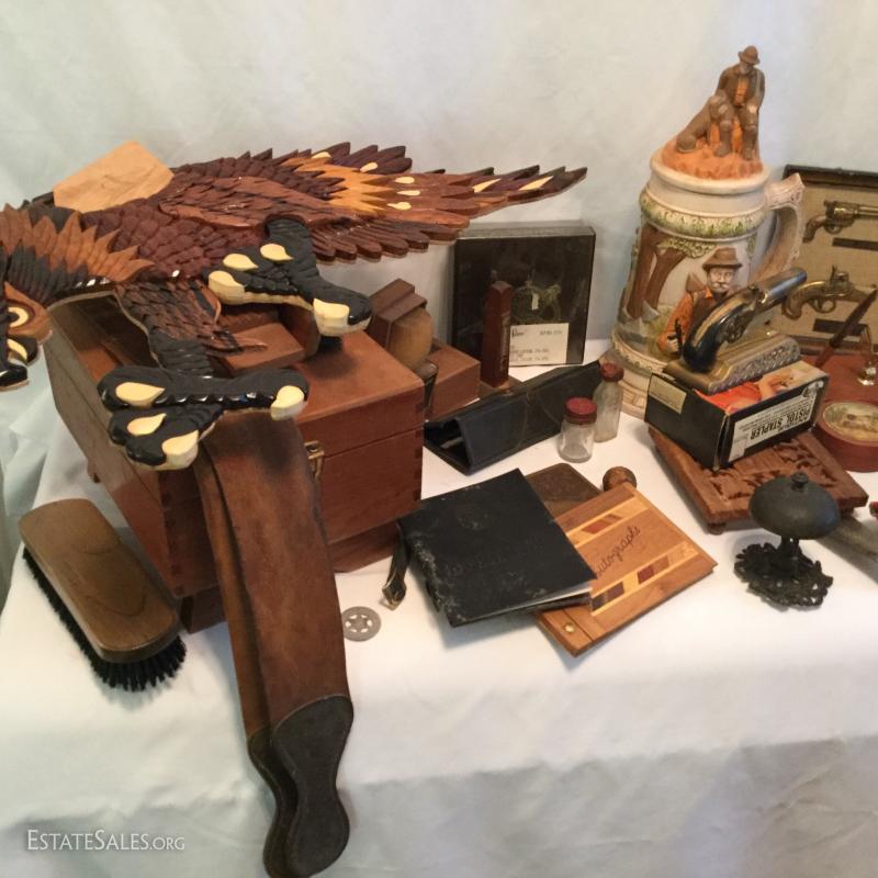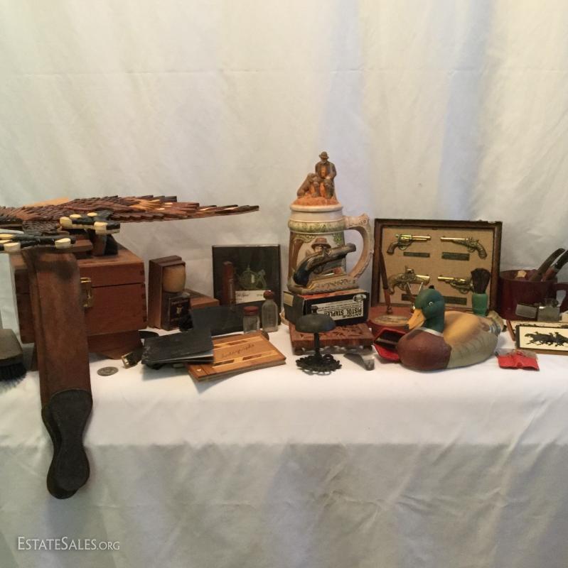 Misc. lot that includes a couple vintage bottles, stein, barber leather strap, wood shoe shine box, gun art, ducks, vintage ceramic humidor, wooden eagle and much more. See photos