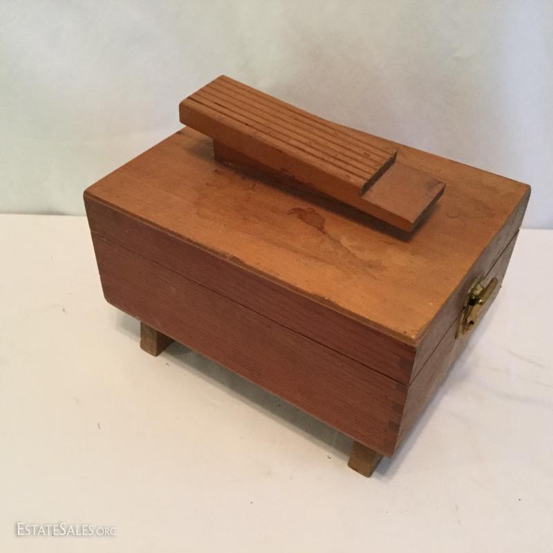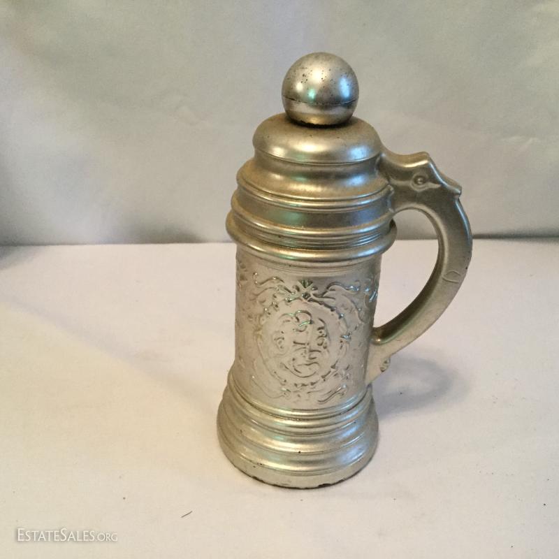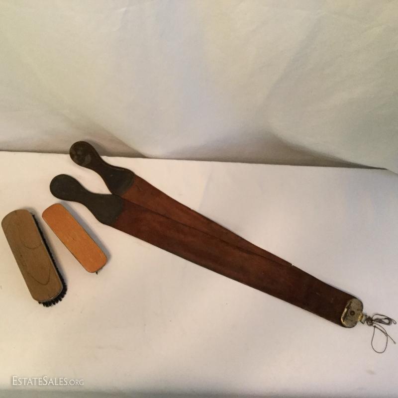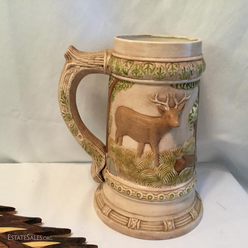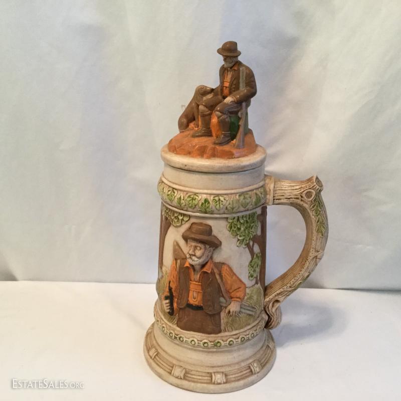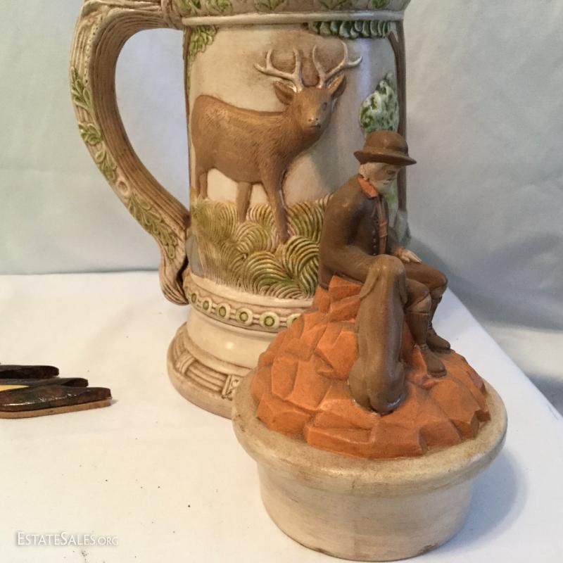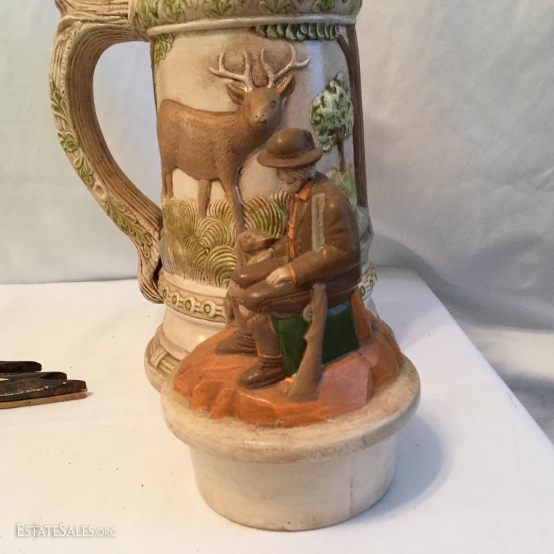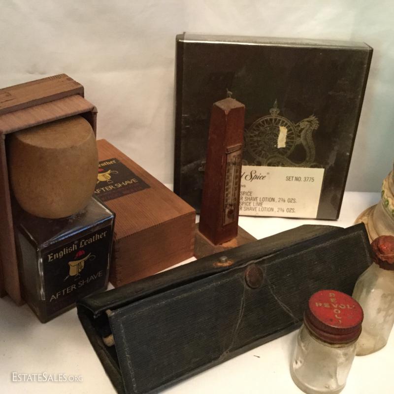Misc. lot that includes a couple vintage bottles, stein, barber leather strap, wood shoe shine box, gun art, ducks, vintage ceramic humidor, wooden eagle and much more. See photos