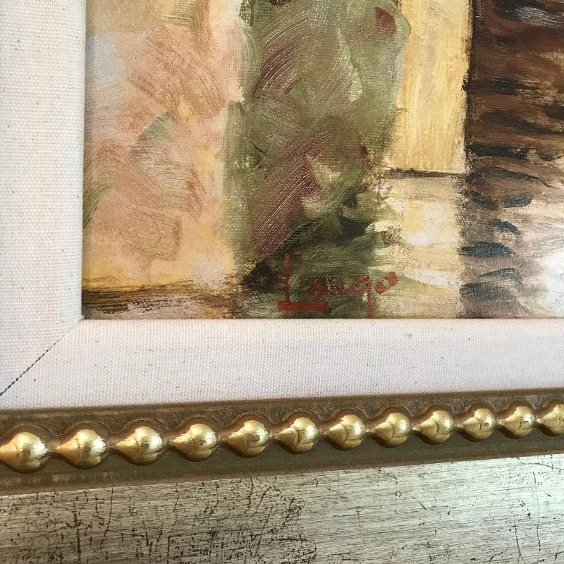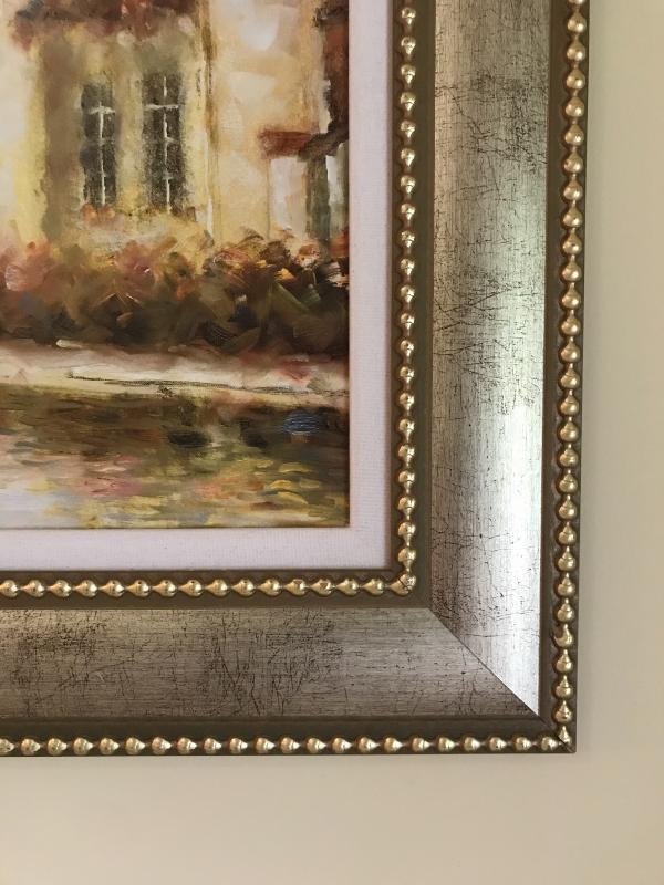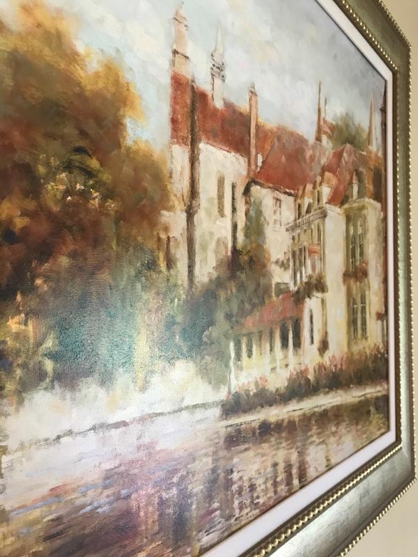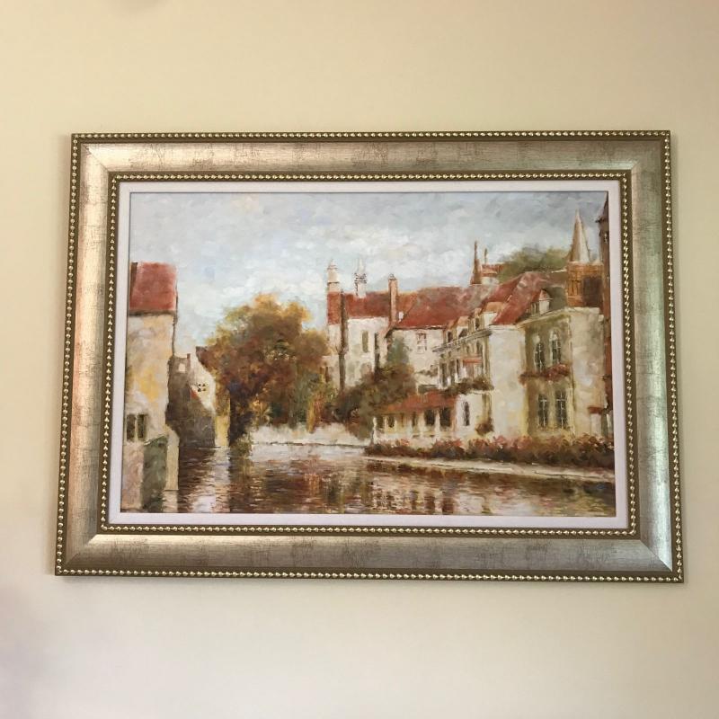 Large painting of European scene. See photo for signature. Nicely framed. Makes a great statement in your home. Measures 56” x 41”. No shipping.