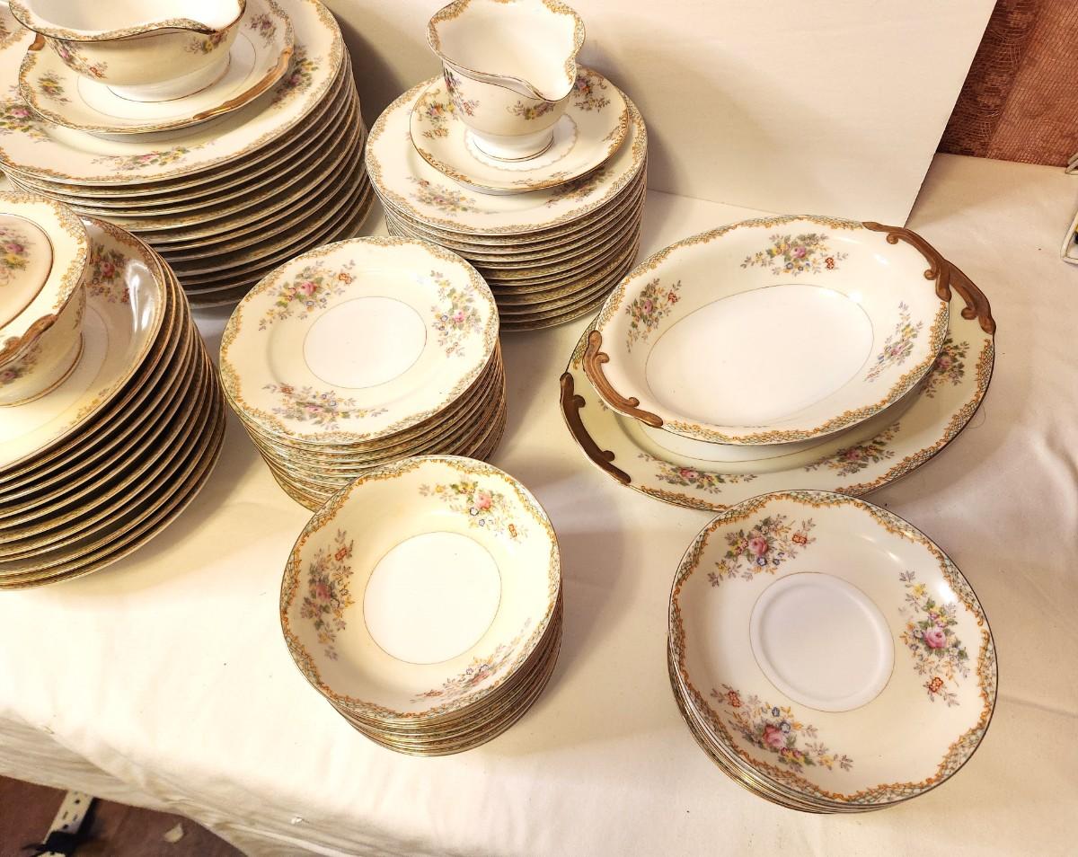 You get all you see here - KONGA Japan dinnerware set - pre-World War II - lovely traditional pattern. You get a large platter, 11 cups/saucers, covered vegetable bowl, gravy boat with attached underplate, sugar/creamer, small platter, open vegetable bowl, 11 salad plates, 11 dinner plates, 12 soup bowls, 11 small bowls, 12 bread/butter plates. All in good vintage condition.