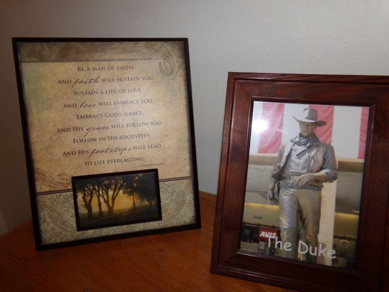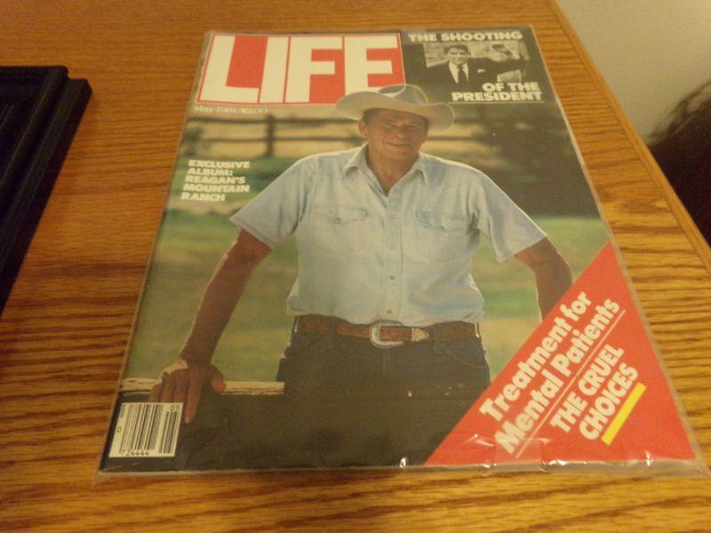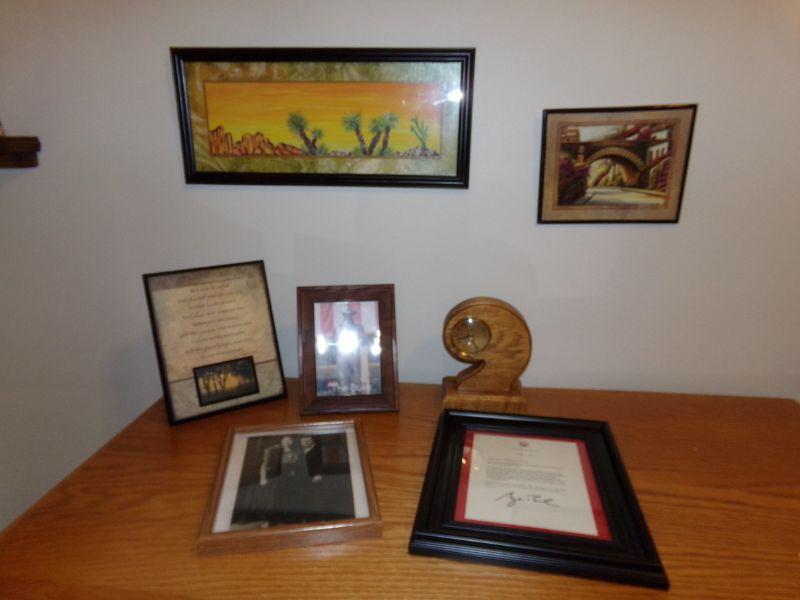 A LETTER SIGNED "GEORGE BUSH", LIFE MAGAZINE W/RONALD REAGAN ON THE COVER, ANTIQUE PICTURE, PICTURE OF JOHN WAYNE, PICURE ON THE WALL SIGNED "BOB NELSEN", OAK "9" CLOCK AND MORE