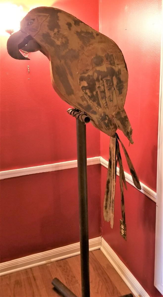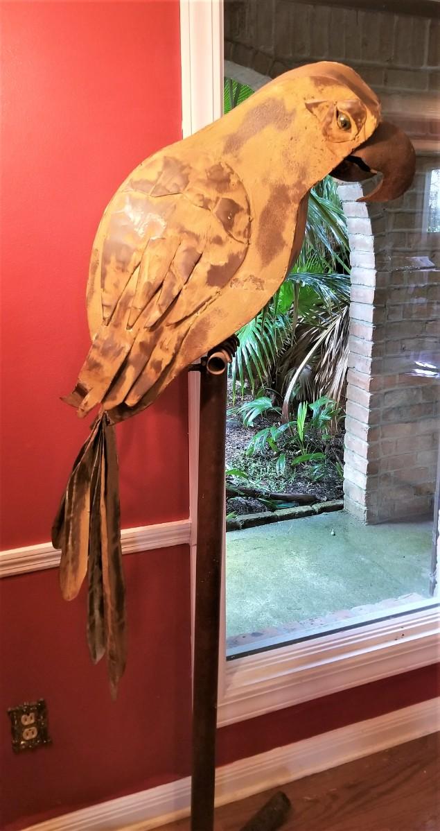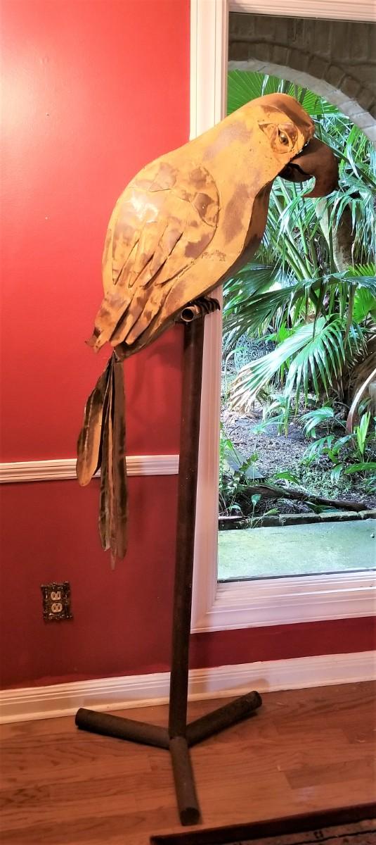 Large metal parrot sculpture on perch - original artist's piece. 69" tall. Parrot is 47" long top to tail. Indoor/outdoor - heavy stand. Very cool piece.