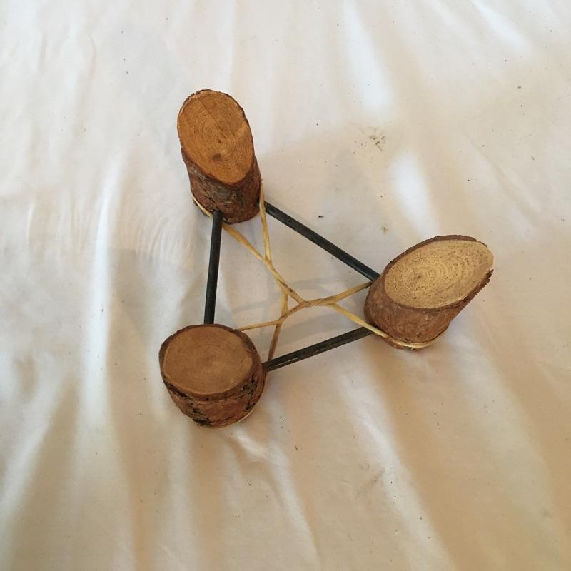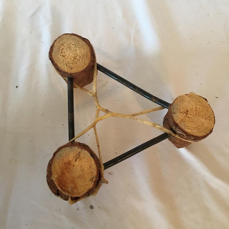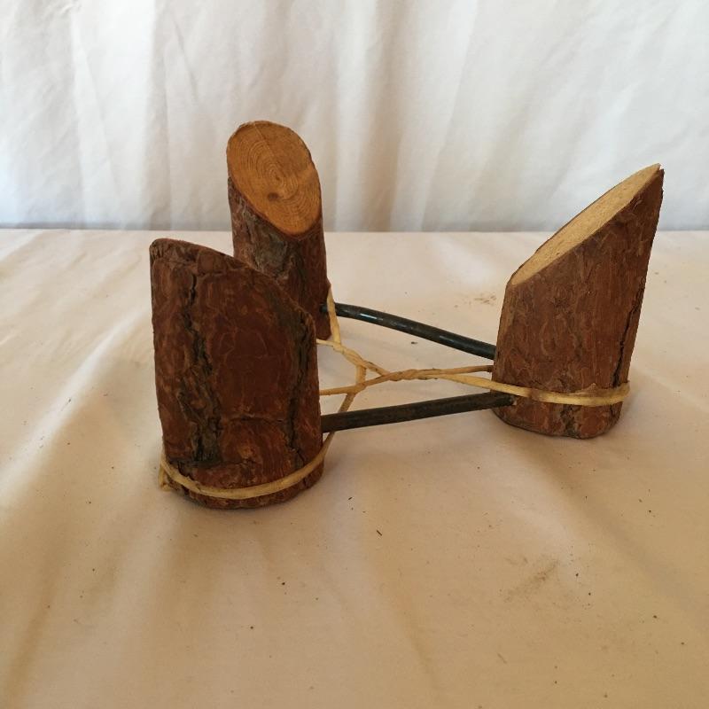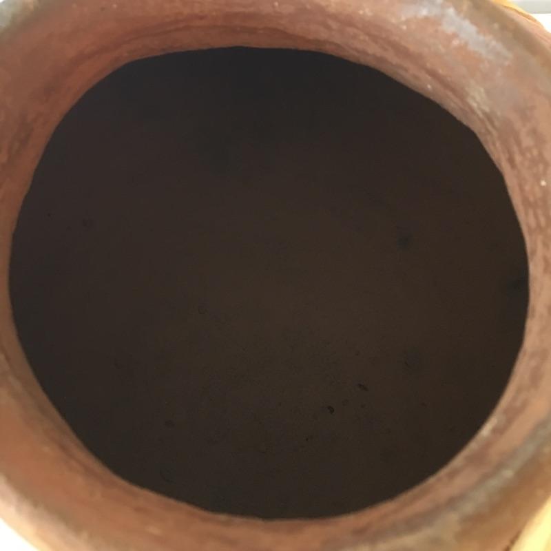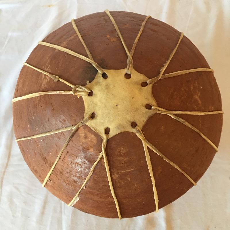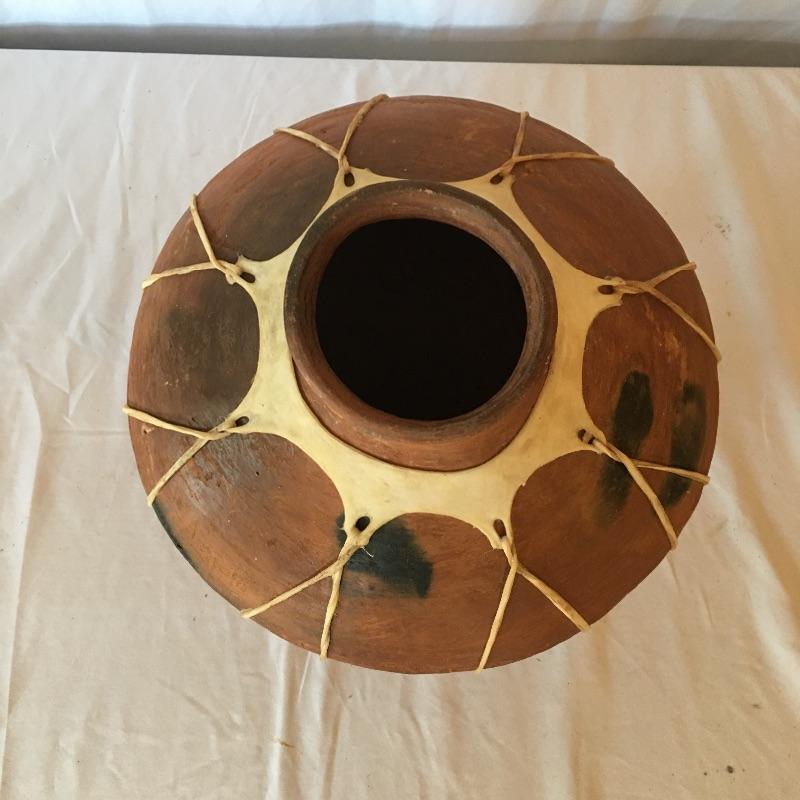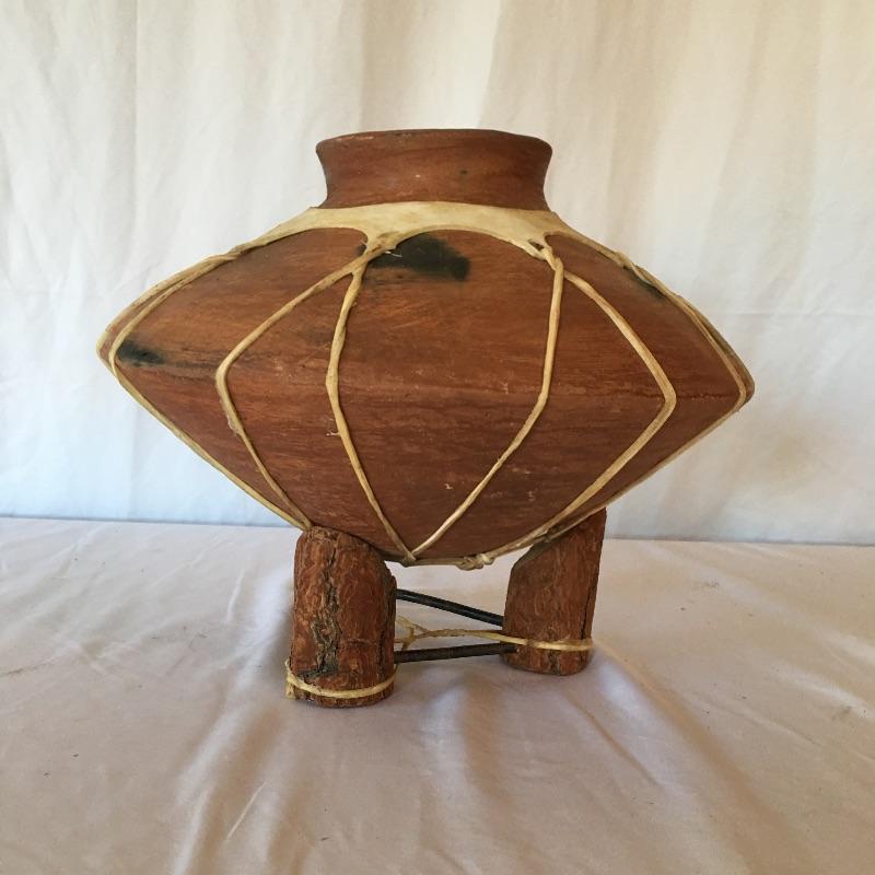 This Native American vase is rawhide bound and comes with a wooden and iron stand bound with rawhide. This primitive treasure comes on a small three legged stand.