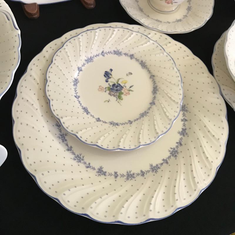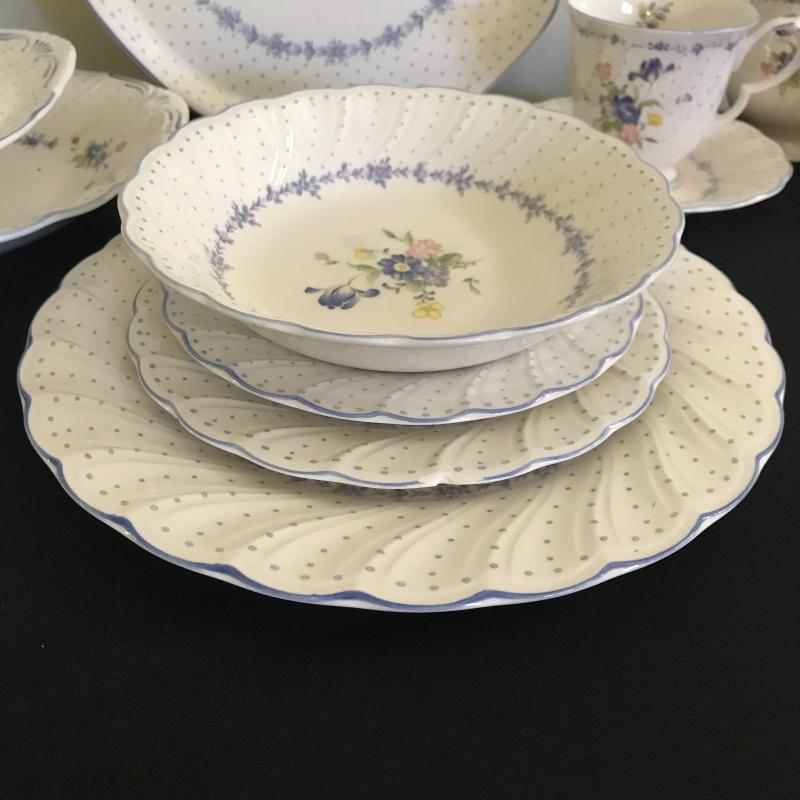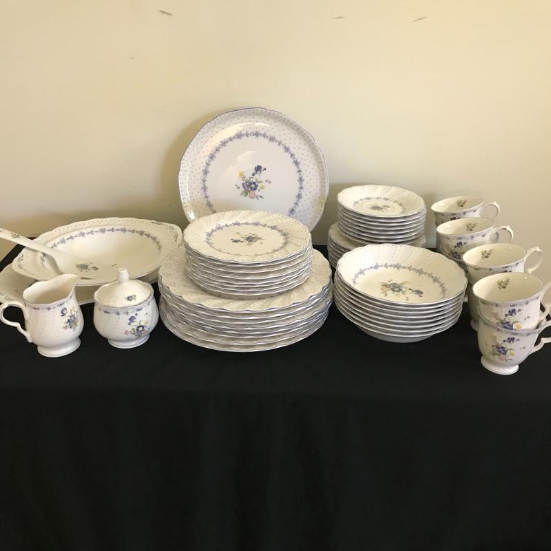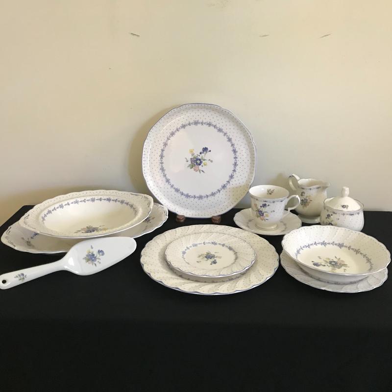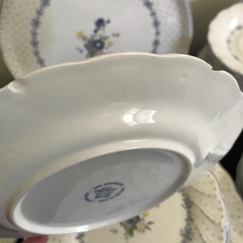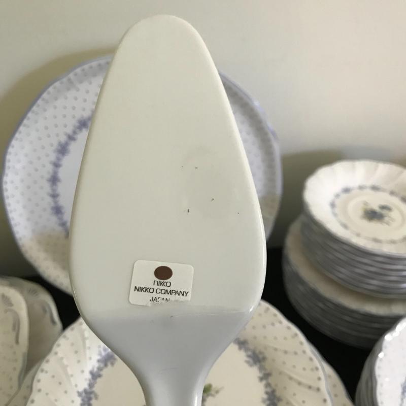 Nikko 55-piece set includes place setting for 8, sugar bowl w/ lid & creamer, serving platter, plate and bowl with spatula. Large oval platter measures approx. 14” x 9.5”. Good condition, 2 chips located in a salad plate, and crackling throughout set, see pics. Shipping available, please obtain a quote from UPS prior to bidding.