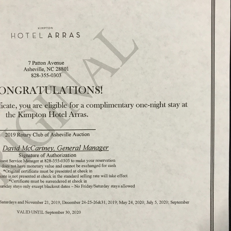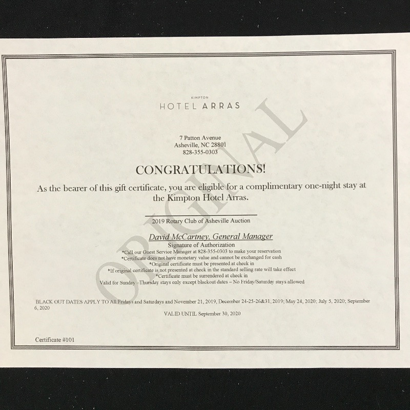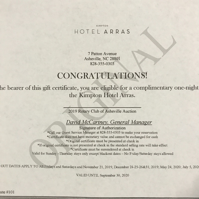 Gift Certificate for one night stay at the new Kimpton Hotel Arras in Asheville. This is in the old BB&T building in the heart of Asheville! Be one of the first guests to experience this wonderful new landmark hotel or situate your guests for the night. This certificate is valid through to September 30, 2020. Black out dates apply, see images for details.
