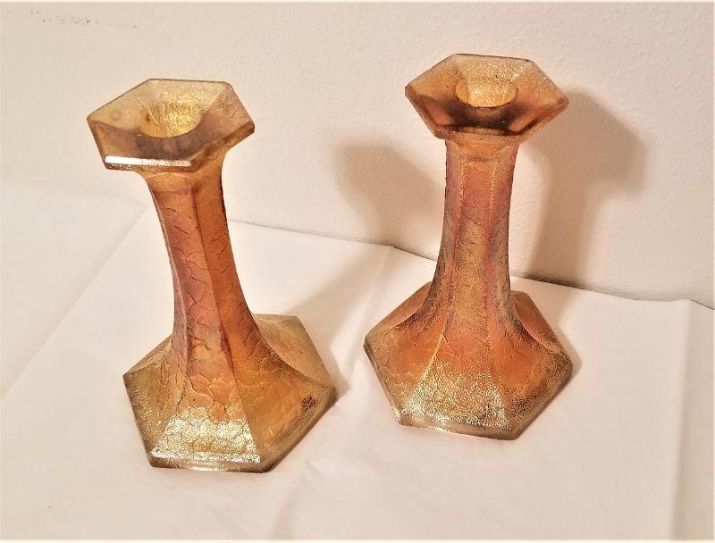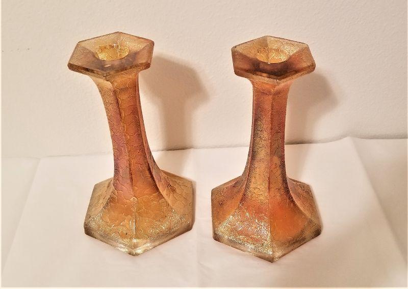 This pair of vintage Carnival Glass Candlesticks stands about 7.25" tall. Small losses around the holes the candles stand in.
