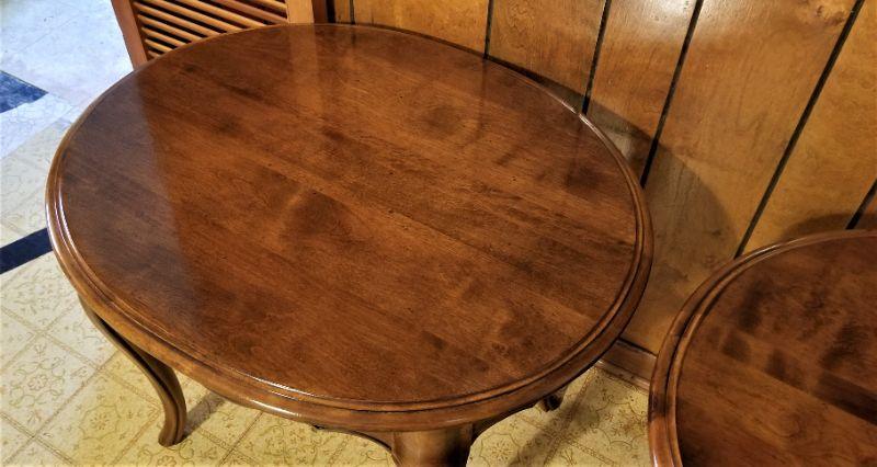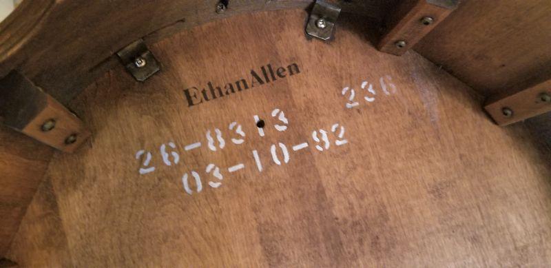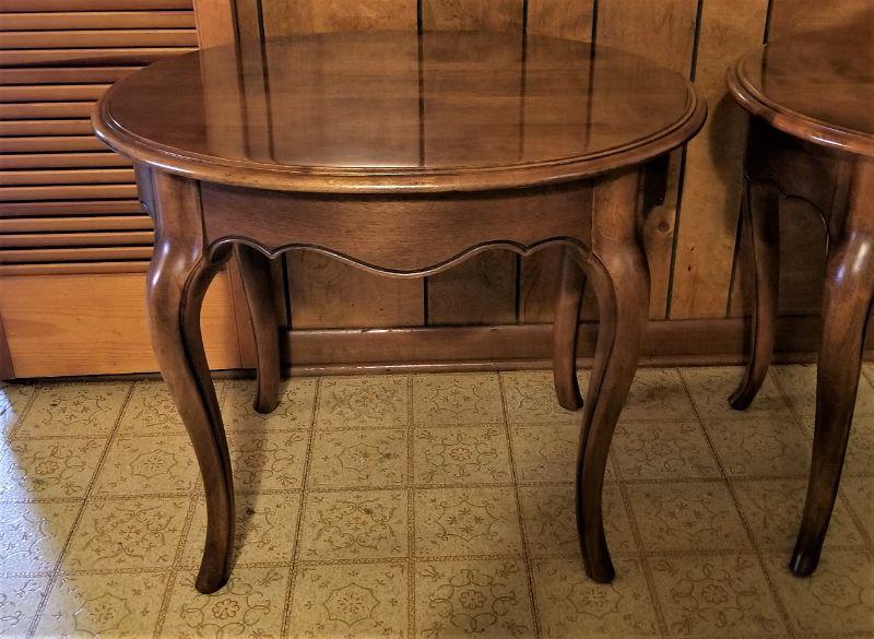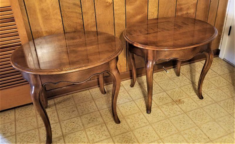 Nice pair of matching Ethan Allen lamp tables - solid wood. Good condition. Each measures 28" x 23" x 23" tall. Curved legs. Sturdy and solid.