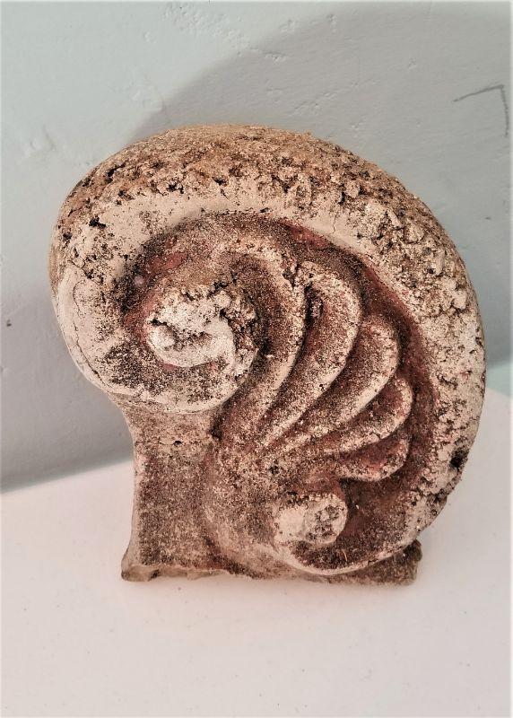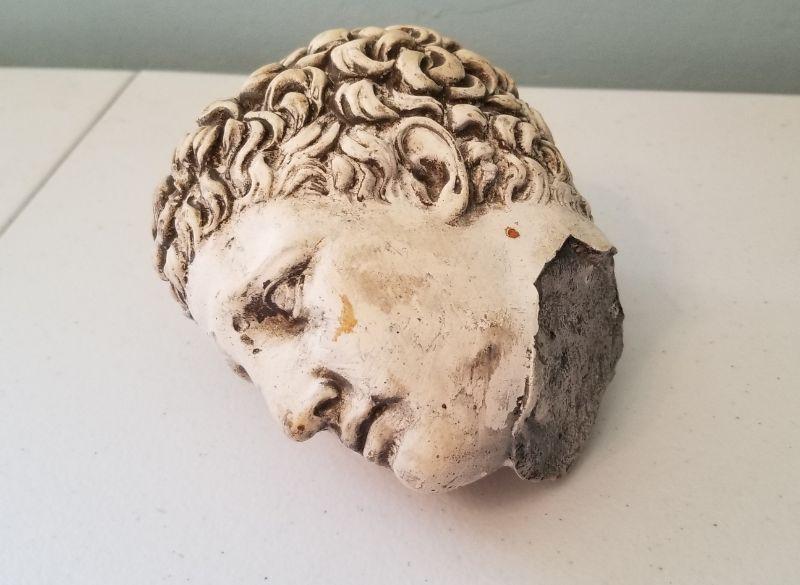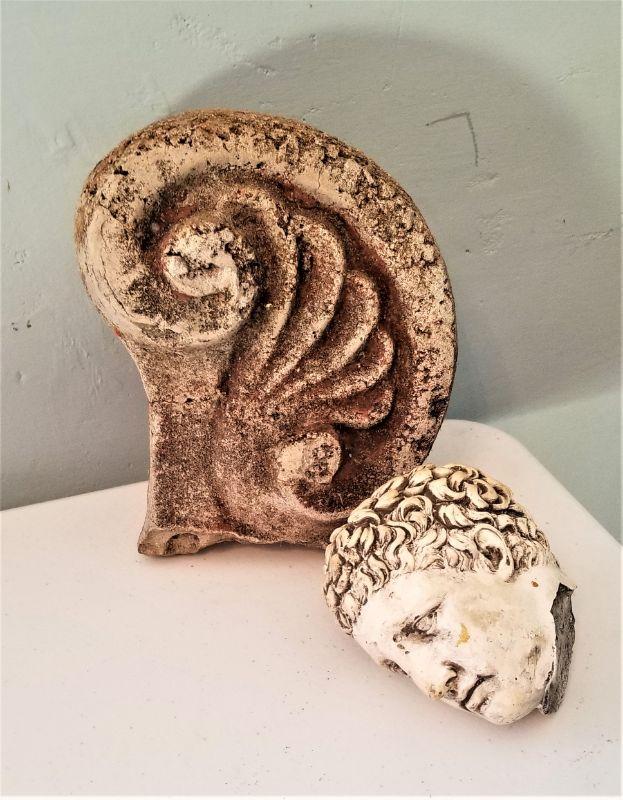 2 Garden accent pieces - antique concrete (heavy) cock's comb that originally sat on the roof (still shows traces of the original red paint), and a contemporary "broken" head in the classic style (new). Cock's Comb is 9" tall - head 5".