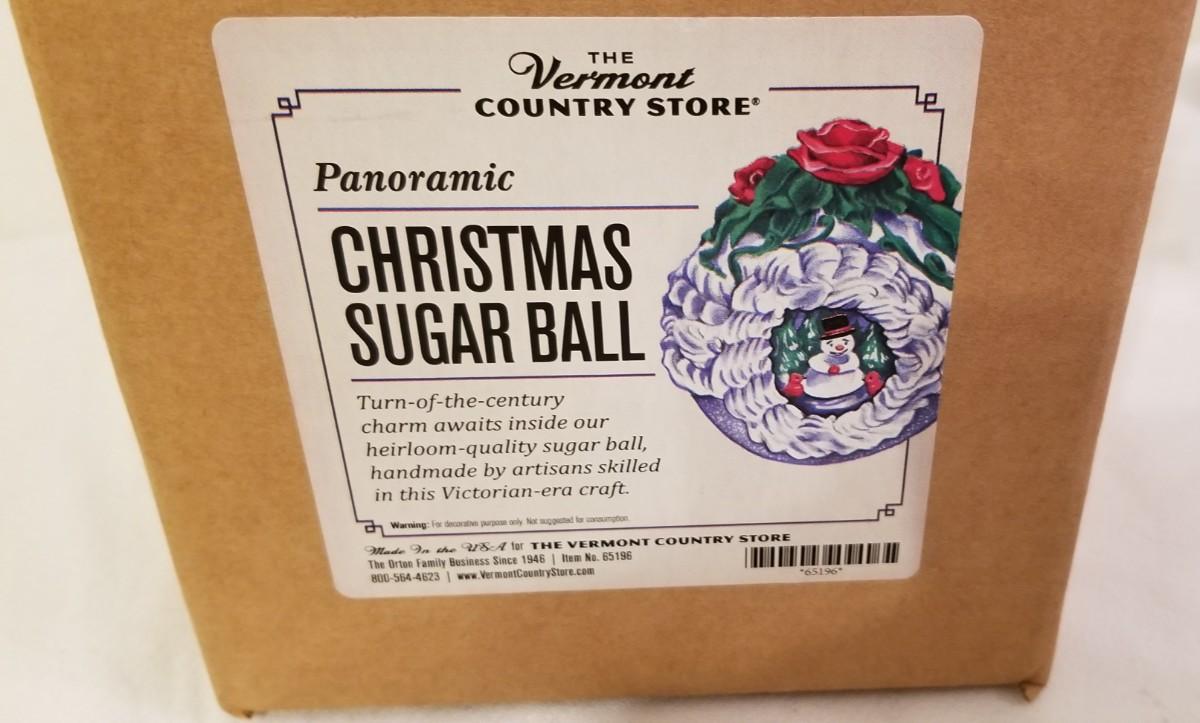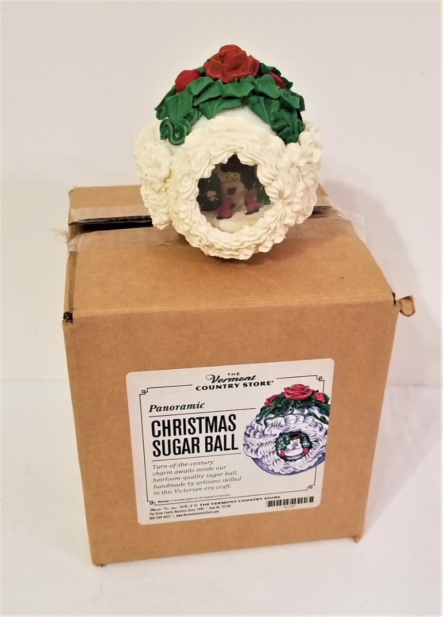 From the Vermont Country Store - a panoramic Sugar Christmas ball, done in the Victorian Style. You usually see these for EASTER, so a Christmas one is a bit unusual. This was new in the unopened box - we had to open to make sure there was no damage, etc. A cool decoration!