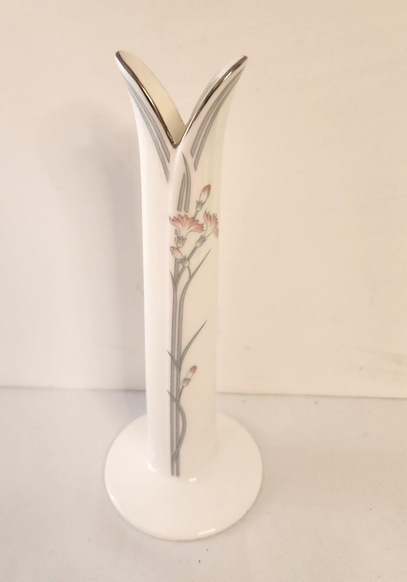 Pretty china bud vase in the "Carnation" pattern by Royal Doulton. 8" tall. Good condition.