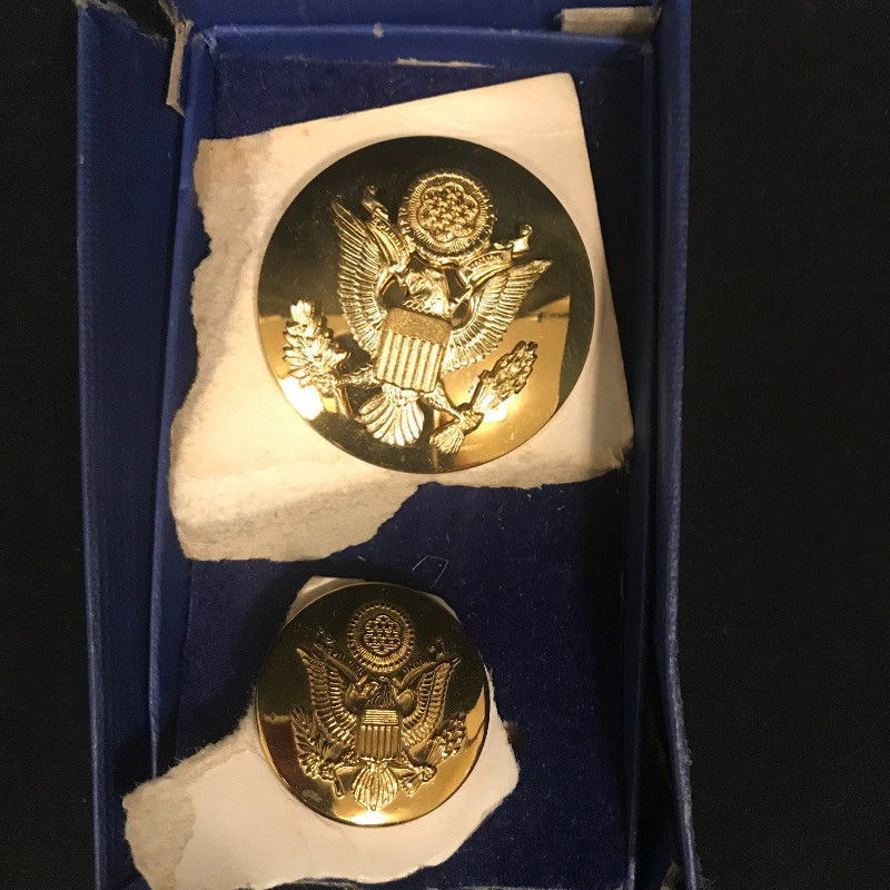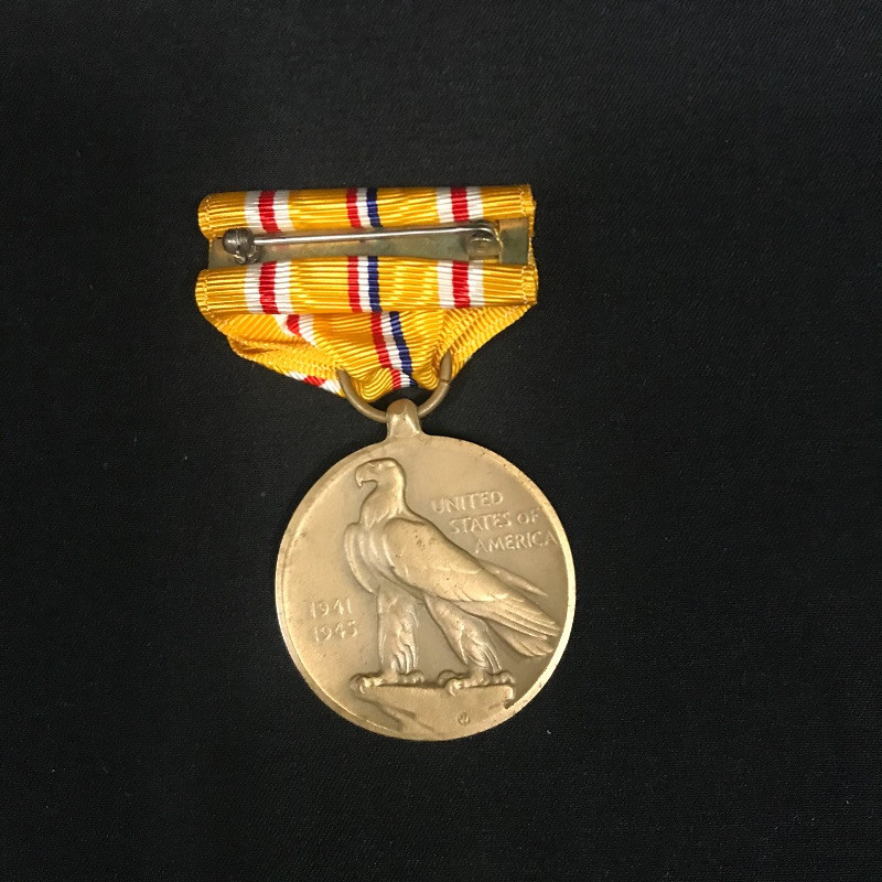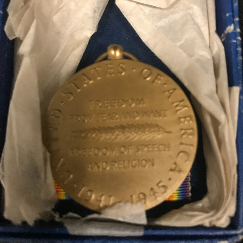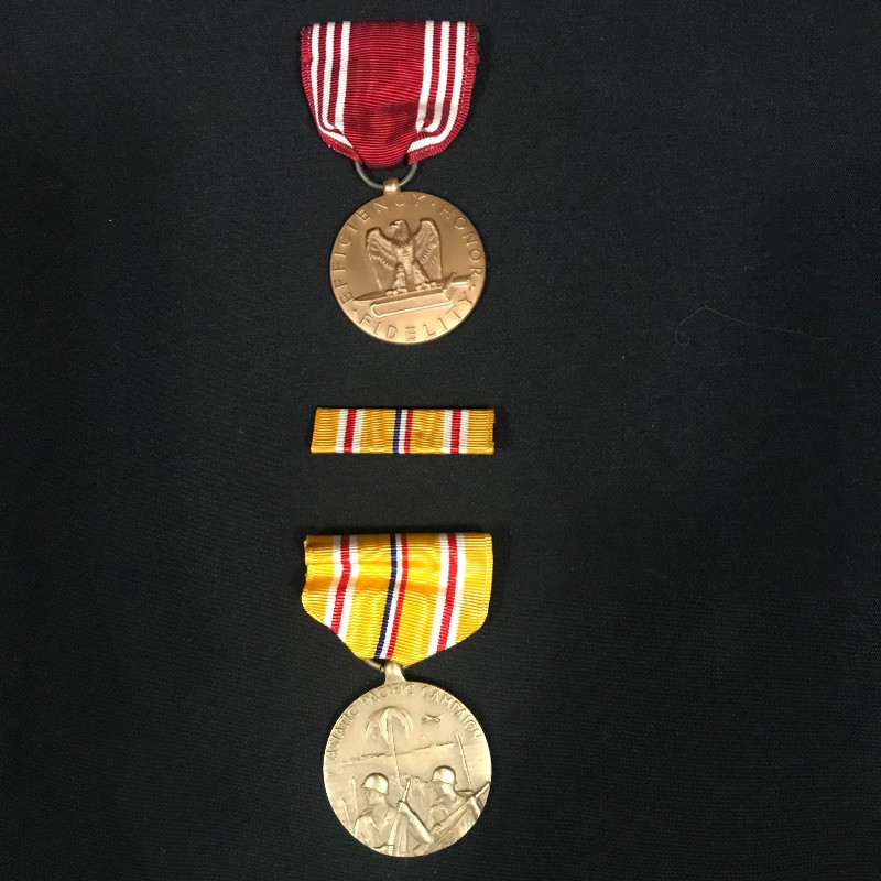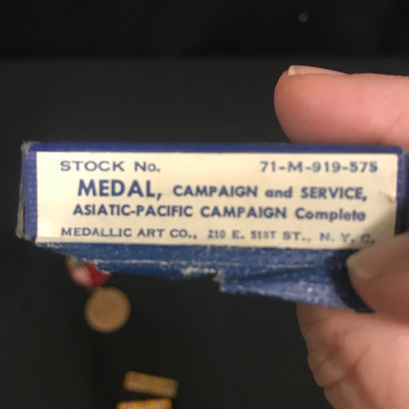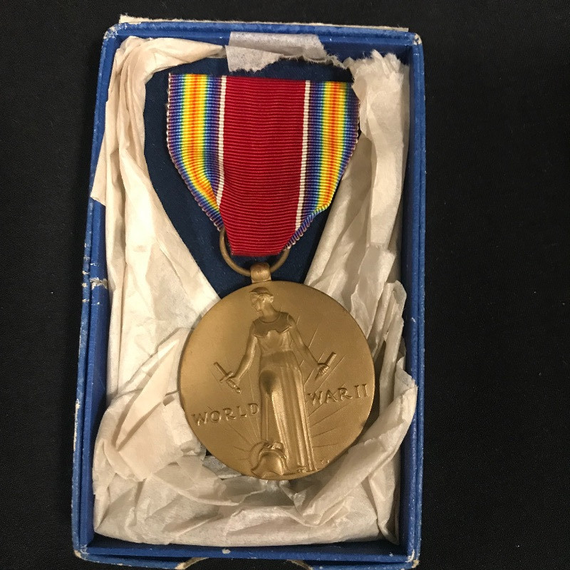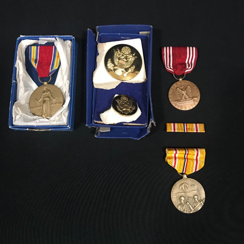 This super and very special collection of medals includes a Victory medal WW2, a decoration medal for Good Conduct and a Asiatic Pacific campaign medal. Lot also includes officer hat badges. Shipping available.