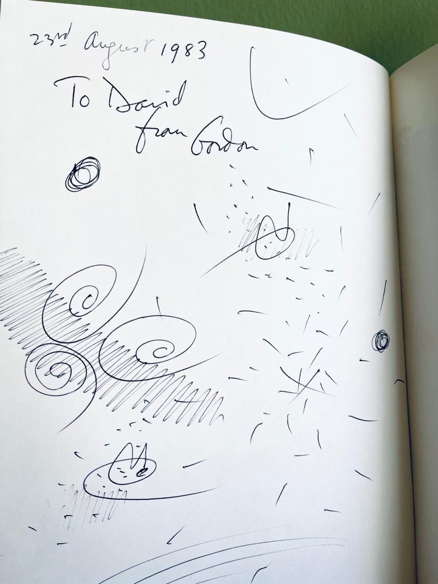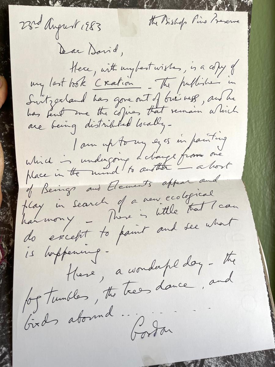 LOT 28 - Creation by Gordon Onslow Ford. The book includes a letter (taped to the book) to David by the author as well as a drawing and signature. This hardback book includes the original dust jacket and is in very good condition. Clean, crisp pages.