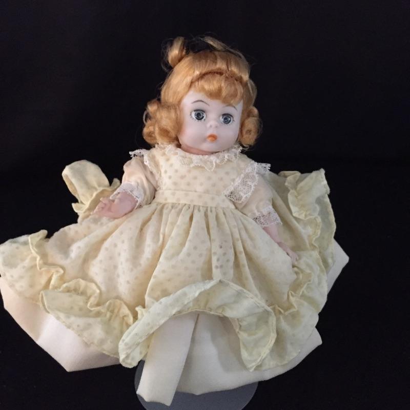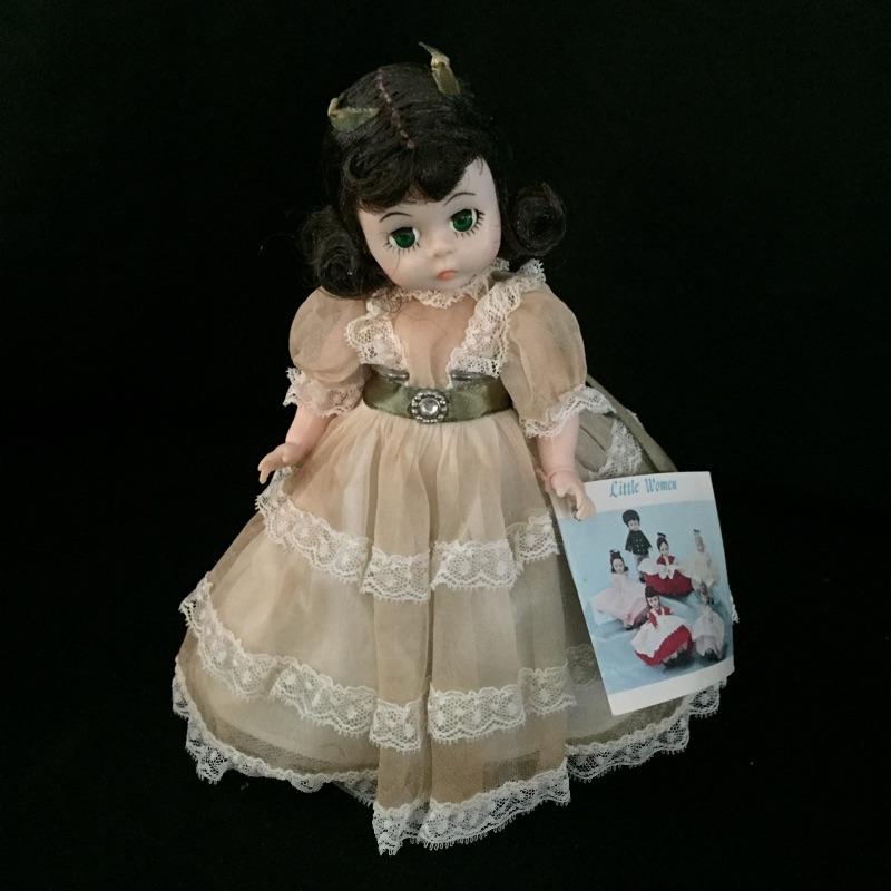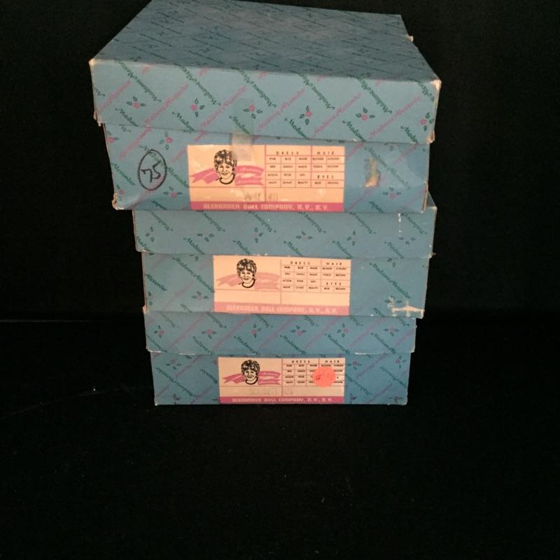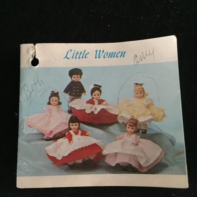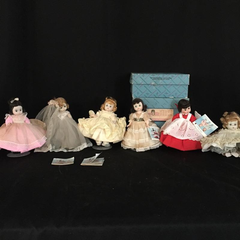Six Madame Alexander Dolls including Jo , Scarlett , Amy and Beth and three boxes. Seventh doll the head is not attached. Dolls measure 7.5” tall.