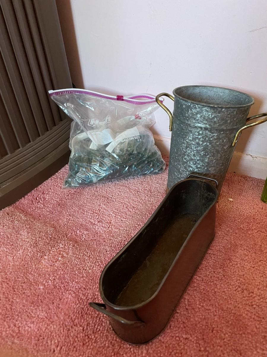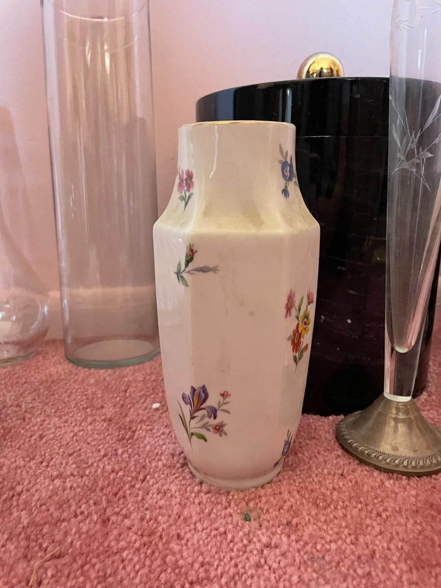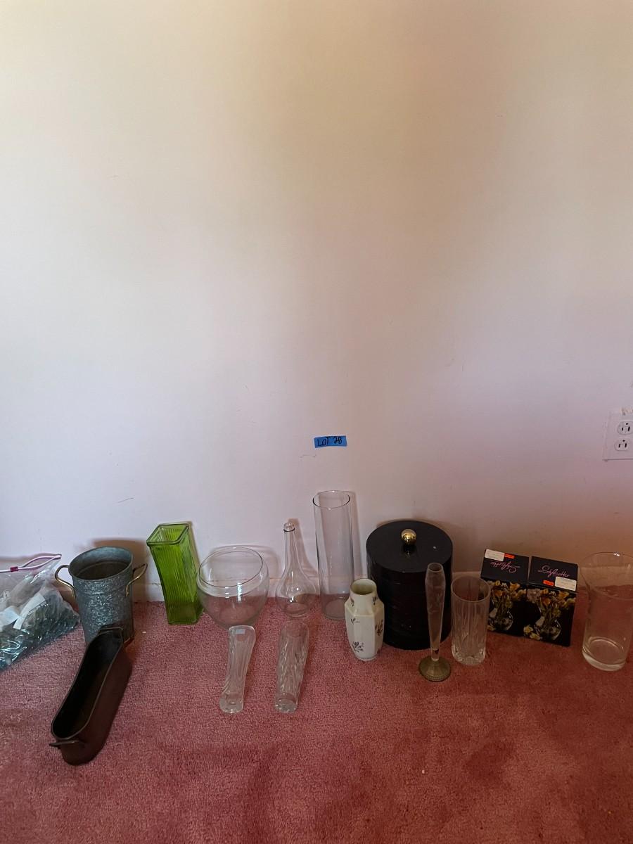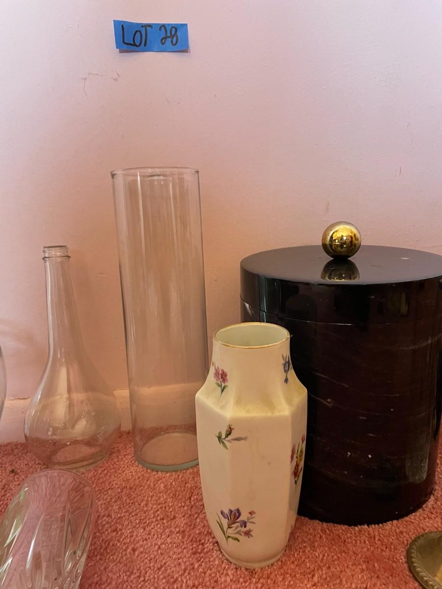 lot 28- sterling silver base crystal vase,(4) crystal vases, (2) style setter vases, (4) glass vases, (2) baskets, limoges vase, ice bucket, bag of decorative gems