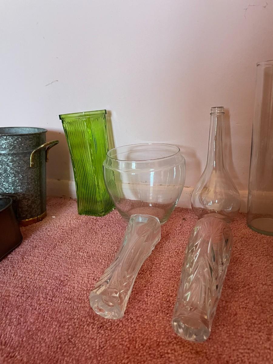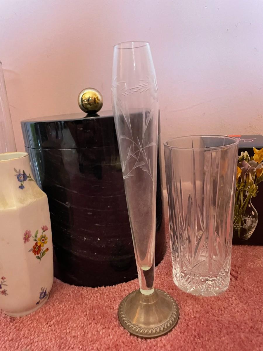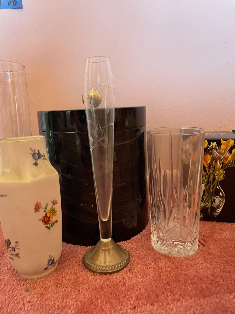 (4) crystal vases, (2) style setter vases, (4) glass vases, (2) baskets, limoges vase, ice bucket, bag of decorative gems, sterling silver base crystal vase.