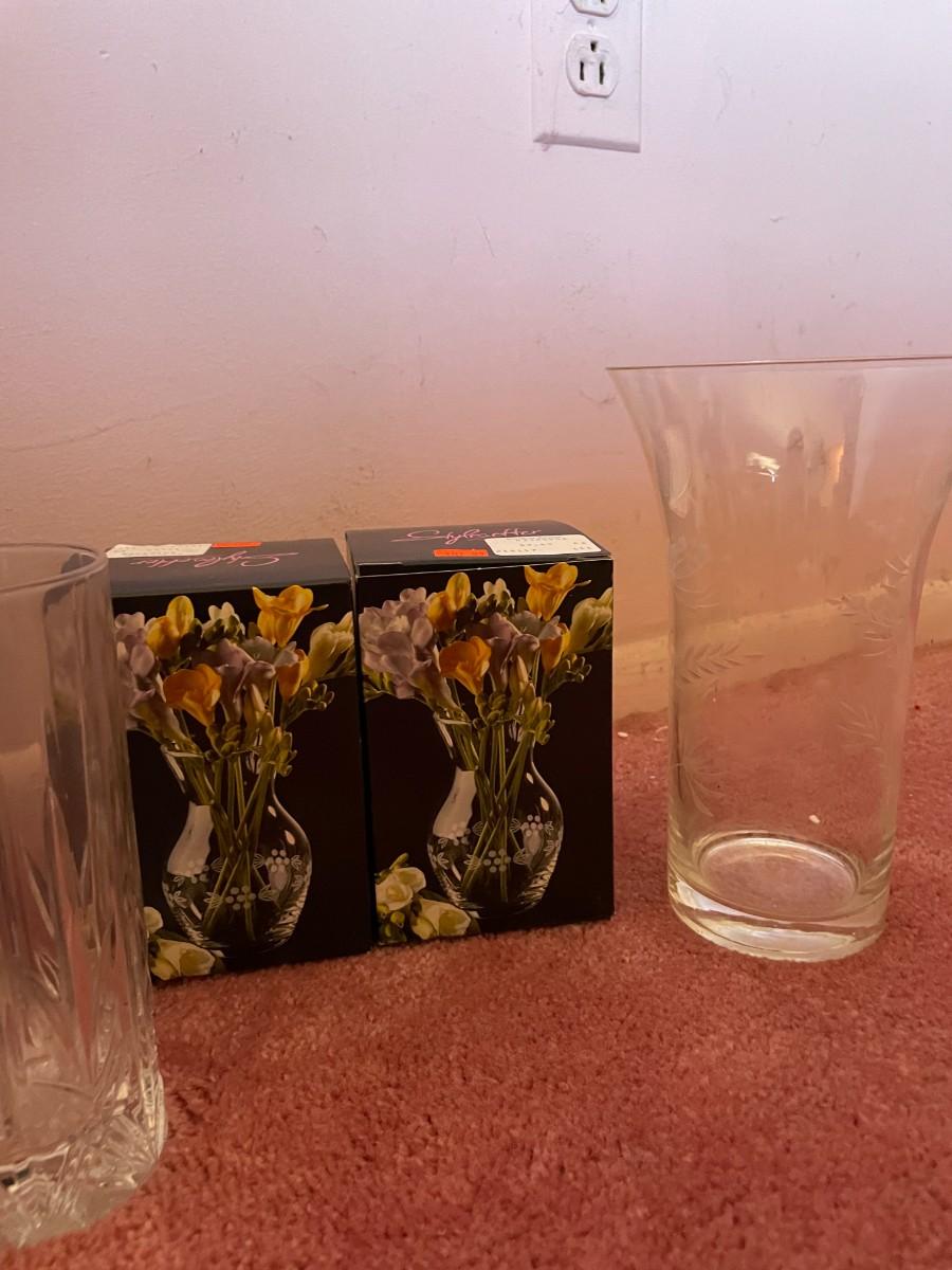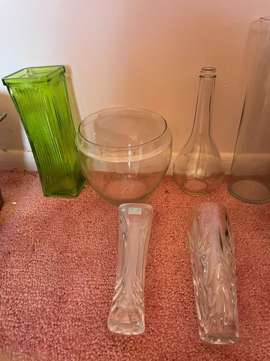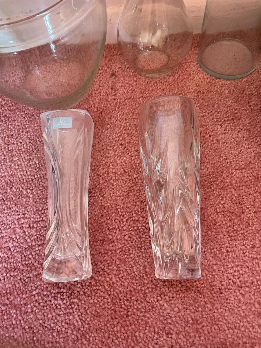 (4) crystal vases, (2) style setter vases, (4) glass vases, (2) baskets, limoges vase, ice bucket, bag of decorative gems, sterling silver base crystal vase.