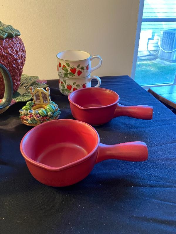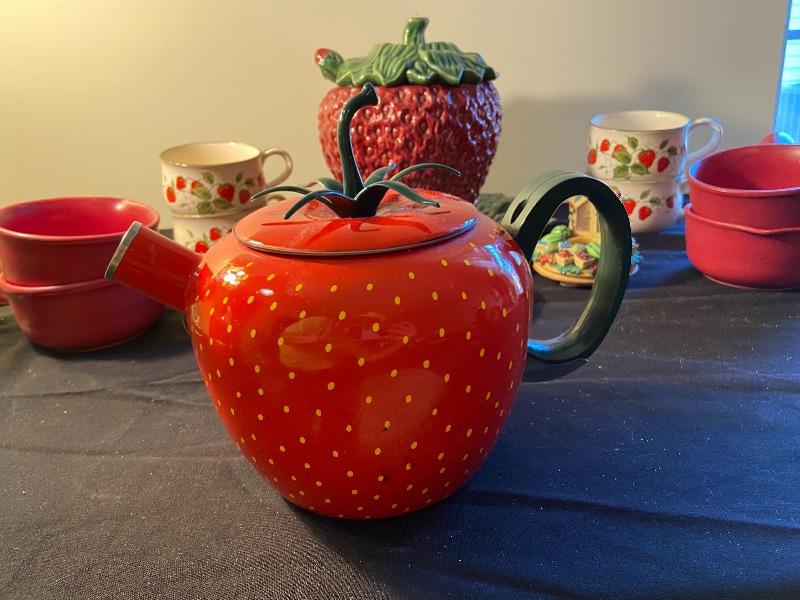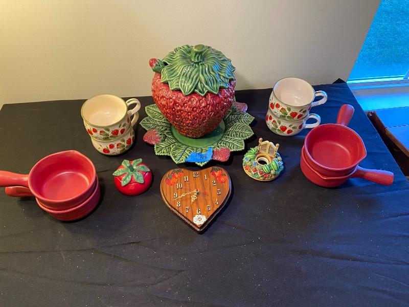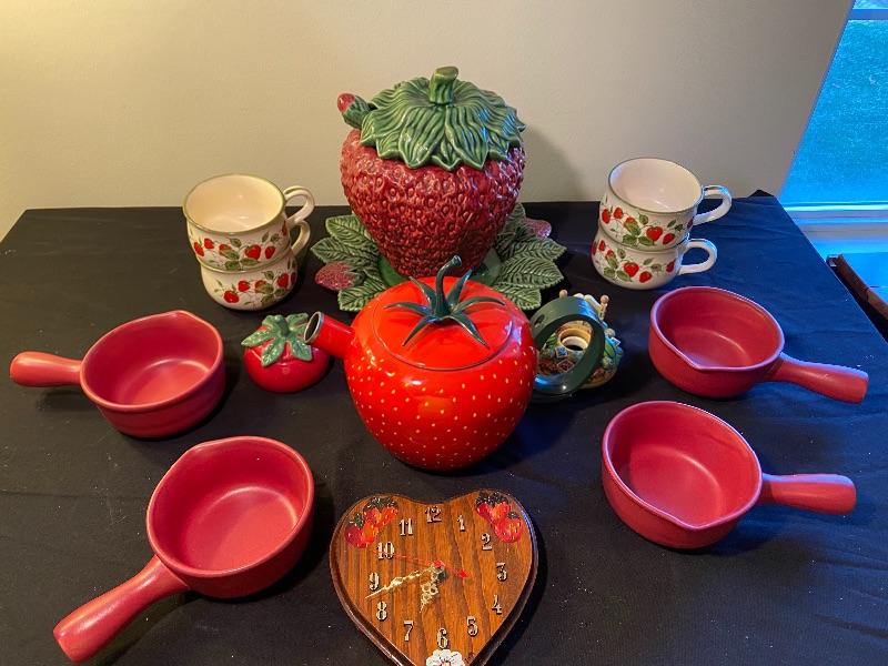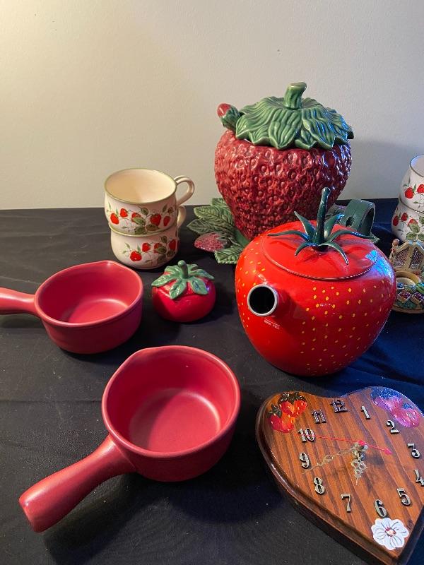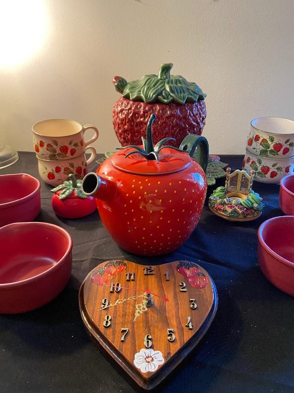 Strawberry soup terrain, crocks, clock, tea kettle and more
