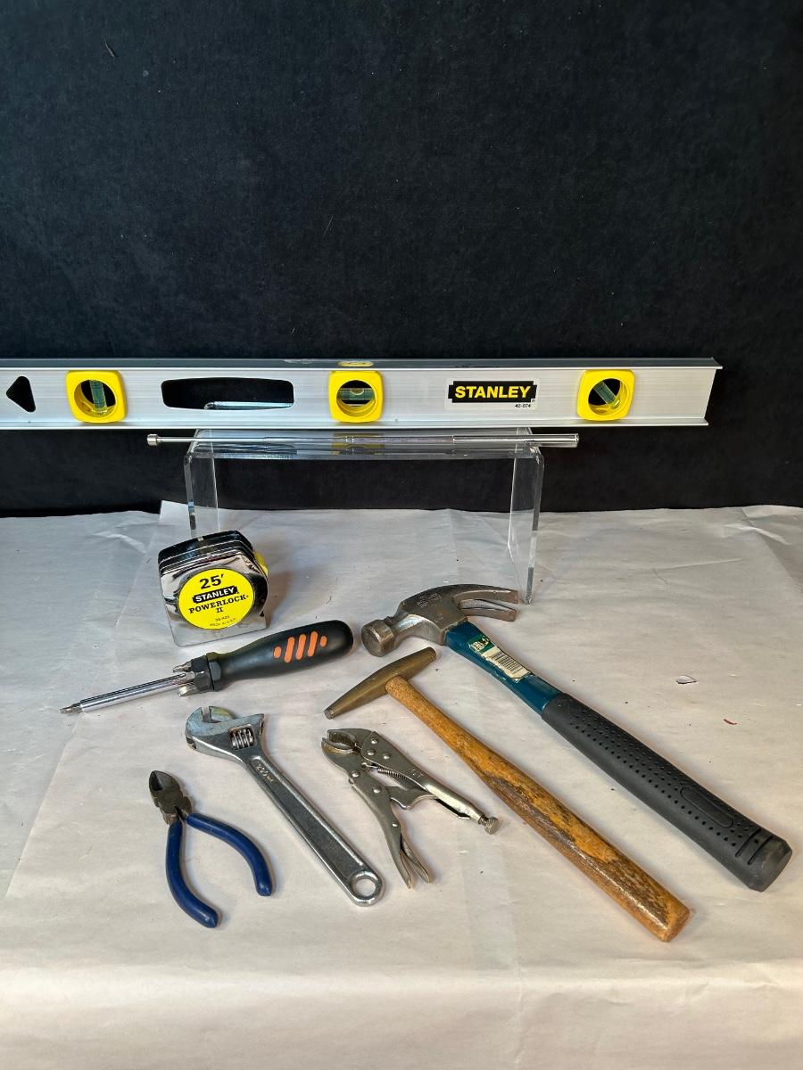 Includes Stanley Level and 25' tape measure, claw hammer, tack hammer, locking pliers, adjustable wrench and small pliers and combo screwdriver