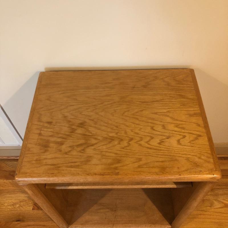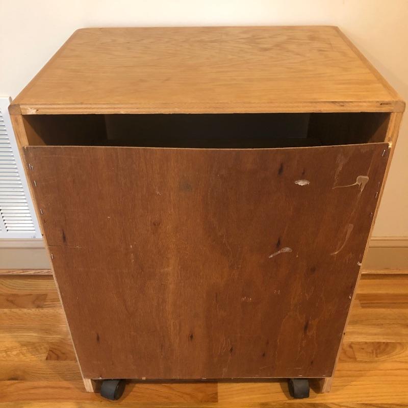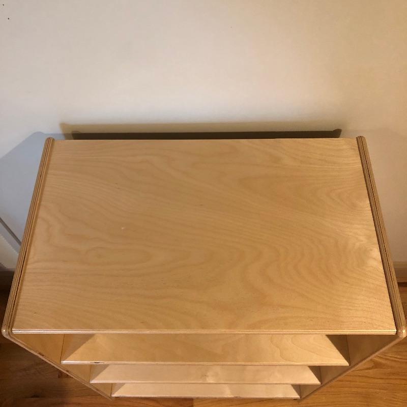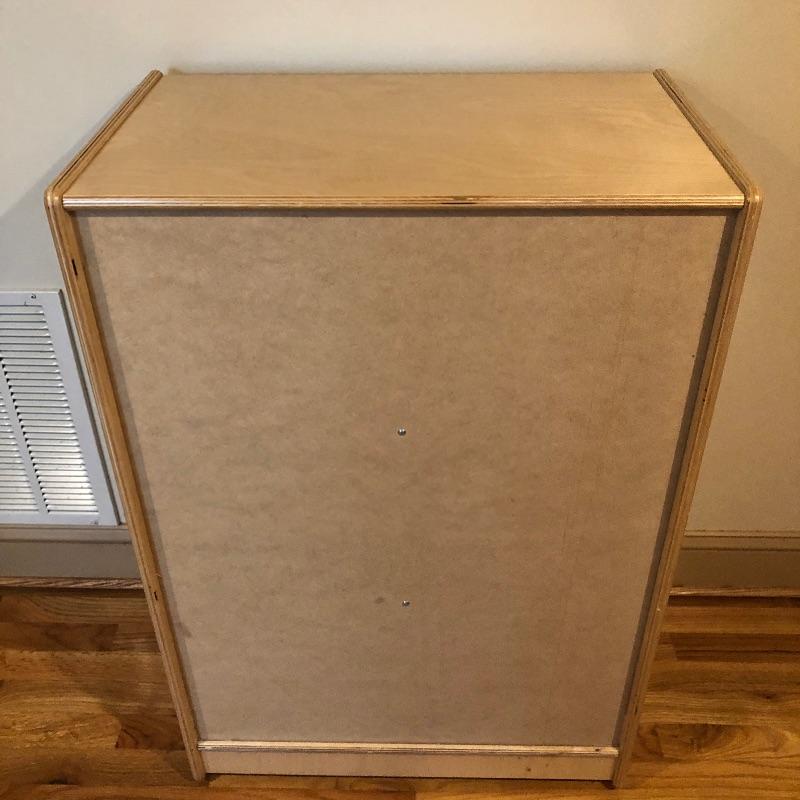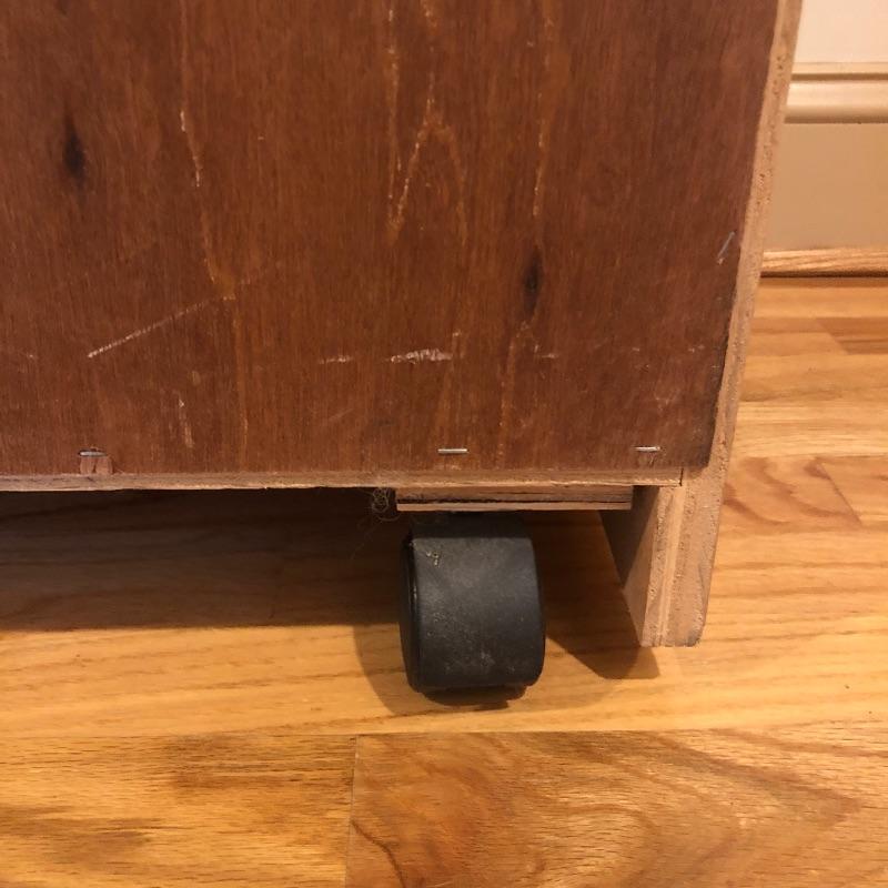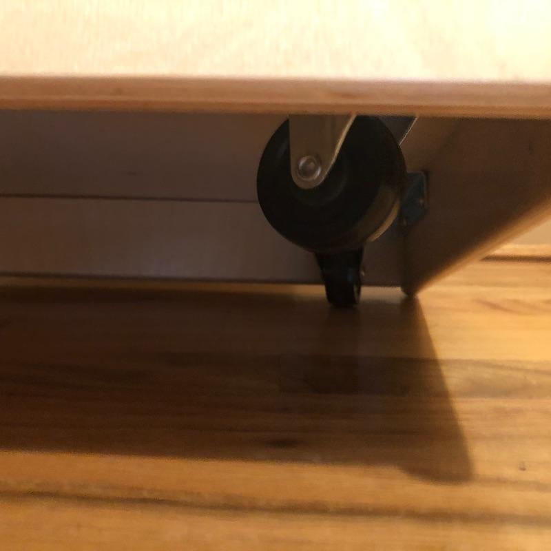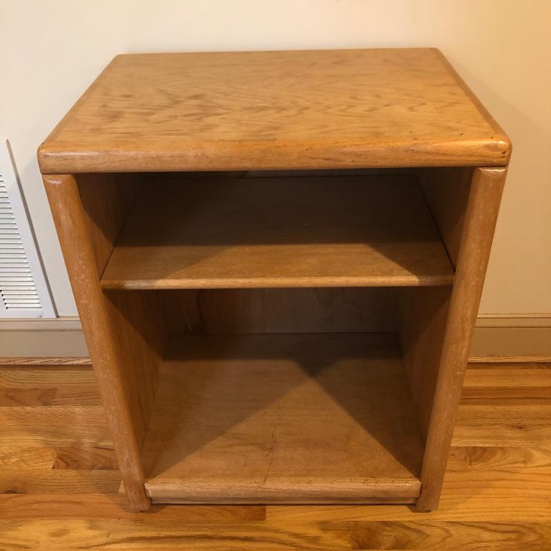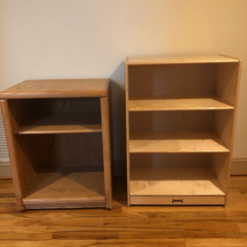 This lot includes 2 shelves that feature wheels for easy transport. These shelves are perfect for any type of storage or display. Smaller shelf can be used with electronics, it has space to hide cords and measures 23”W x 16.5”D x 29.5”H. Local pickup only.