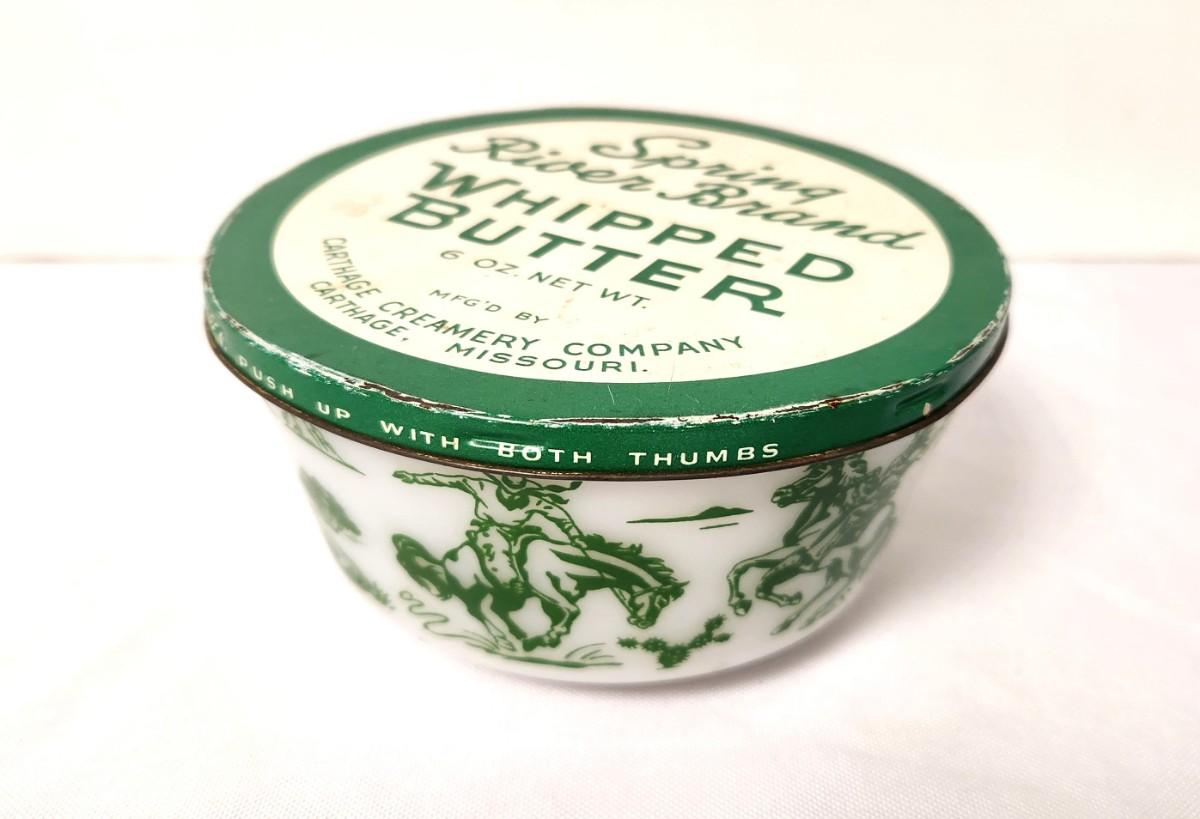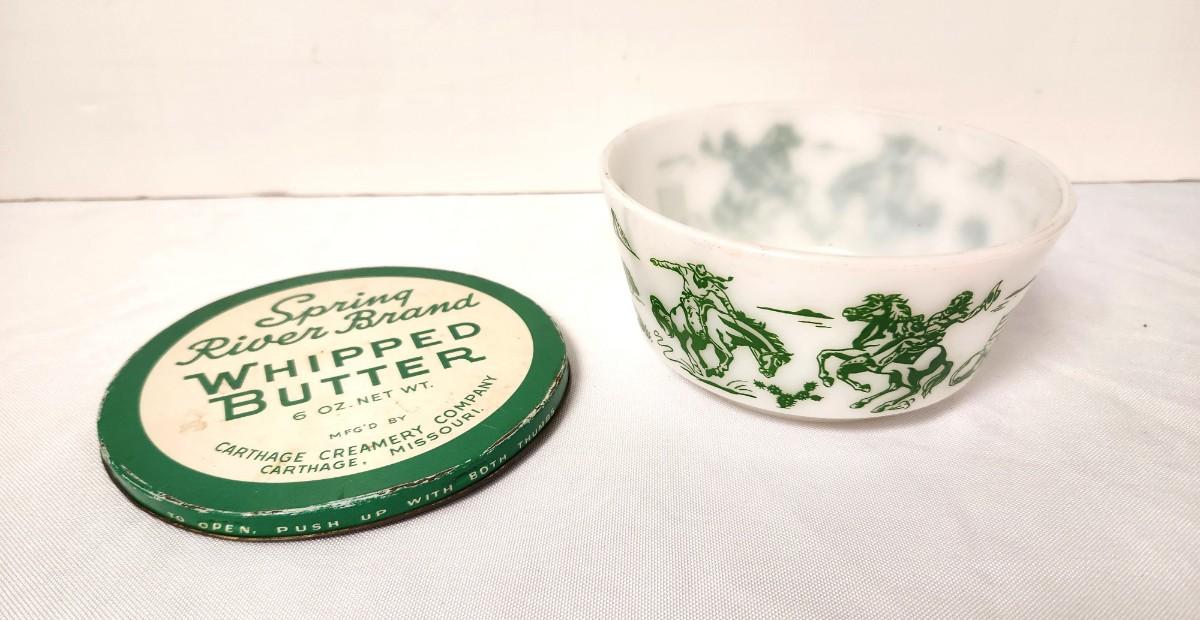 I have NEVER found one of these with the original lid! 1950's Spring River butter premium produced by Anchor Hocking - Wild West cereal bowl for the kiddies! Minty! 2.5" tall, 5" across. SCARCE.