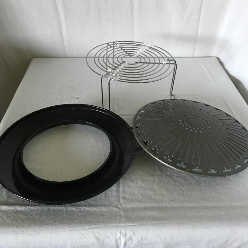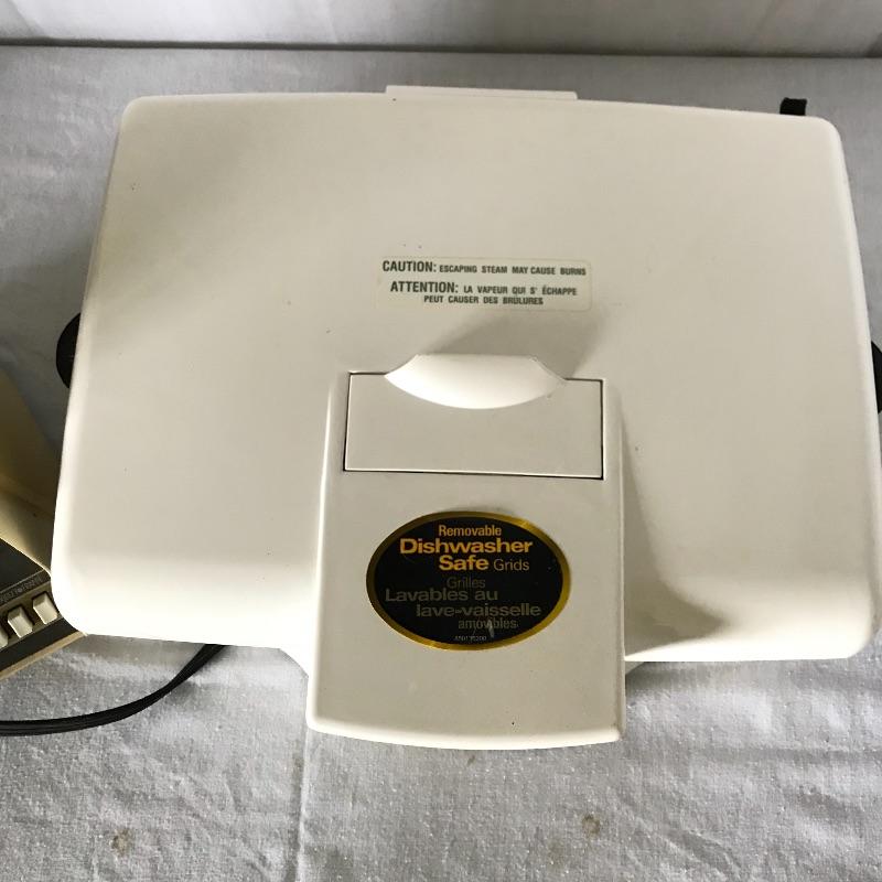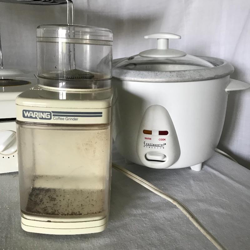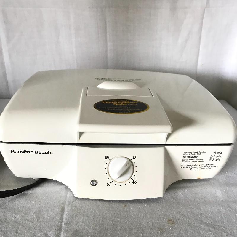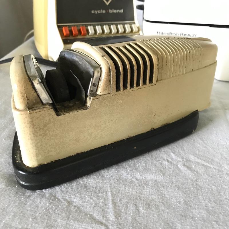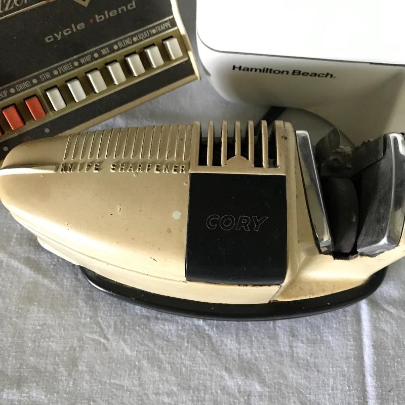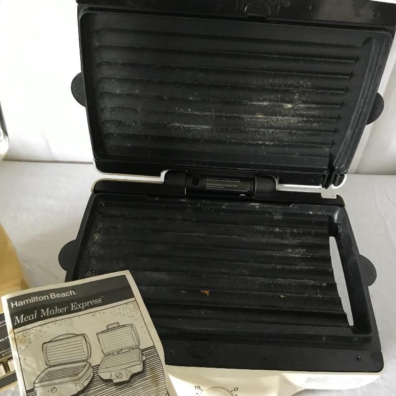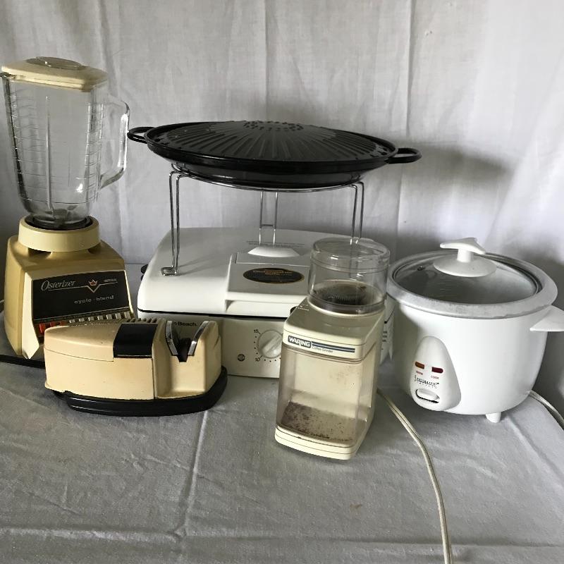 Add some ease to your cooking with some extra help from this lot. All turned on when plugged in. Vintage Imperial with glass blender by Oster and Cory knife sharpener. A Continental electric slow cooker, Waring coffee grinder and a Hamilton Beach electric grill. Lastly, a Burton grill non-slip accessory with drip catching ring, shown with a metal display stand. See photos. Local Pickup Only.