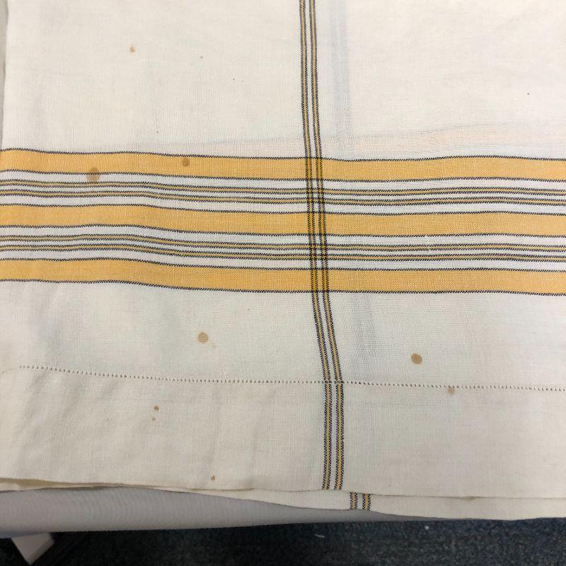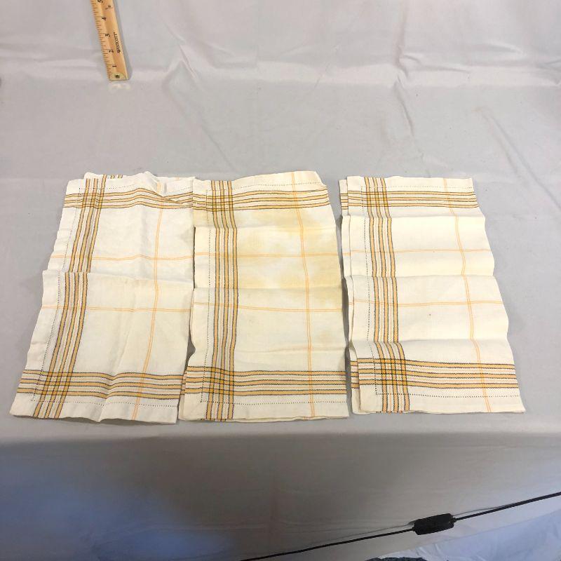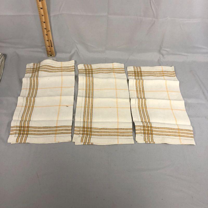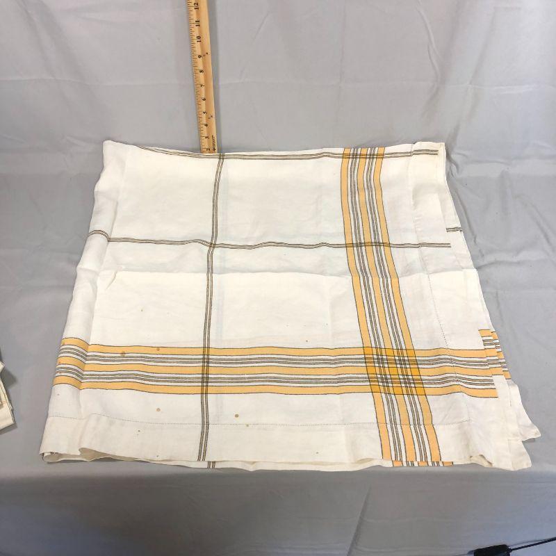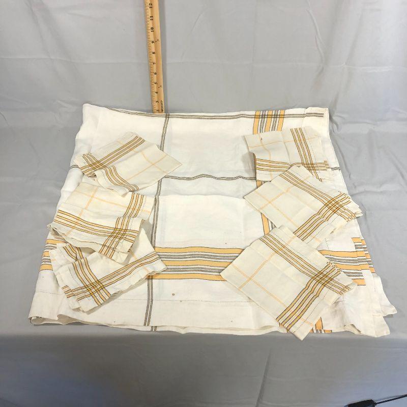 The tablecloth measures about 51" x 49" and there are a couple of stains in one corner. One of the napkins has some staining that looks like grease/oil, but the other five are in good condition. I did not find any holes or tears in any of the pieces.