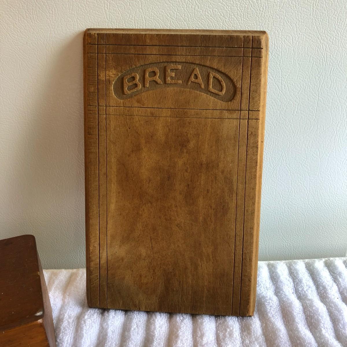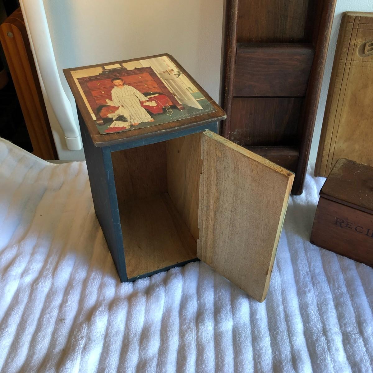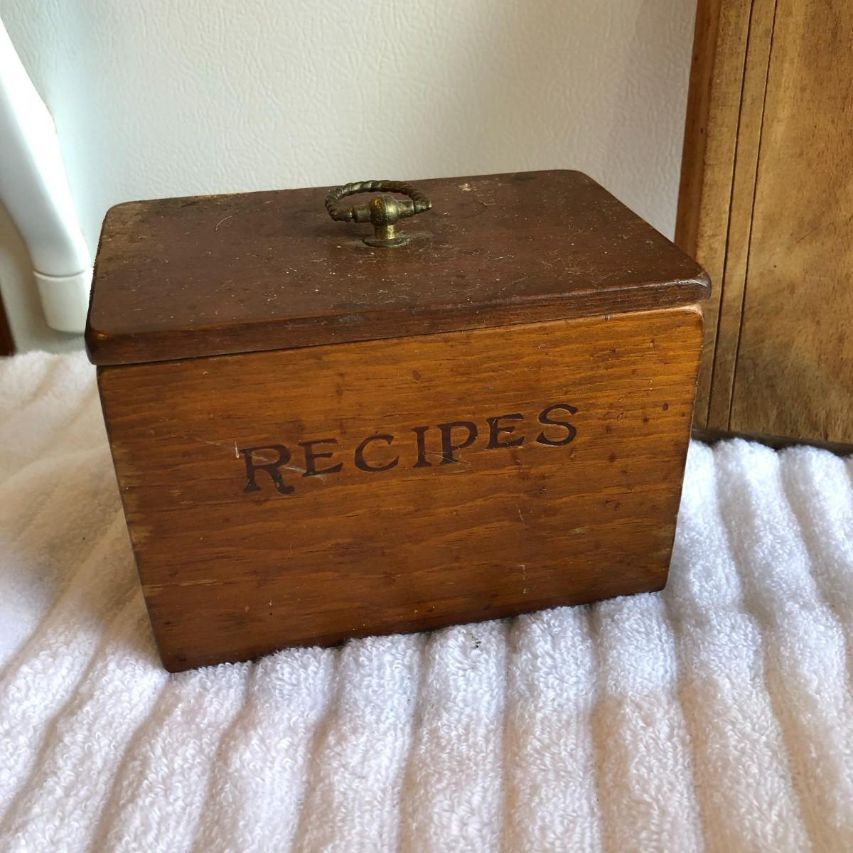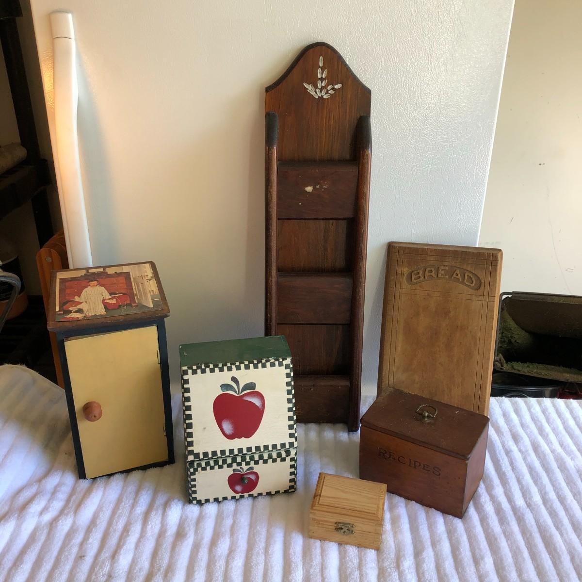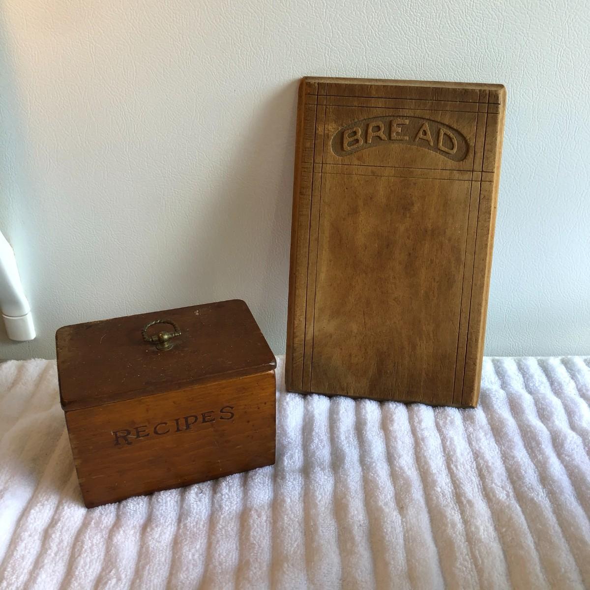 Check out the beautiful vintage bread cutting board and the vintage wood recipe box.