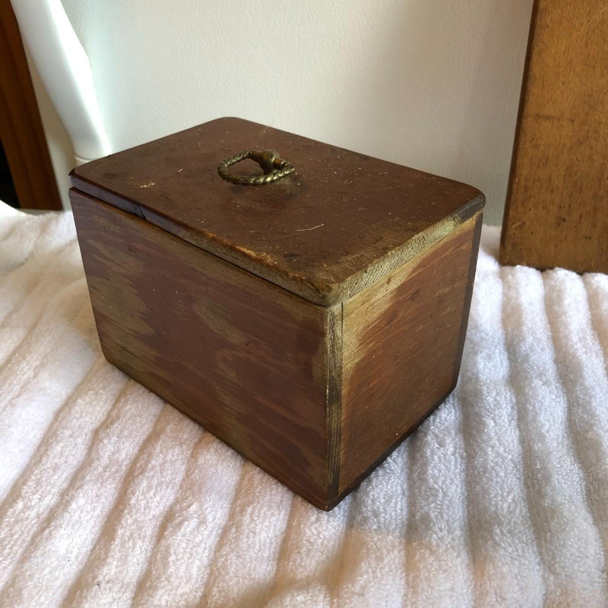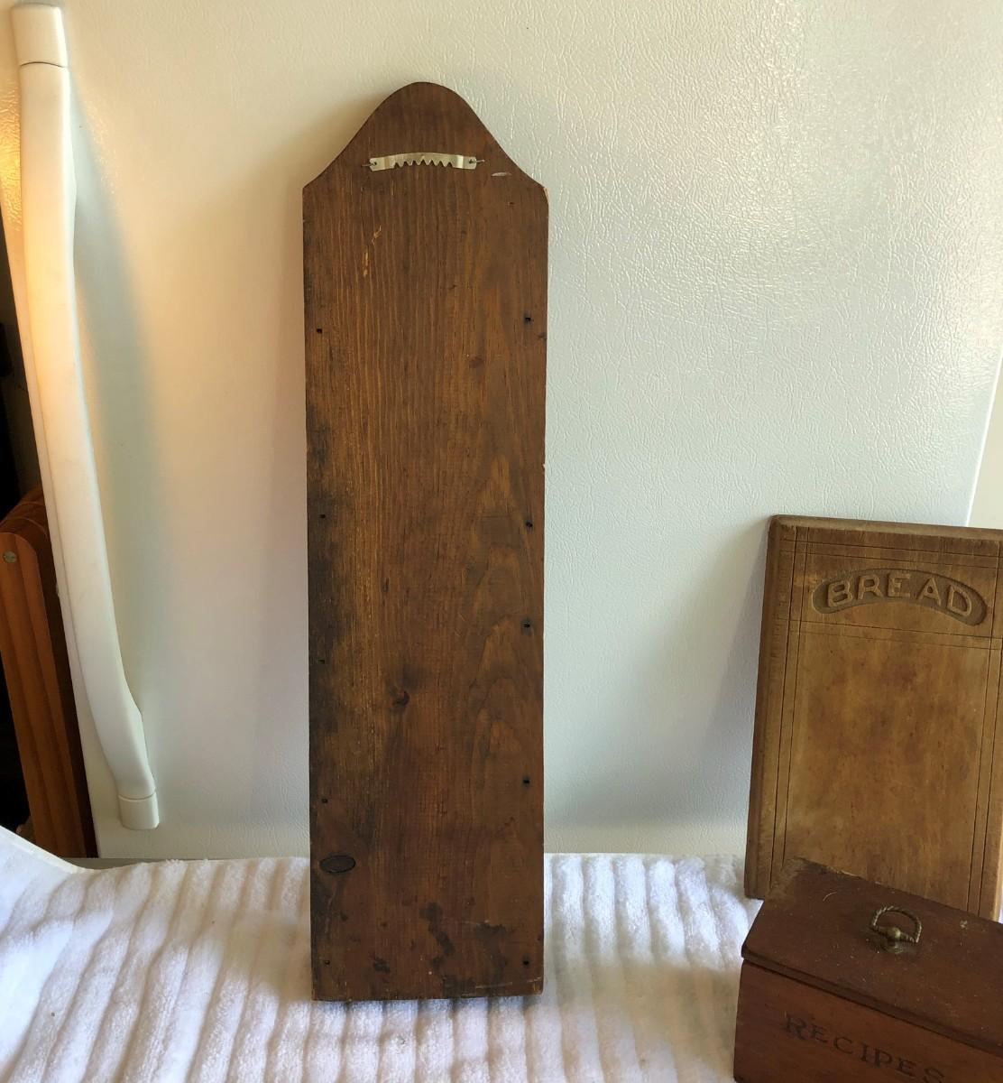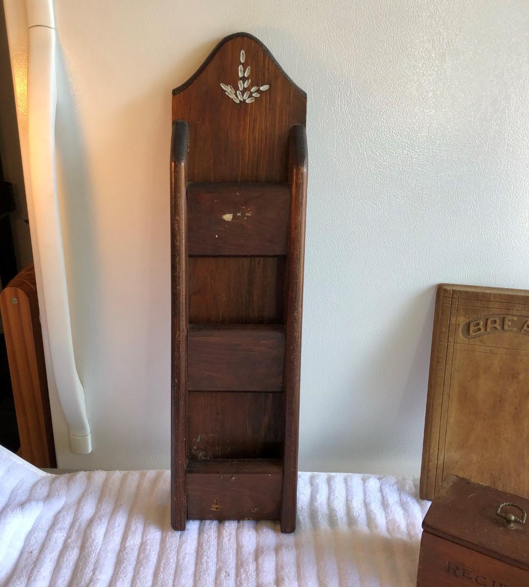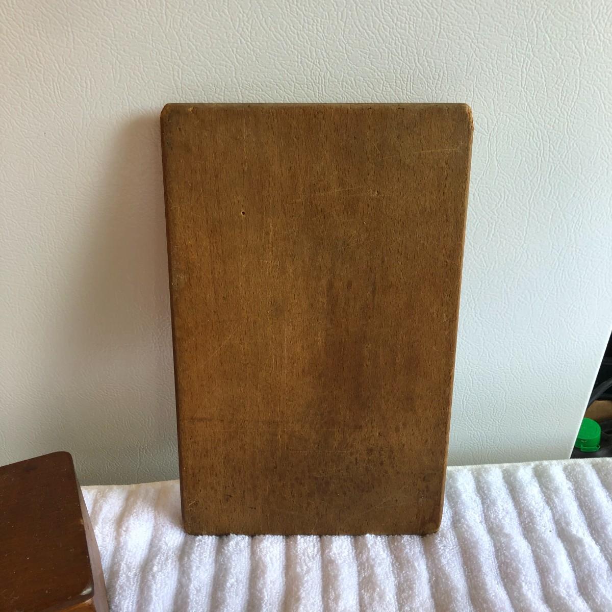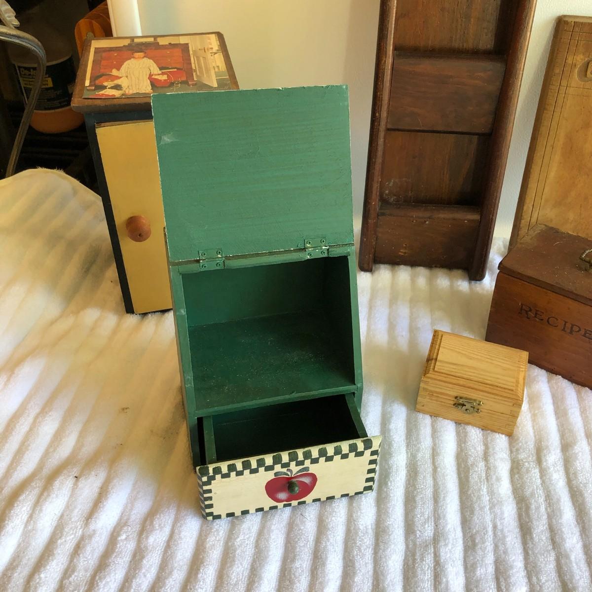 Check out the beautiful vintage bread cutting board and the vintage wood recipe box.