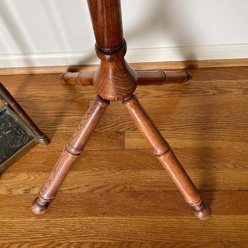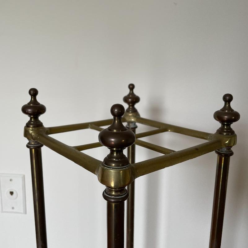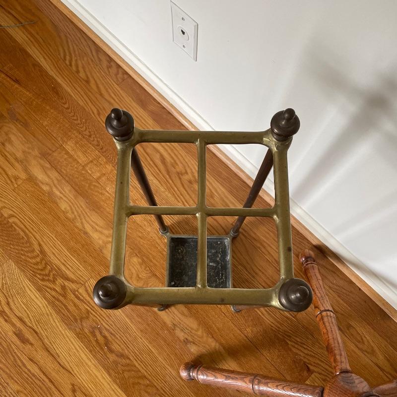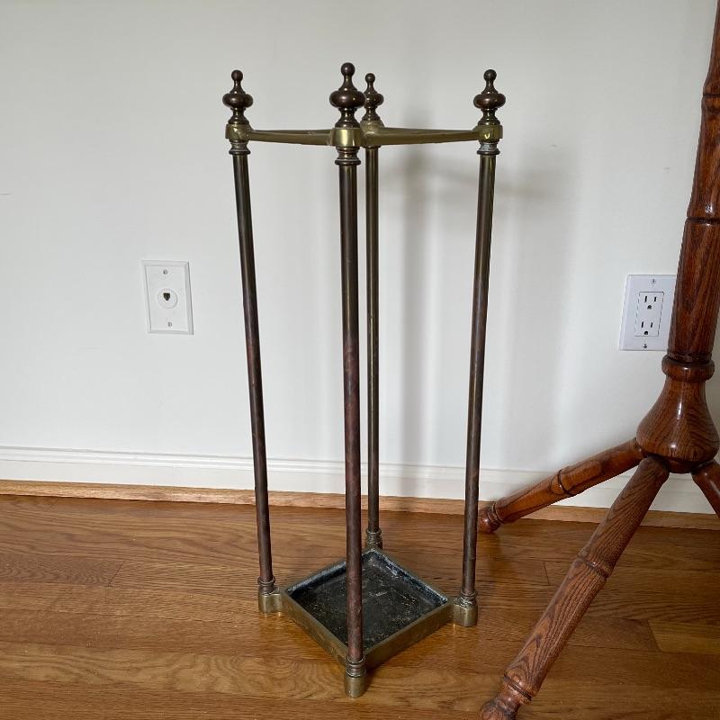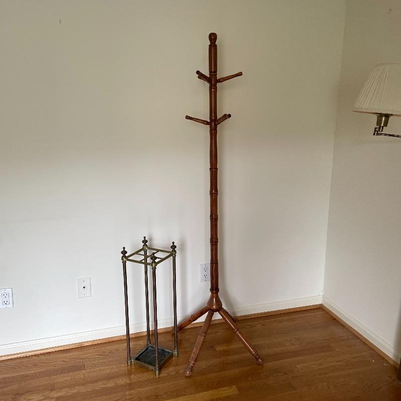 Here’s a useful lot with charm and beauty! Lot features a metal rack (likely brass and bronze) perfect for canes or umbrellas with the top cross bars having four compartments. Piece measures approximately 8”sq x 26”, it is completely Metal and substantial weight for its size. We’ve paired this with a 5 1/2 foot tall wooden coat rack. This appears to be quality made, something you’ll be able to pass down. With six hooks for your coats and hats, it’s super useful any time of the year! See photos. Local pick up only.