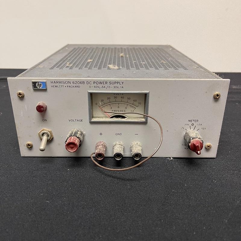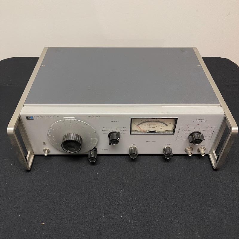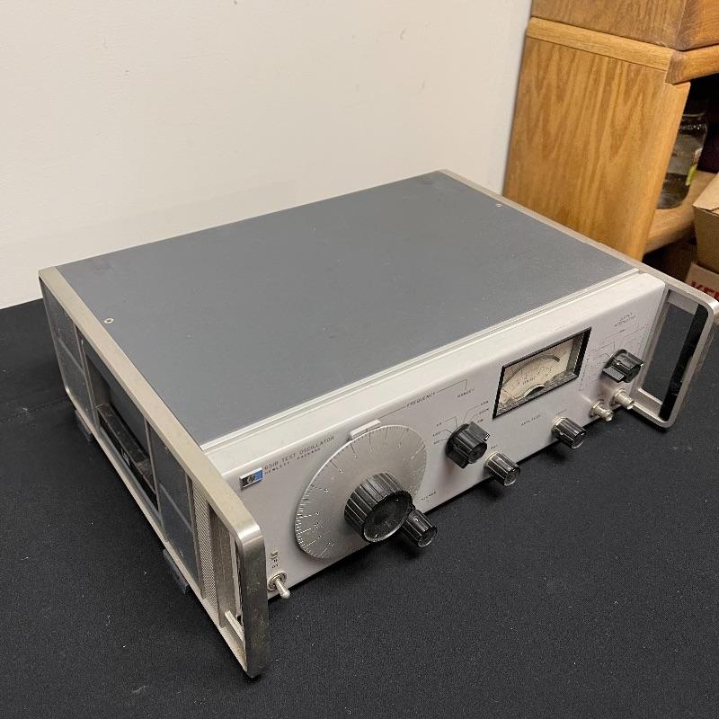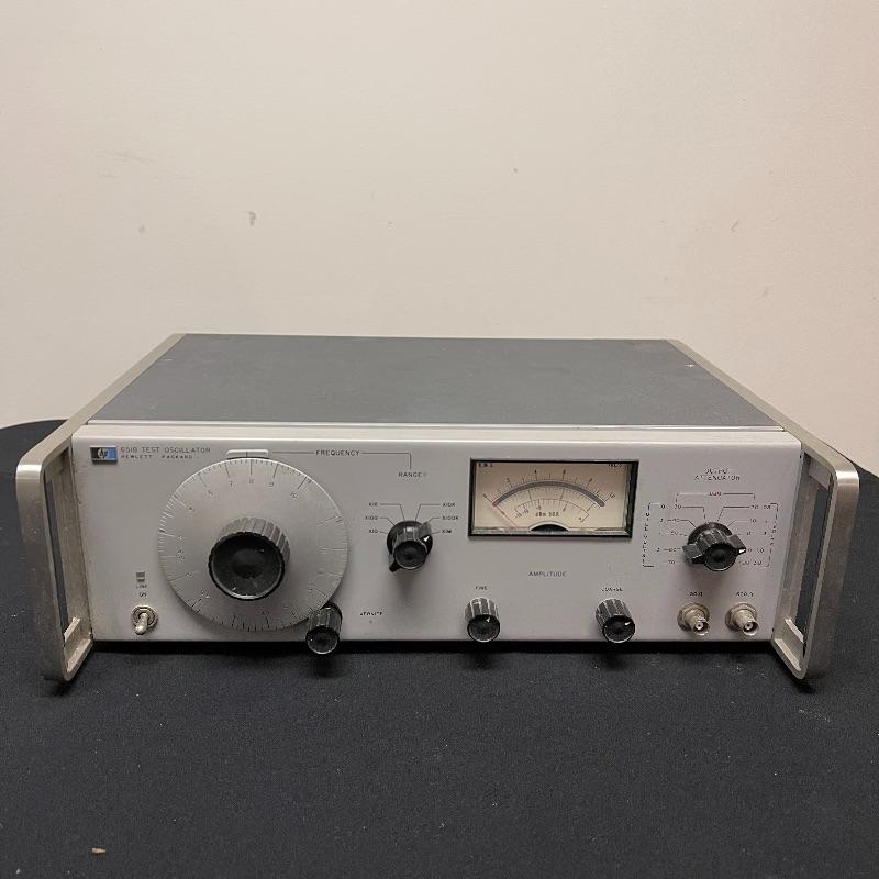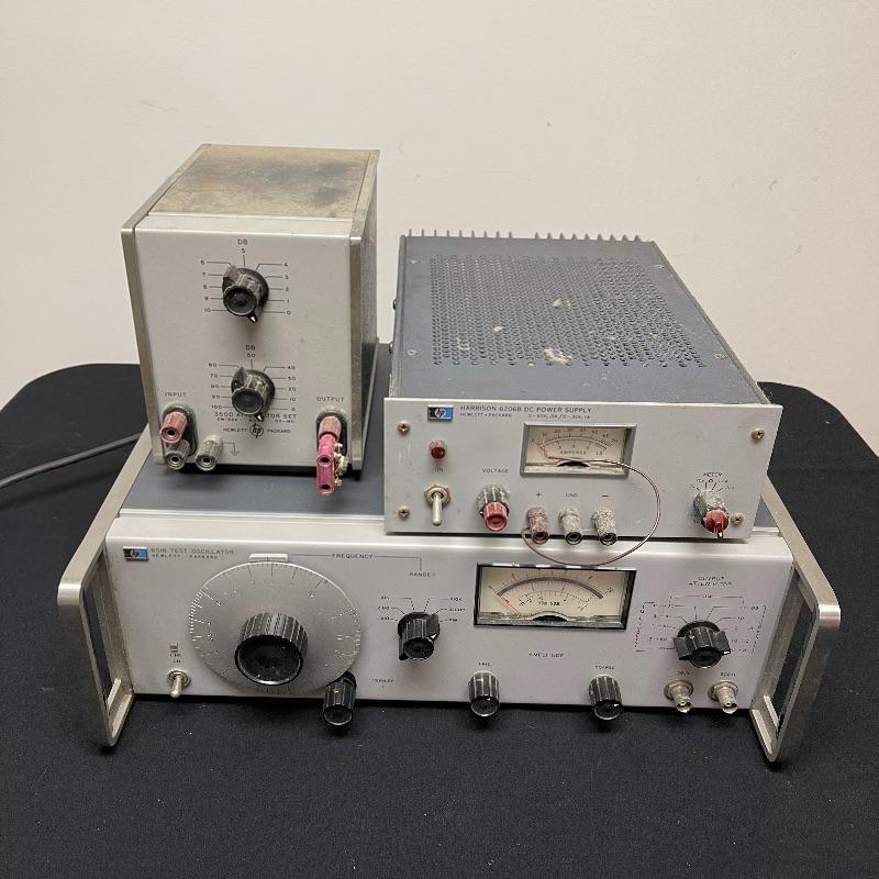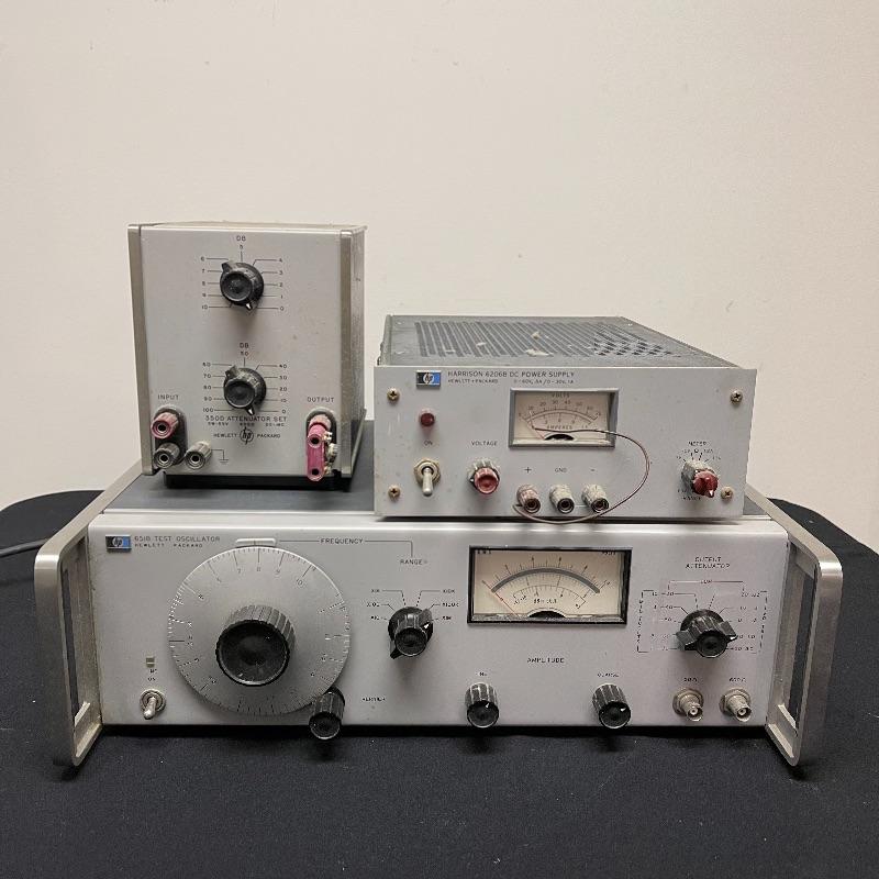 HP 651B test oscillator, HP 6206B power supply, HP small box with the numbers 220-02804 on the back, and spare power chords.
