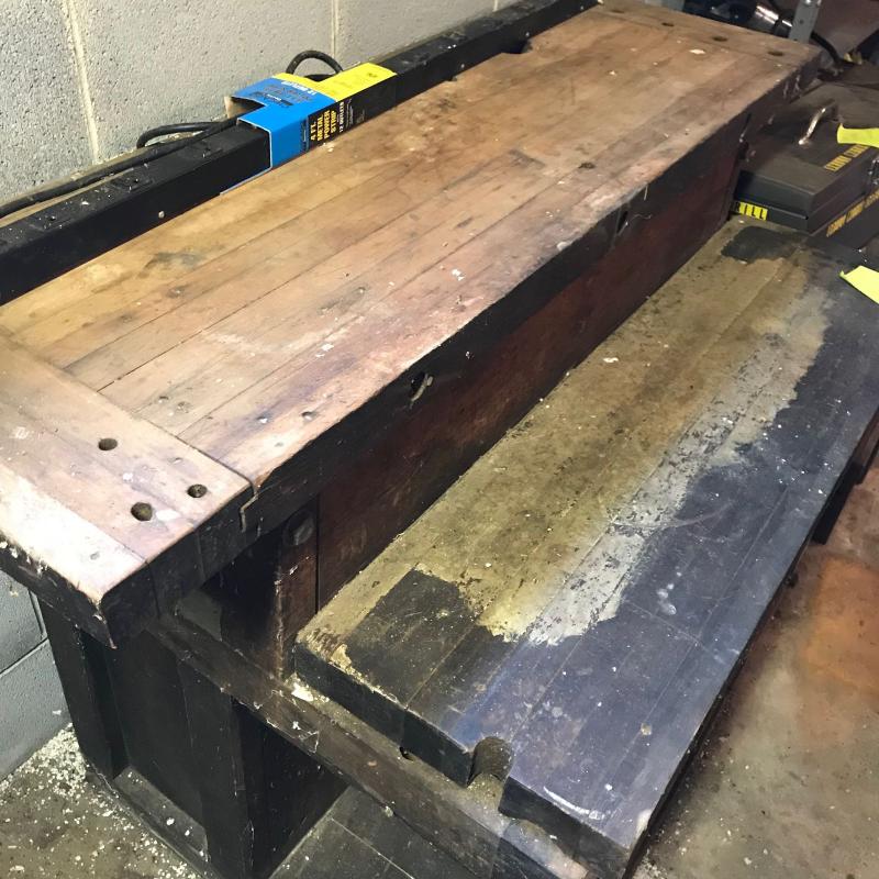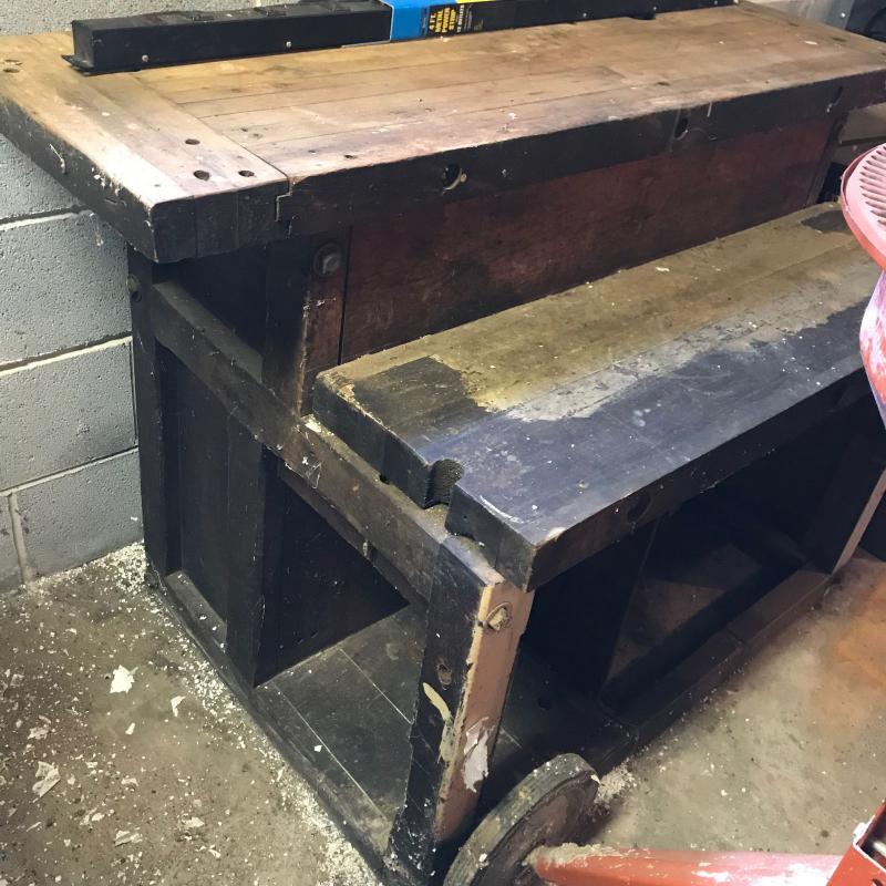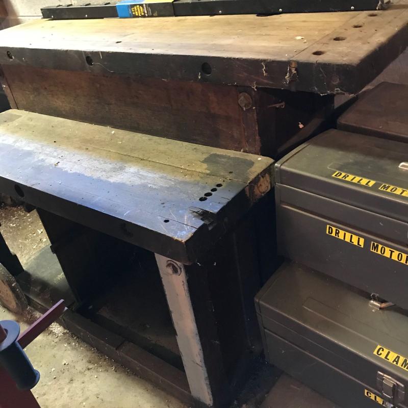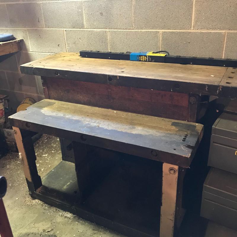 Solid antique wood work bench. Two levels with storage underneath. Also includes 4ft power strip that could be attached. Likely hand made but sturdy. Top measures 55” x 18”.x 33.5” h. Bottom level measures 41.5” x 13” x 25”h Bring help to load please. No shipping. Local pick up only.