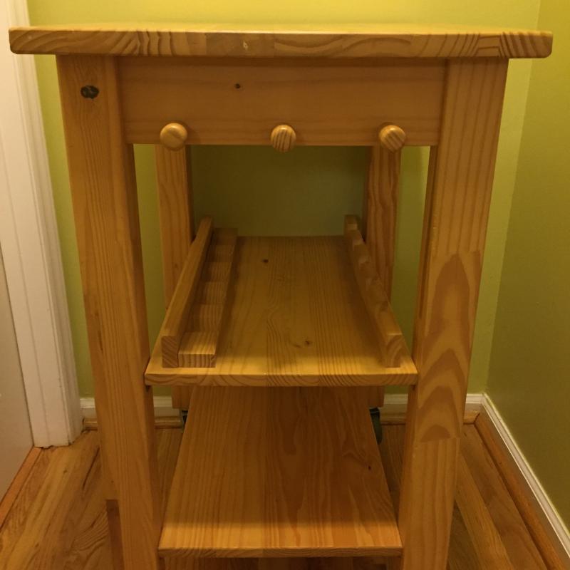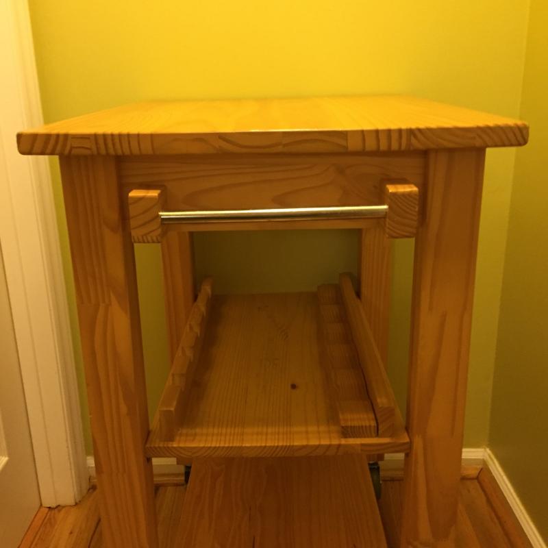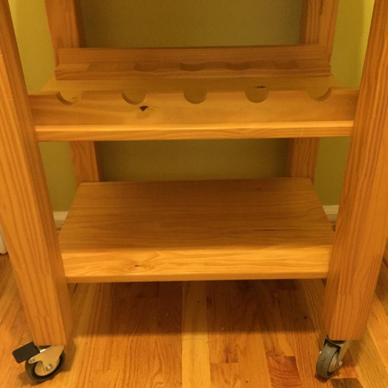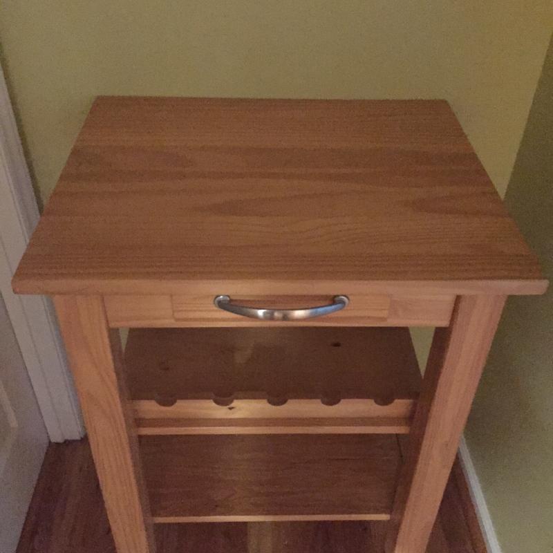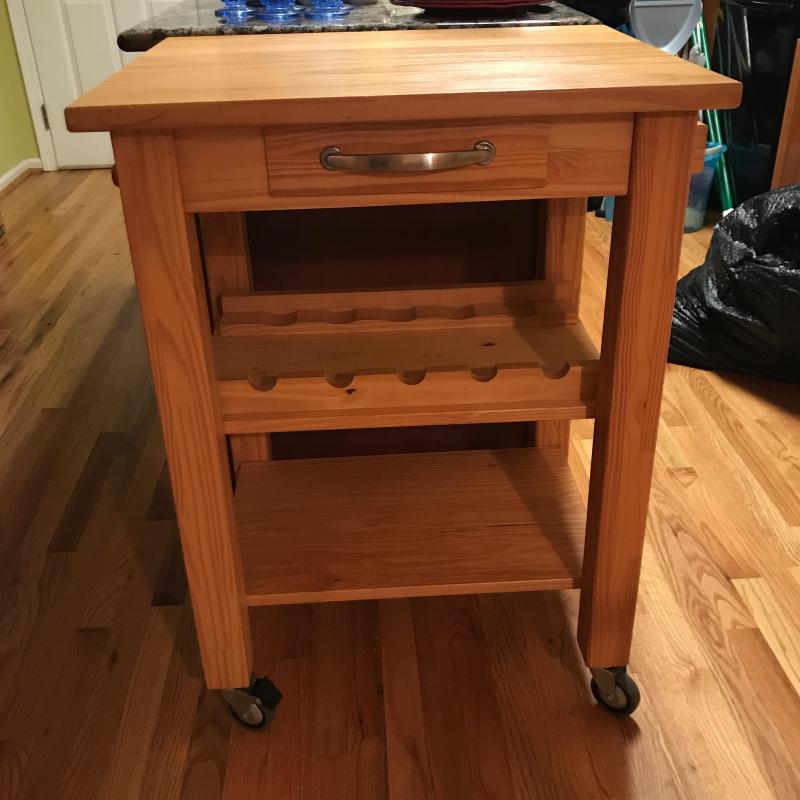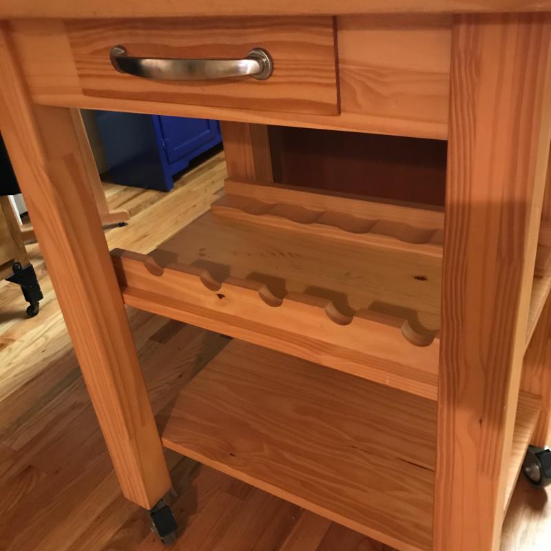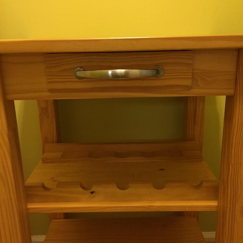 Rolling Wooden Bar Cart With Drawer, Towel Rack and Wine Bottle Holders. Cart Top has A few Scratches. Cart Measures 21” x 26” x 35.5”. Local Pickup Only