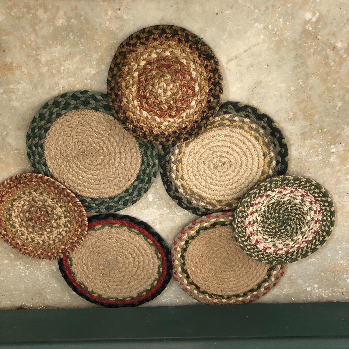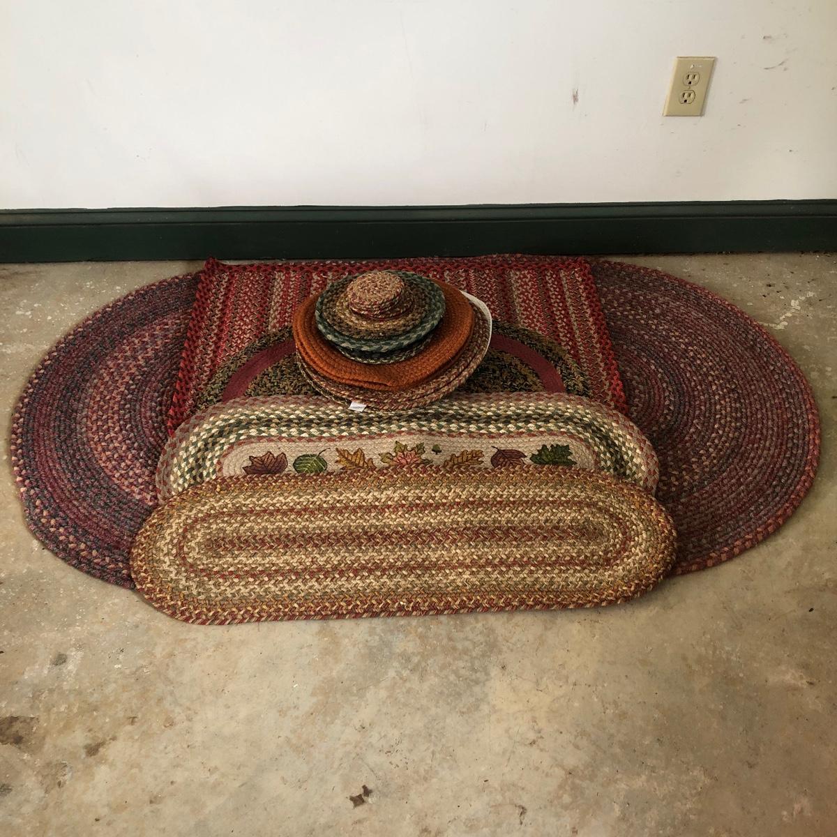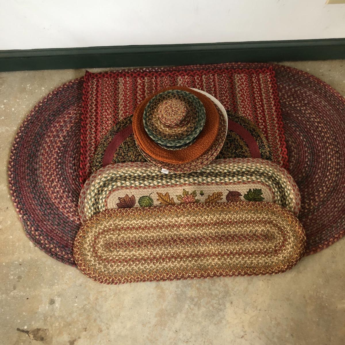 This lot includes colorful, beautiful and practical rugs. This Lot includes two oval rugs, rectangular rug, six coasters, two runners and fifteen round mats that are sized 8”D-15”D.