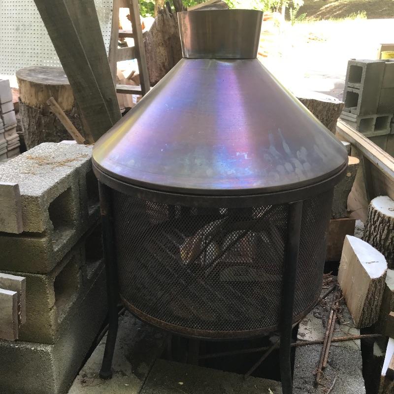 This fire pit would be a wonderful addition to your backyard or patio. At 38” tall and 27” in diameter, it is in good condition with only surface rust and a solid bottom. Top is finished to look like copper. Lot also includes a fire poker/log mover. See pics. Local pickup only.
