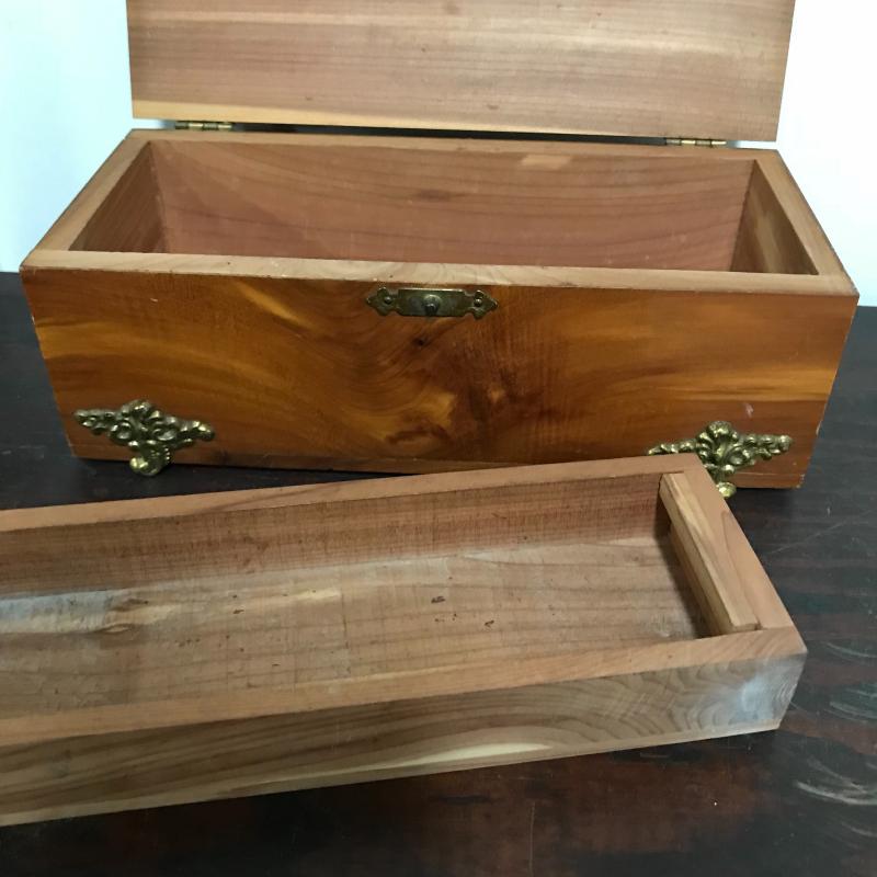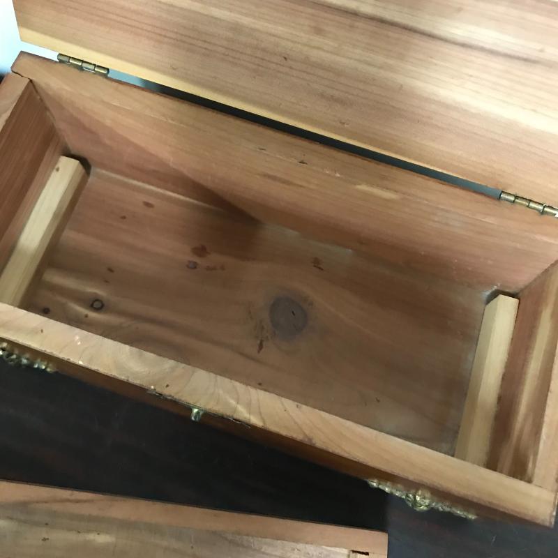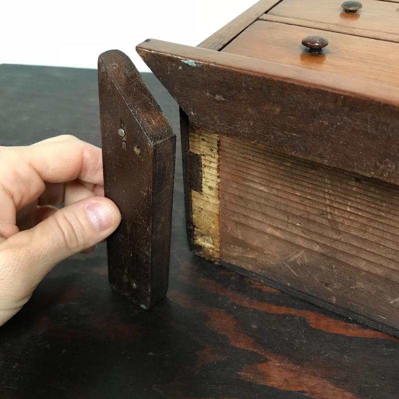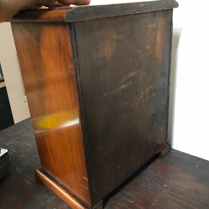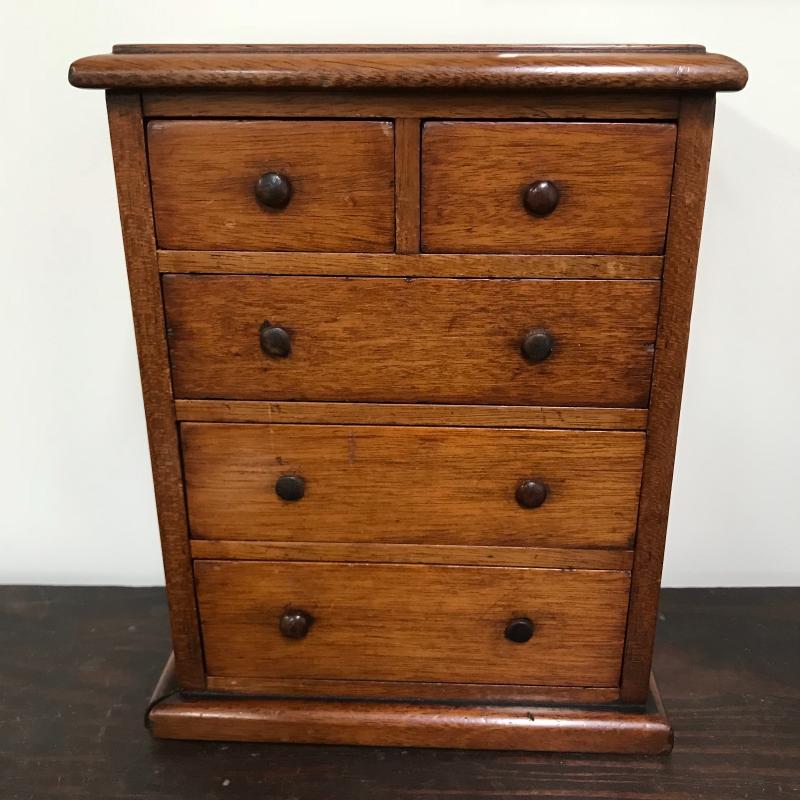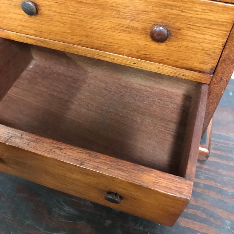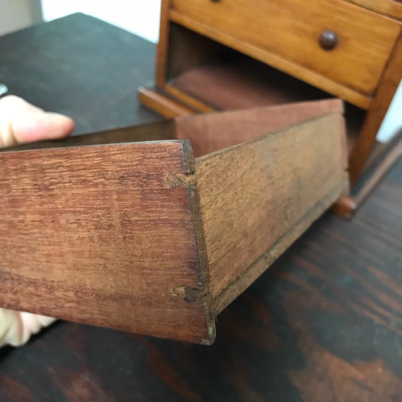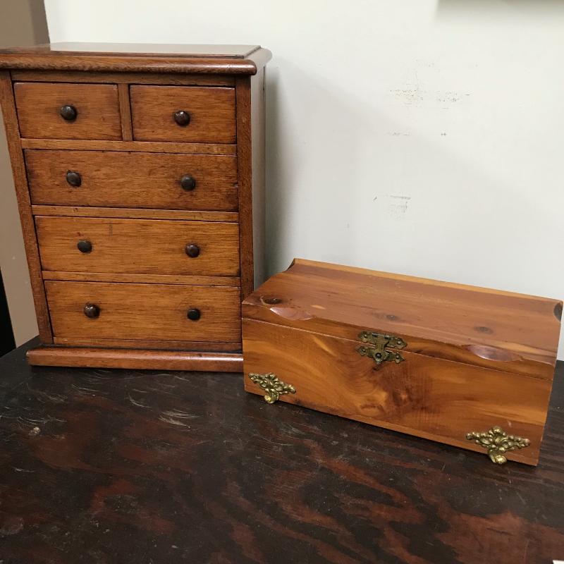 Wood (antique?) doll-sized chest and dresser. Chest is approx. 8”l x 4”w x 3”h. Dresser is approx. 7.5” x 5” x 9.5”. Part of dresser base needs to be nailed back to bottom. Shipping available or local pickup in Asheville, NC.