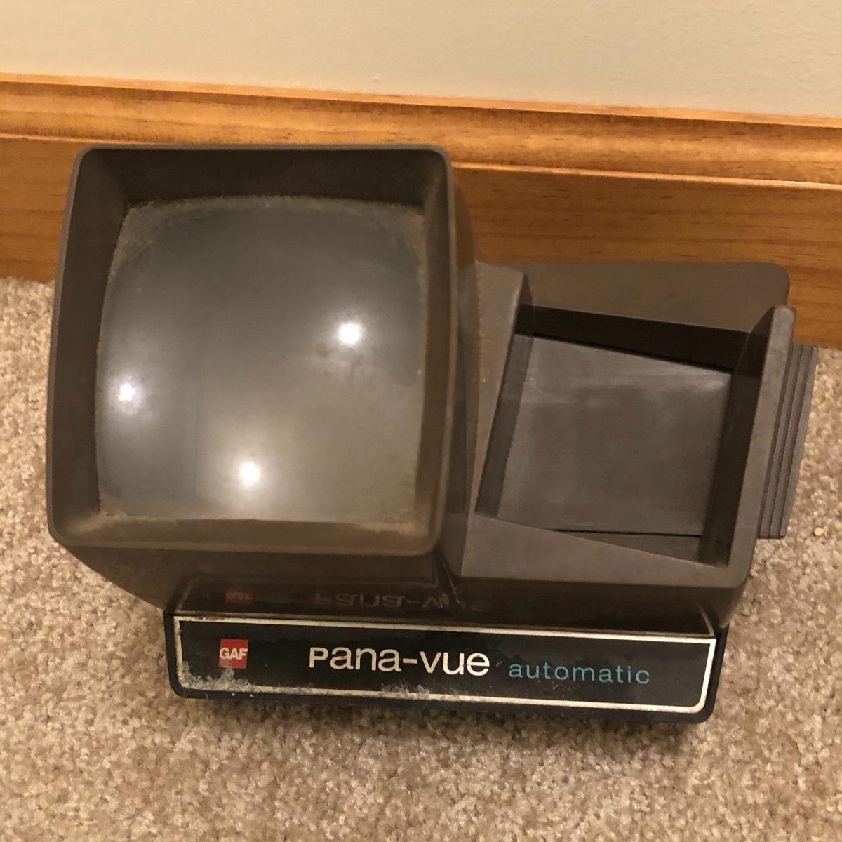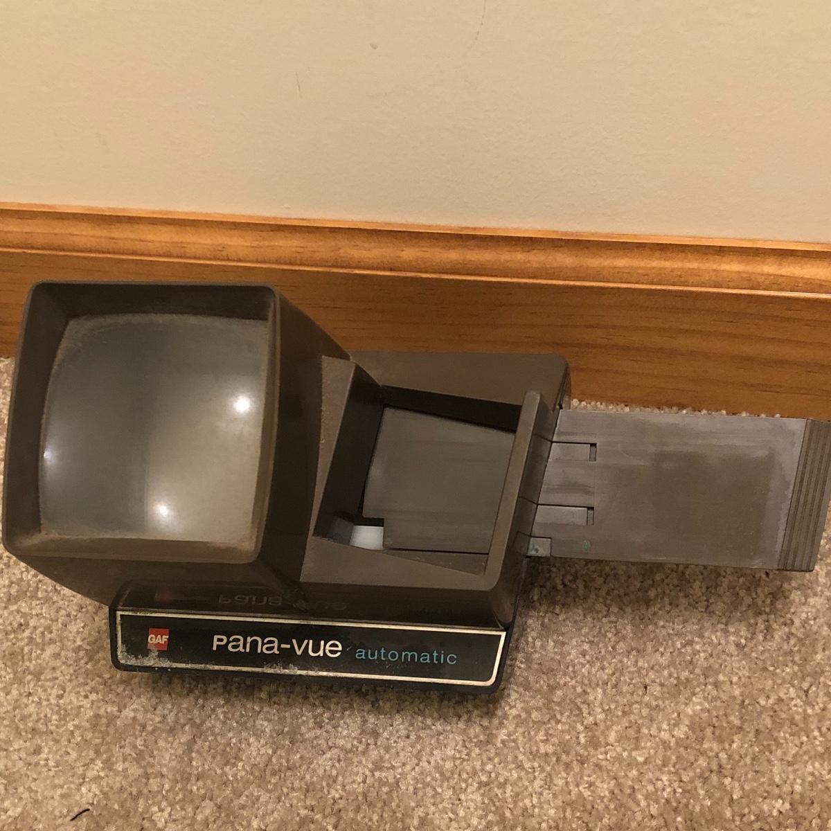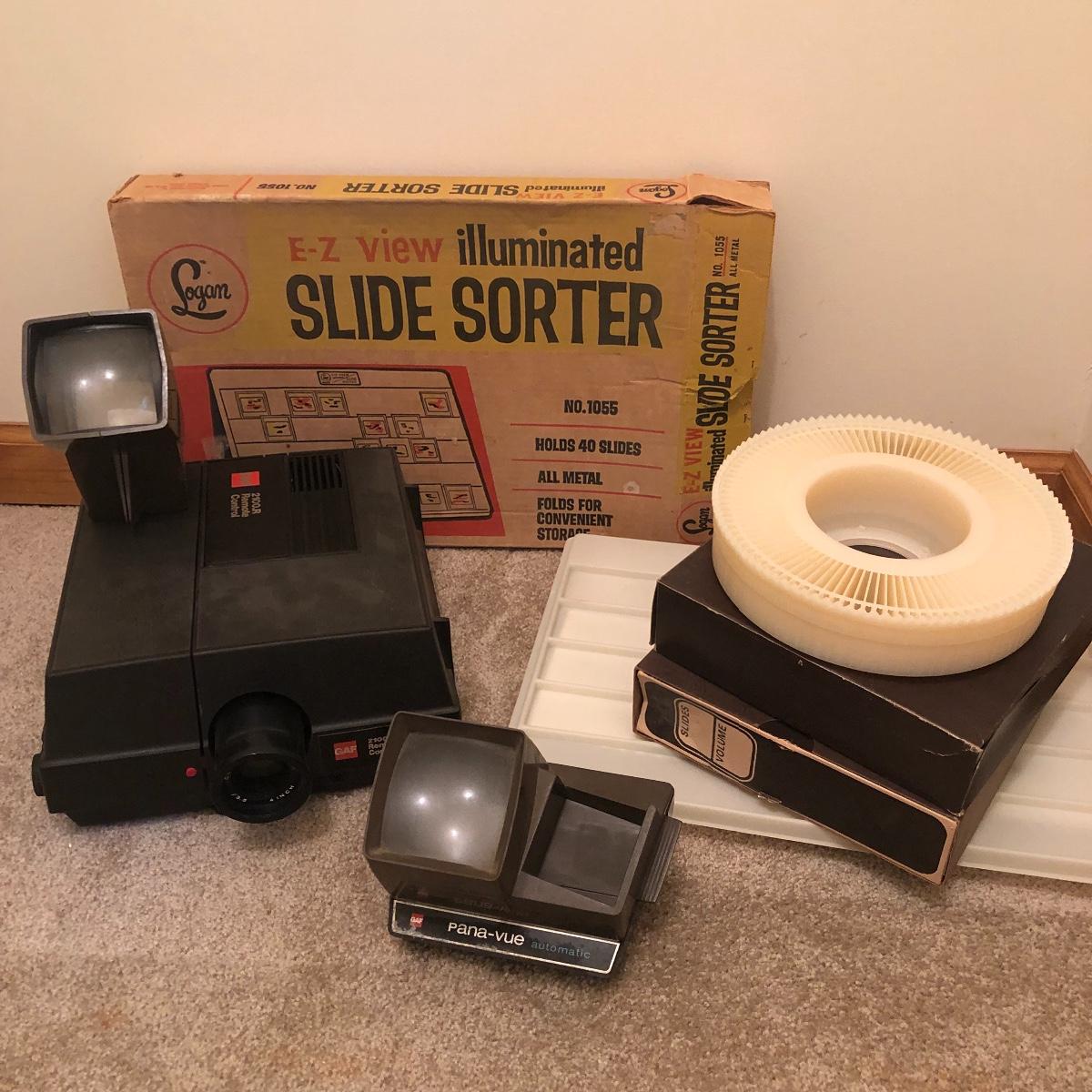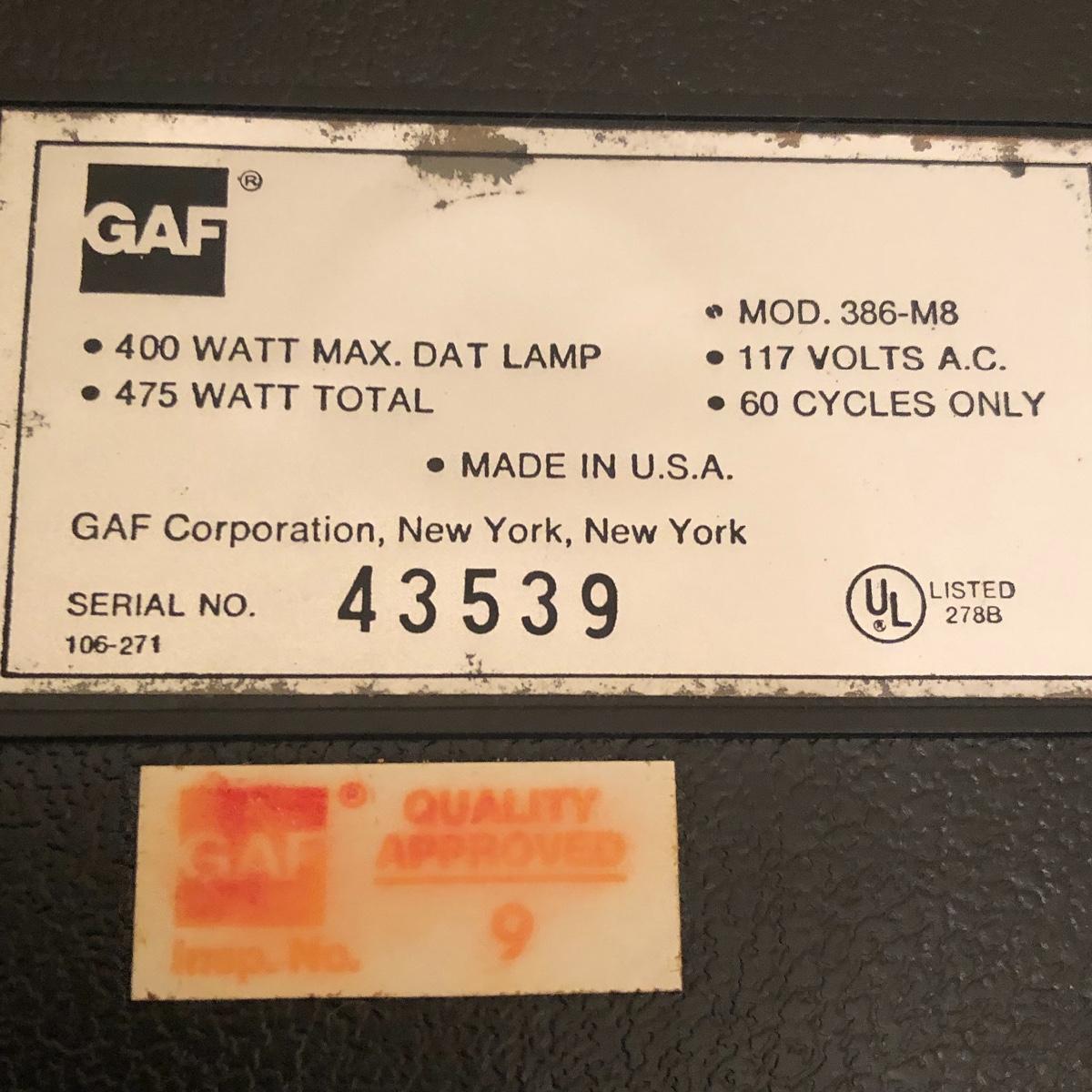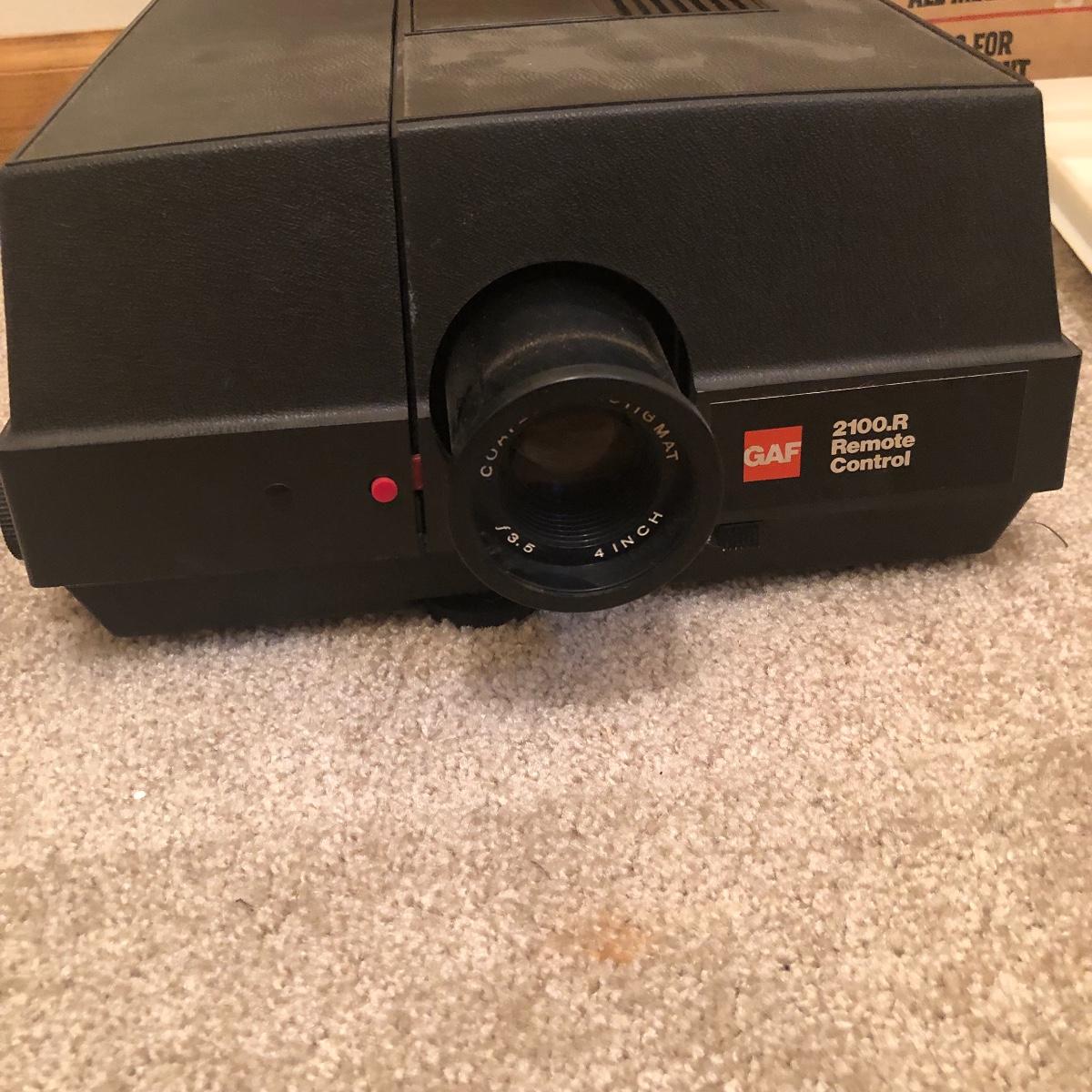 This lot includes a GAF 2100.R Remote Control projector, two pana-vues, an illuminated slide sorter, two carousel trays and four metal boxes. The projector powered on and the bulb lite when plugged in. Shipping Available.