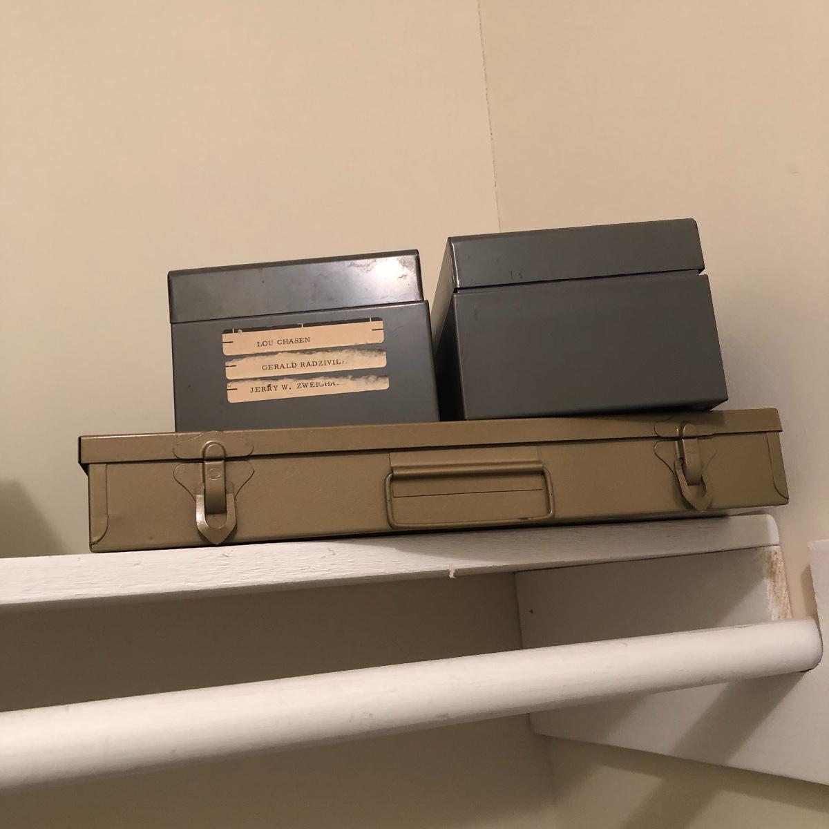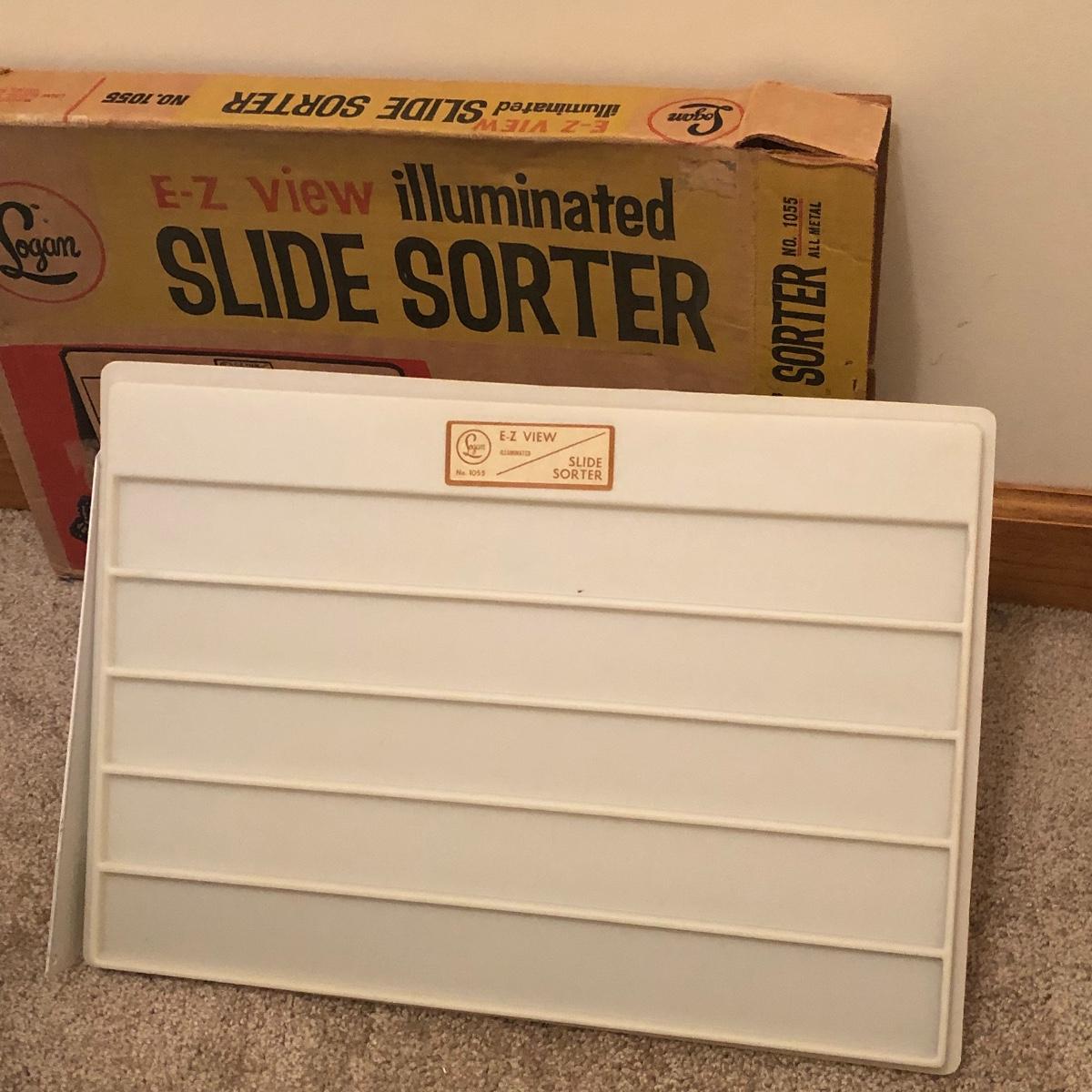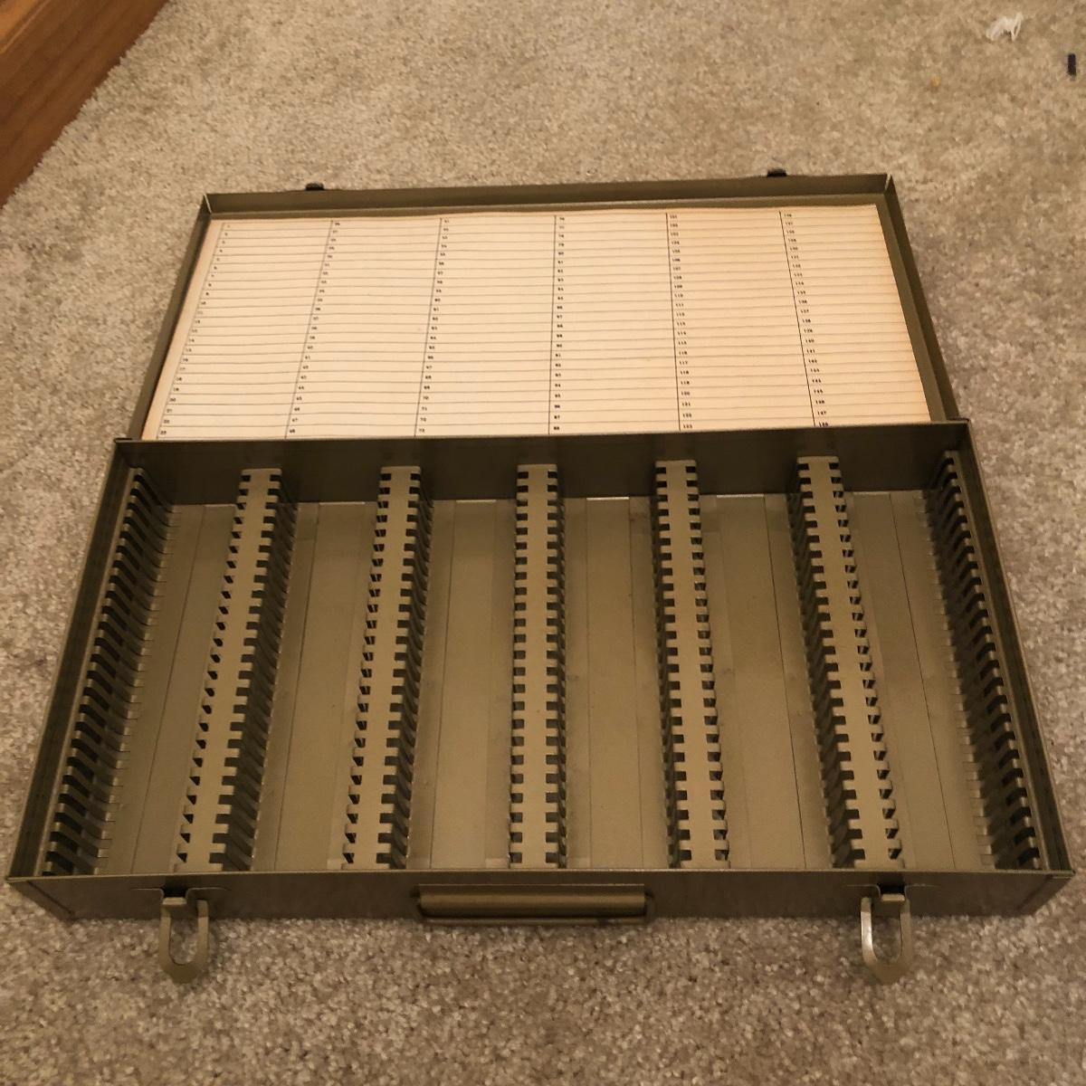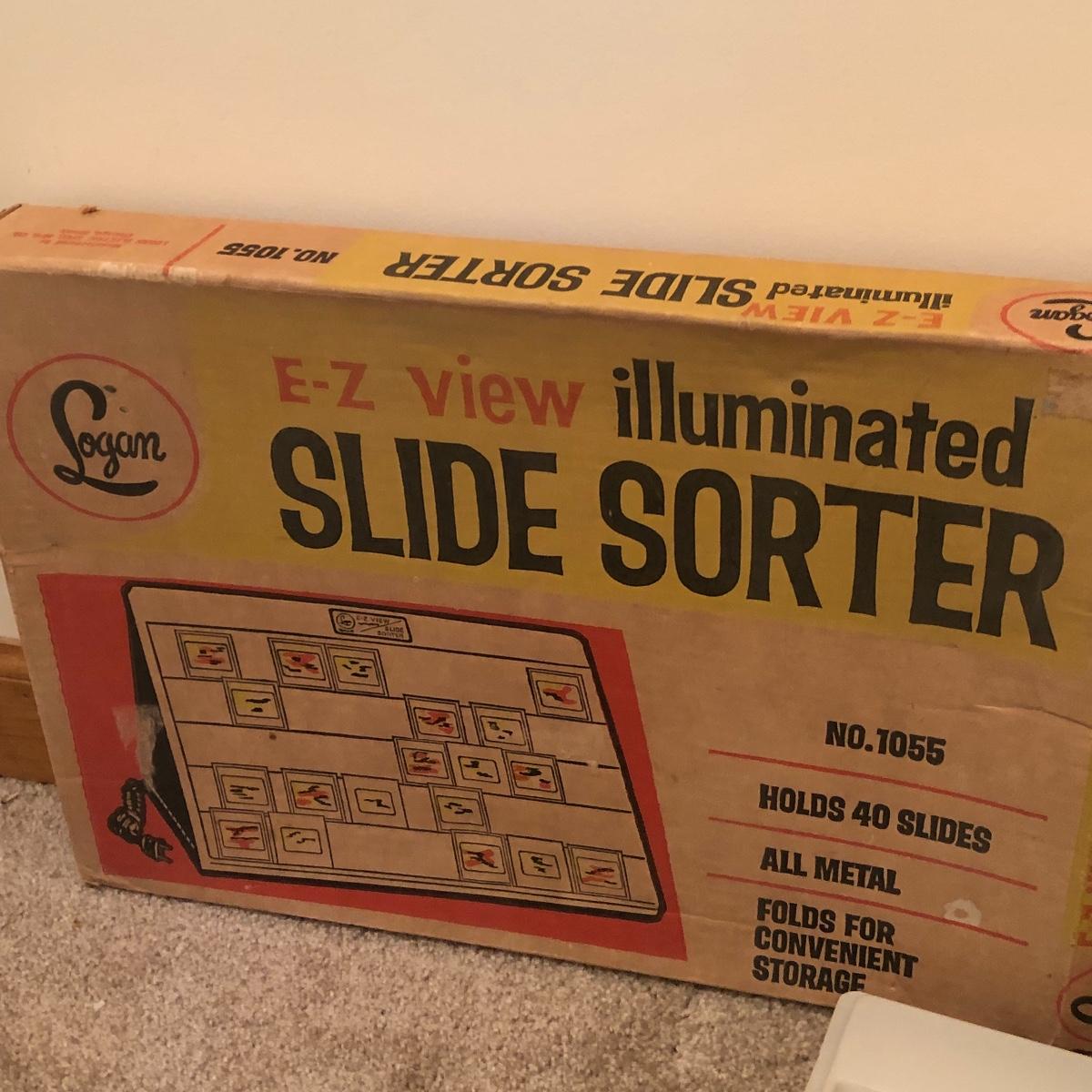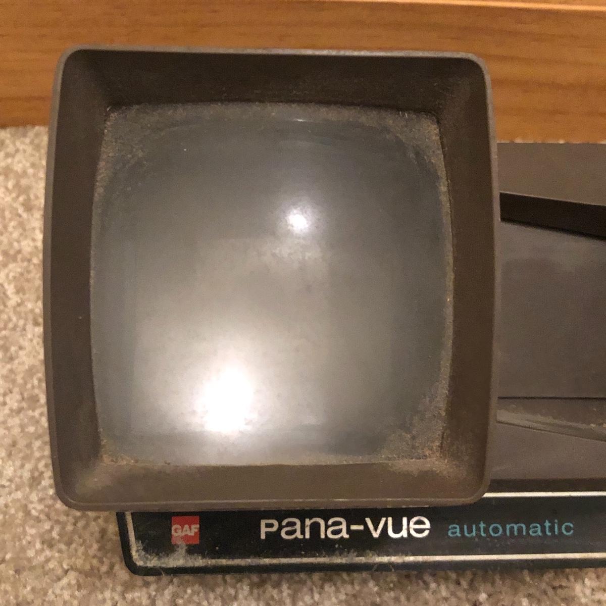 This lot includes a GAF 2100.R Remote Control projector, two pana-vues, an illuminated slide sorter, two carousel trays and four metal boxes. The projector powered on and the bulb lite when plugged in. Shipping Available.