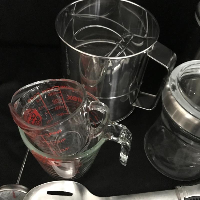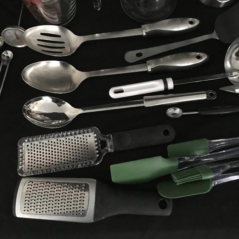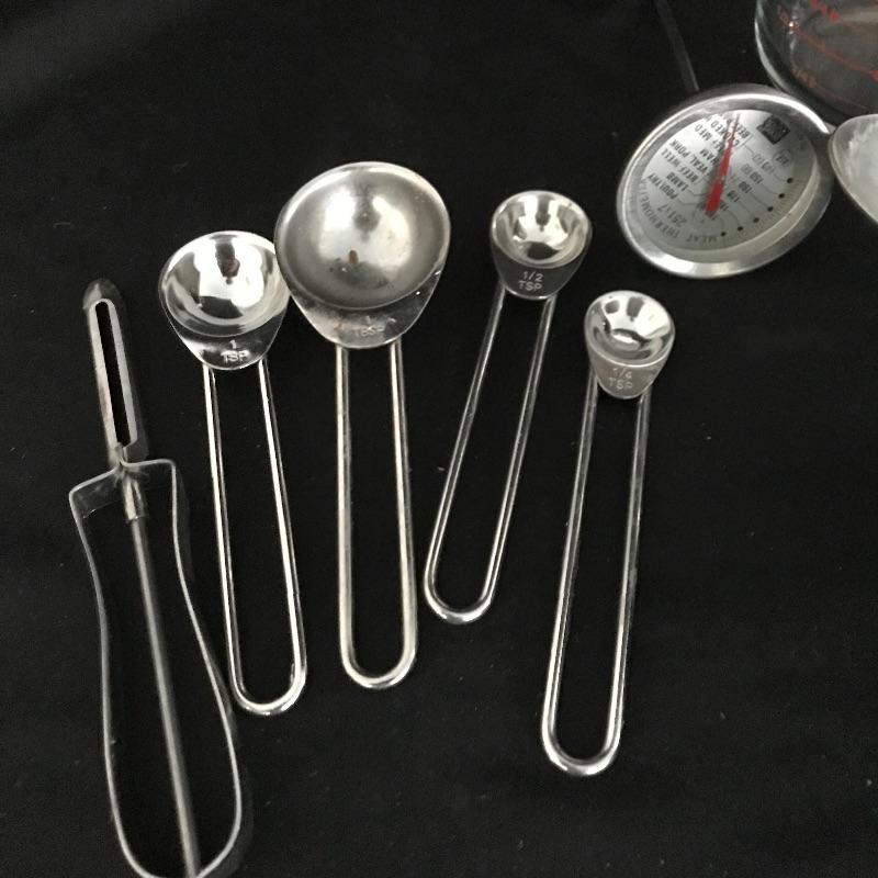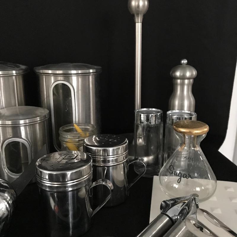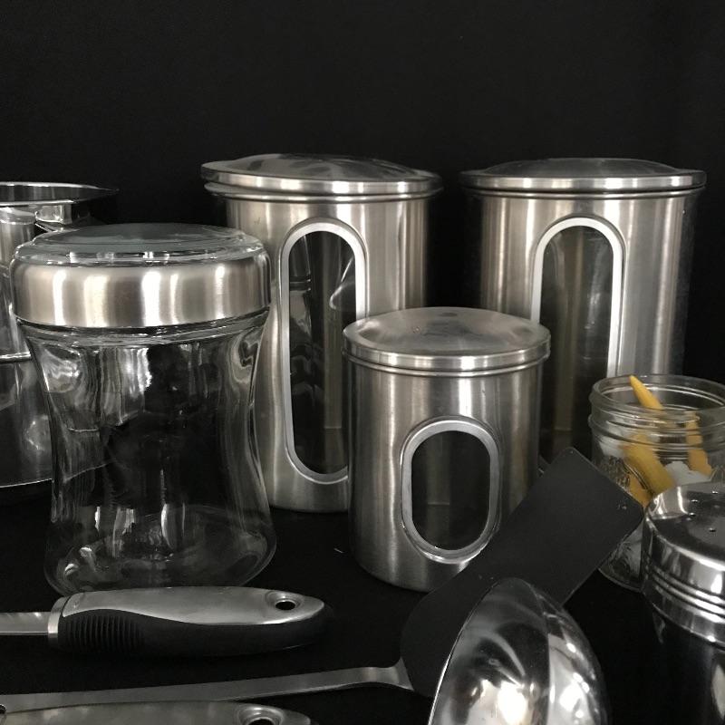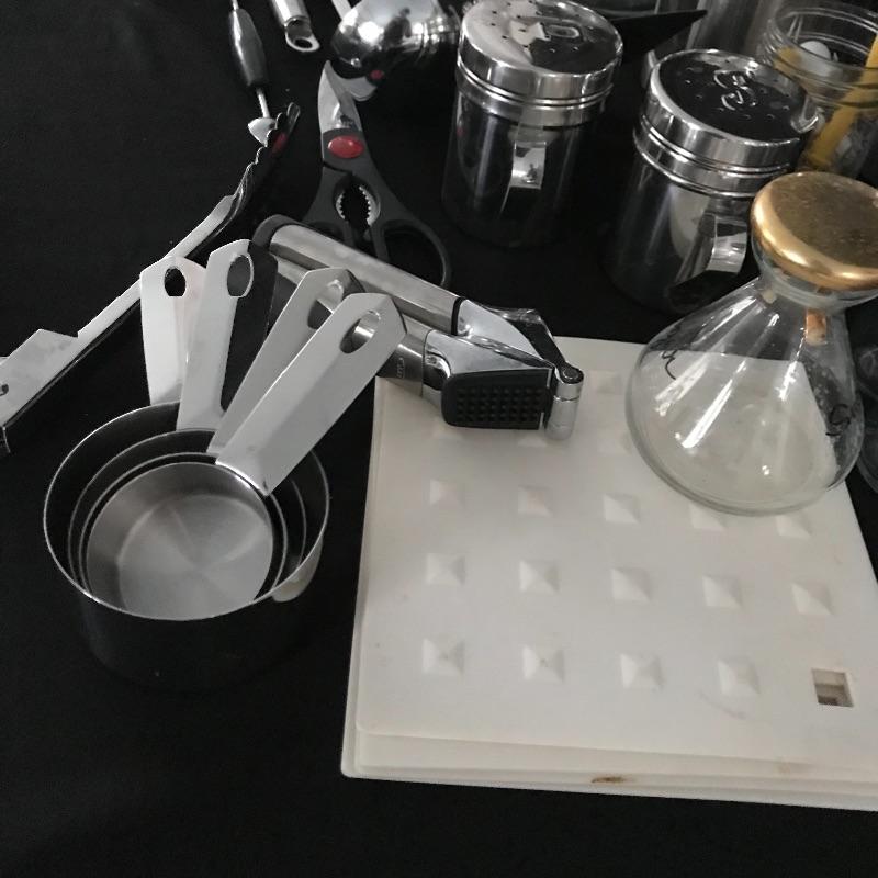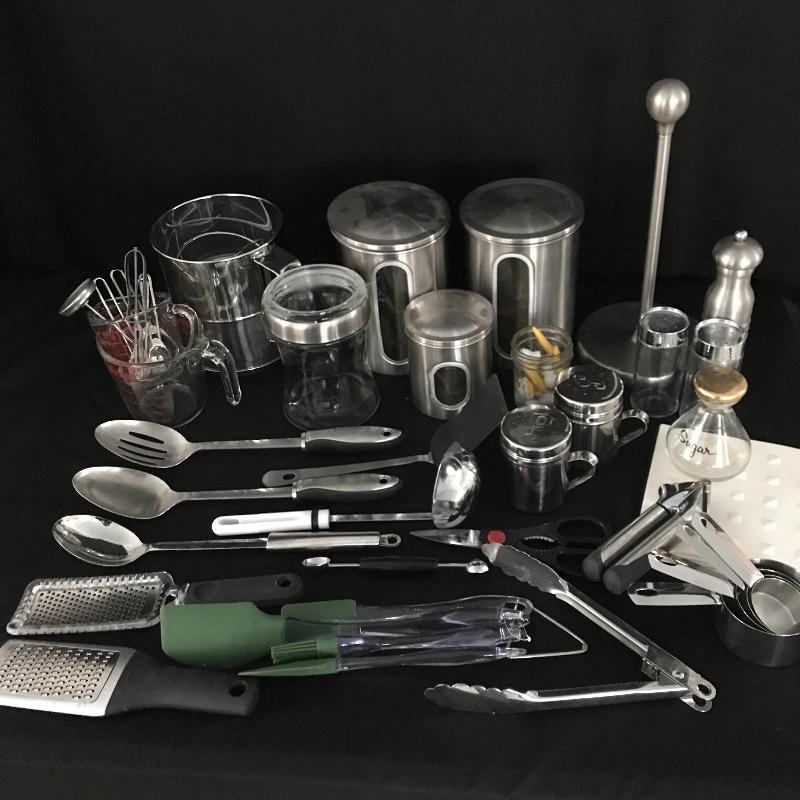 For the chef in your life who is in need of nice kitchen essentials! Stainless measuring spoons and cups, canisters, a weighted paper towel holder, salt and pepper shakers and so much more! See photos for entire lot inventory. No shipping.