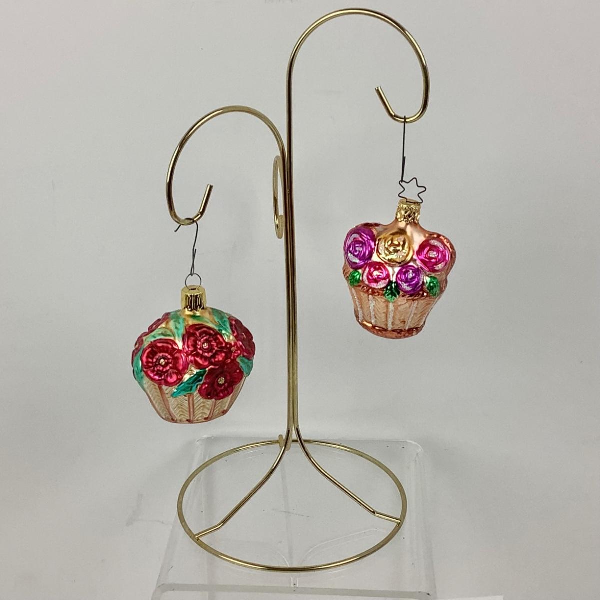 Pair of Vintage Floral Bouquet Basket Blown Glass Ornaments
