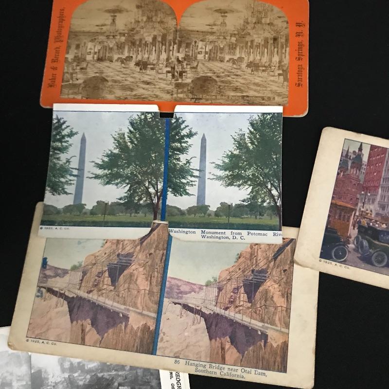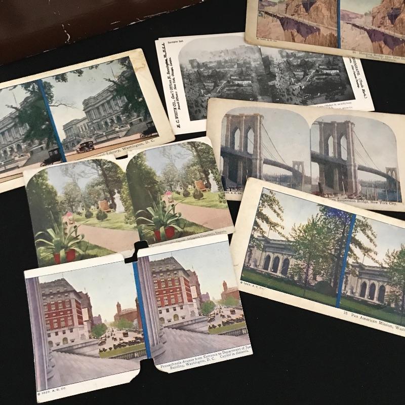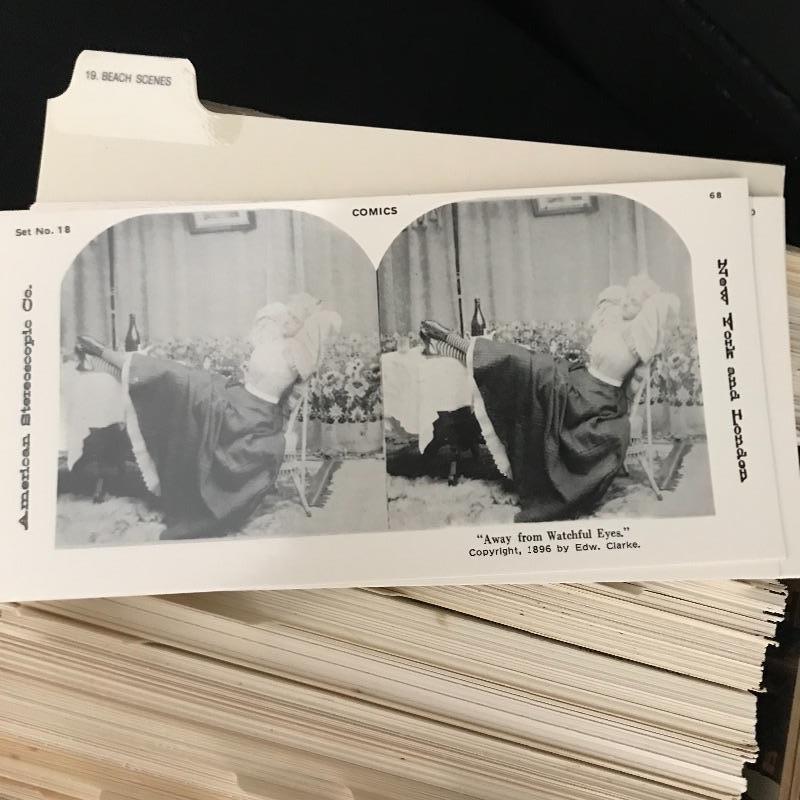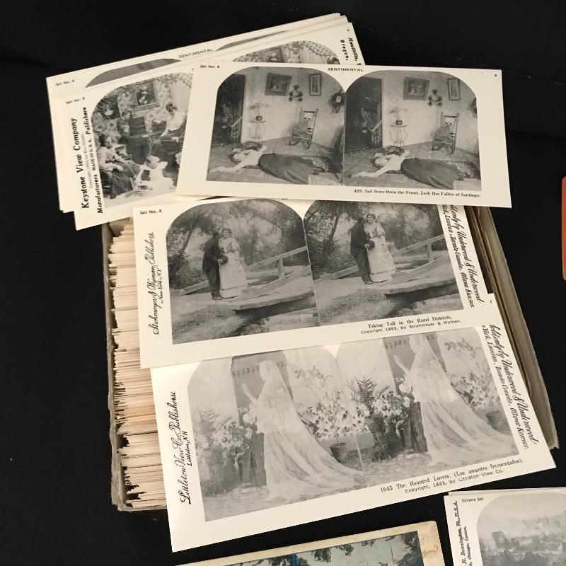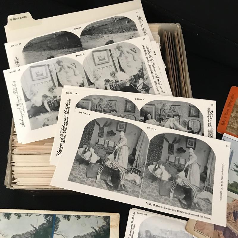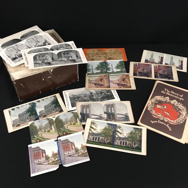 This very large and unique lot includes dozens, possibly hundreds of stereoscope slides that have been grouped with categories such as Civil War, Old West, Beach Scenes, Religious, Women’s Lib and much more. Only a handful are shown in photographs. This lot also includes two “The Story of the Stereoscope” pamphlets. See images.