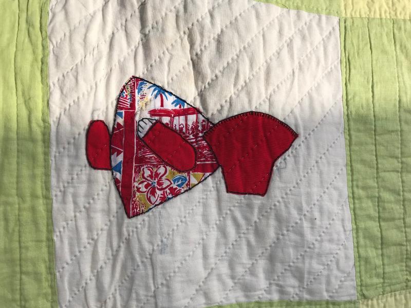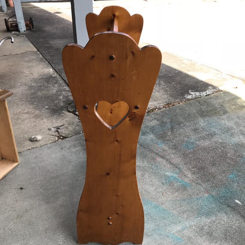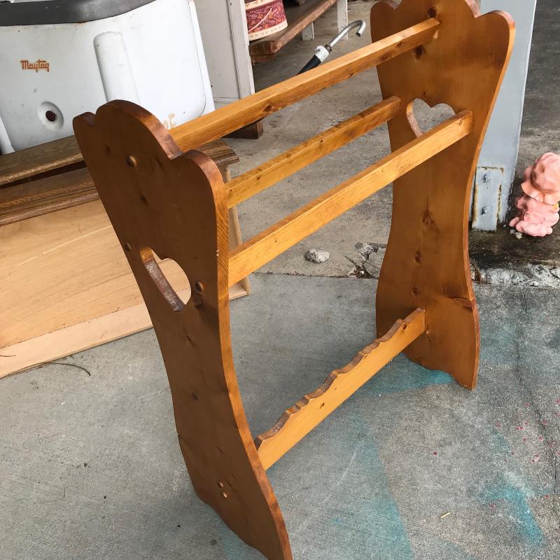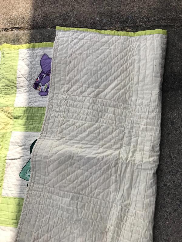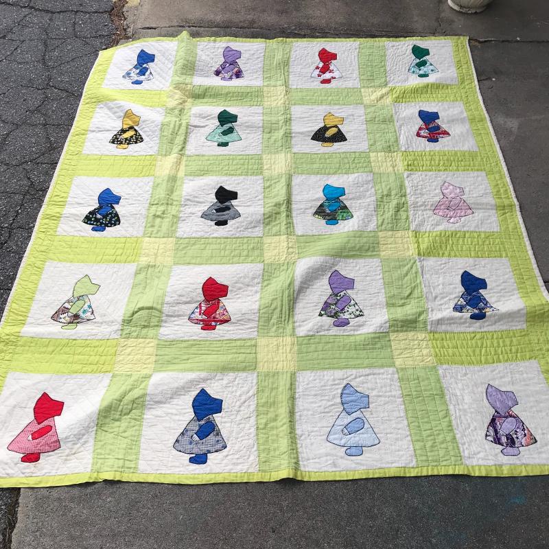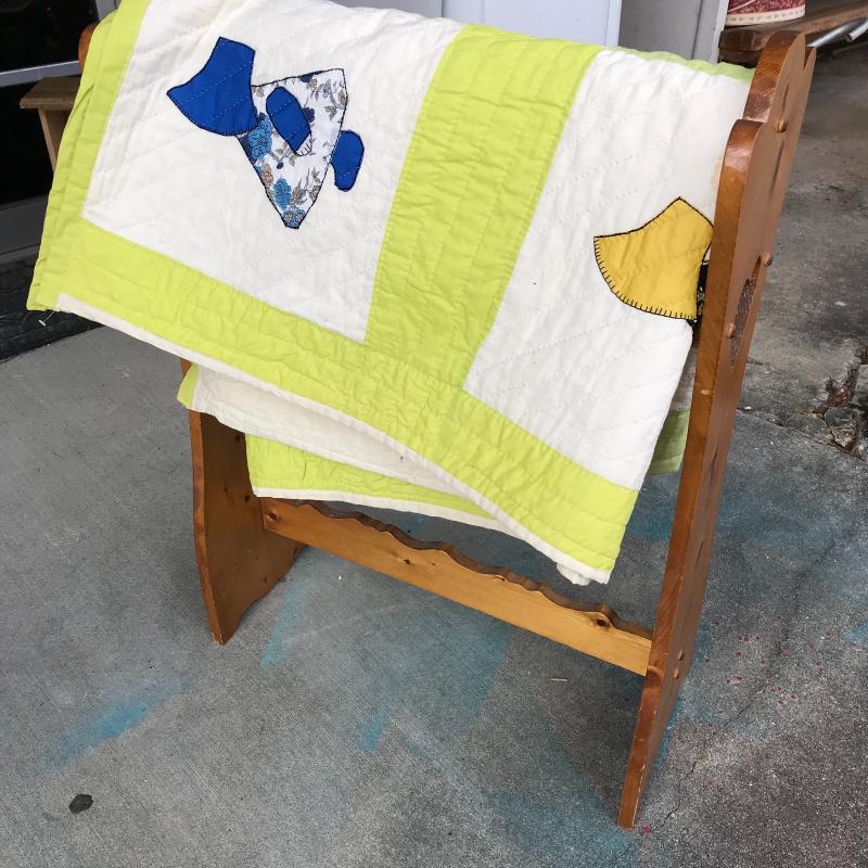 Colorful, clean and completed sunbonnet sue or “Dutch Baby Girl” quilt measures 88” x 75” and wood quilt rack with cutout heart at each end measures 25.5” x 11” x 35”. Lot is available for local pick up in Maggie Valley, NC only.