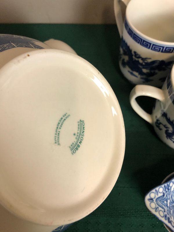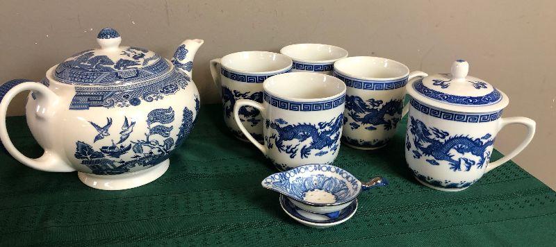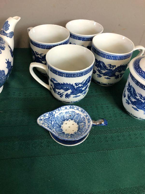 Blue Transferware tea pot has crack in lid - otherwise good condition