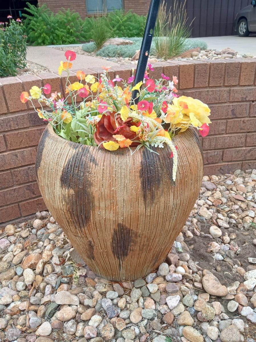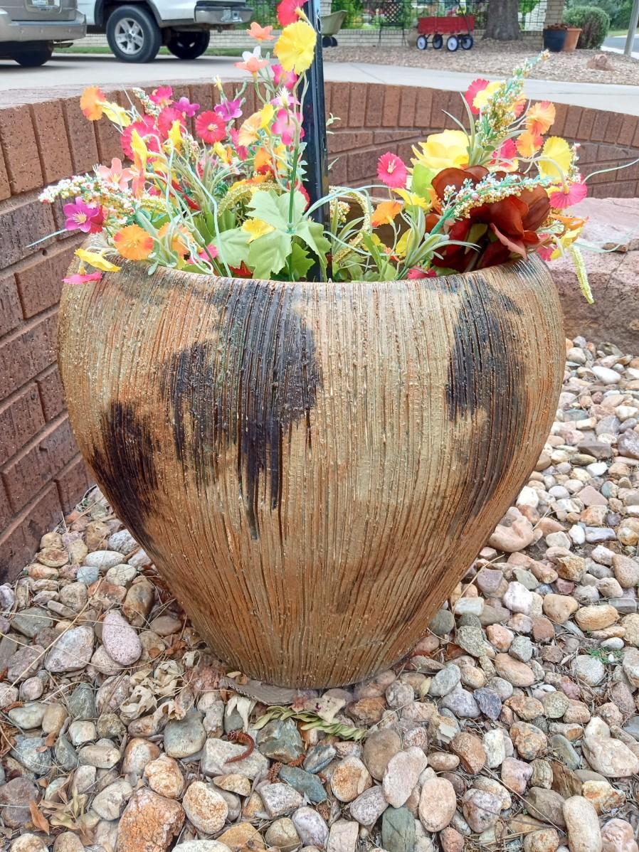 2 MEDIUM SIZE PLASTIC FLOWER POTS, A TERRA COTTA POT AND A CLAY? LARGER POT
