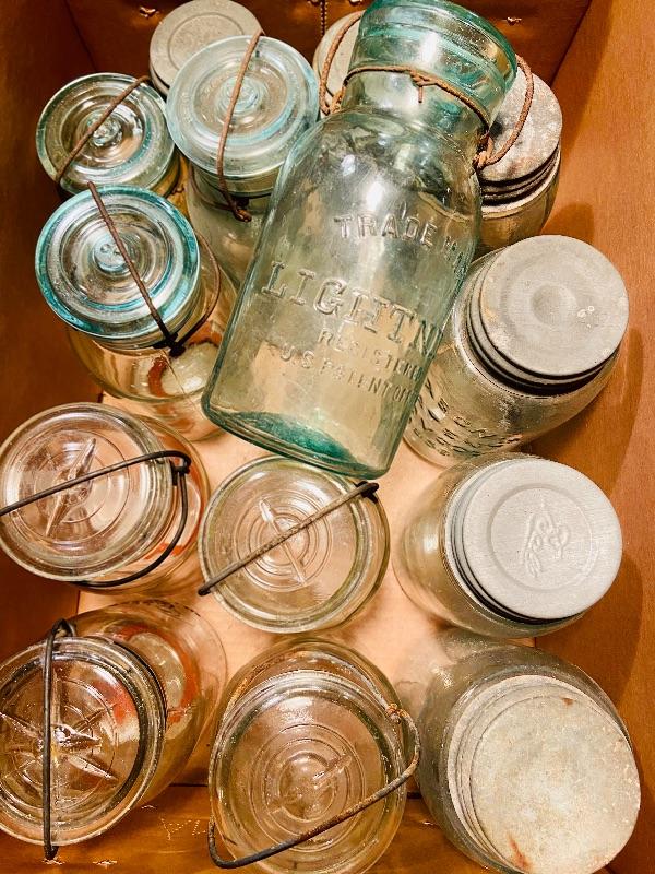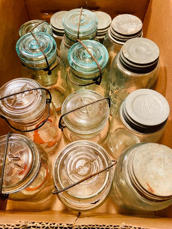 Box lot of vintage mason jars. MHW Please see all pictures for content of the lot, condition of the lot, and measurements if taken. Pictures are the best representation of the items listed and items are untested unless indicated in description. Thank you for looking and have fun bidding!