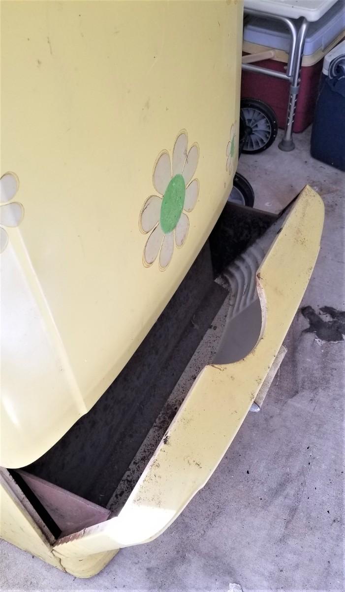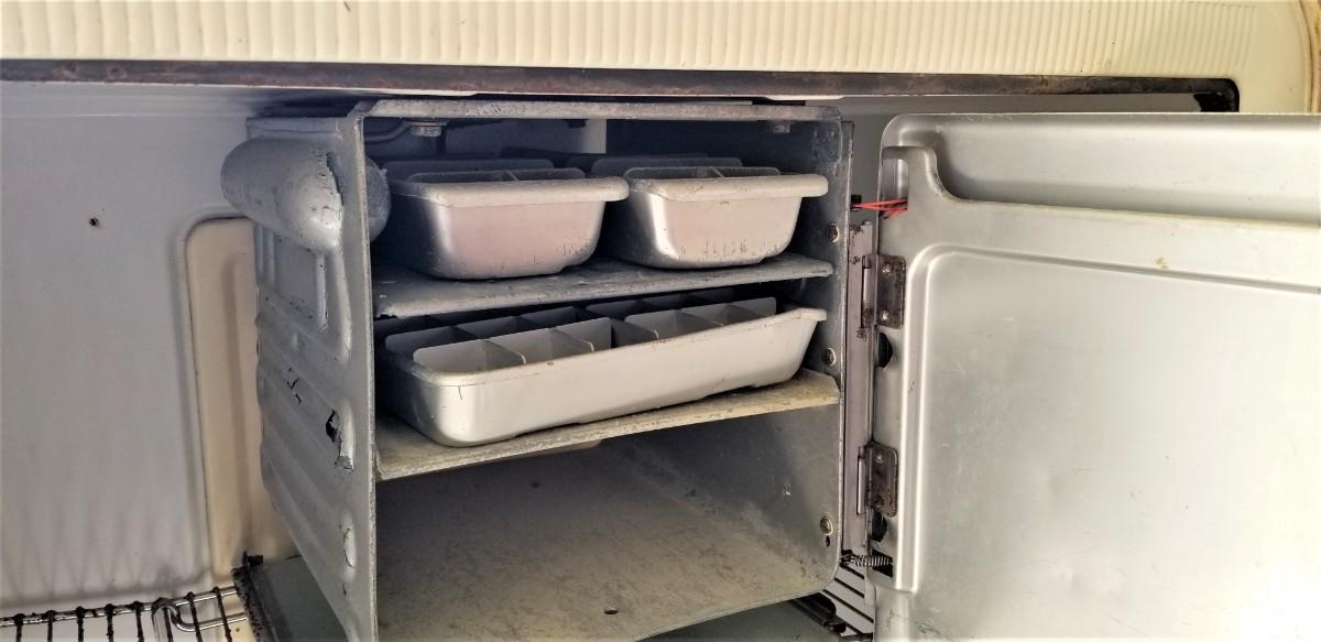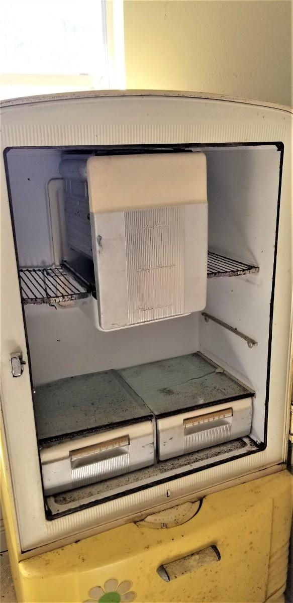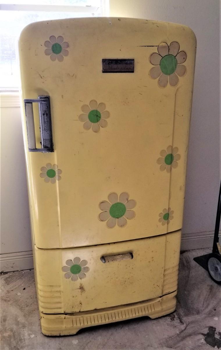 This is a restoration waiting to happen. Someone went all Flower Power on this thing at some point, but the decals can be peeled off. This is as is, where is. Needs to be cleaned up, but appears to be all there, even down to the ice trays in the freezer. 30.75" across, 23" deep, 61" tall. Garage kept. Anyone want?