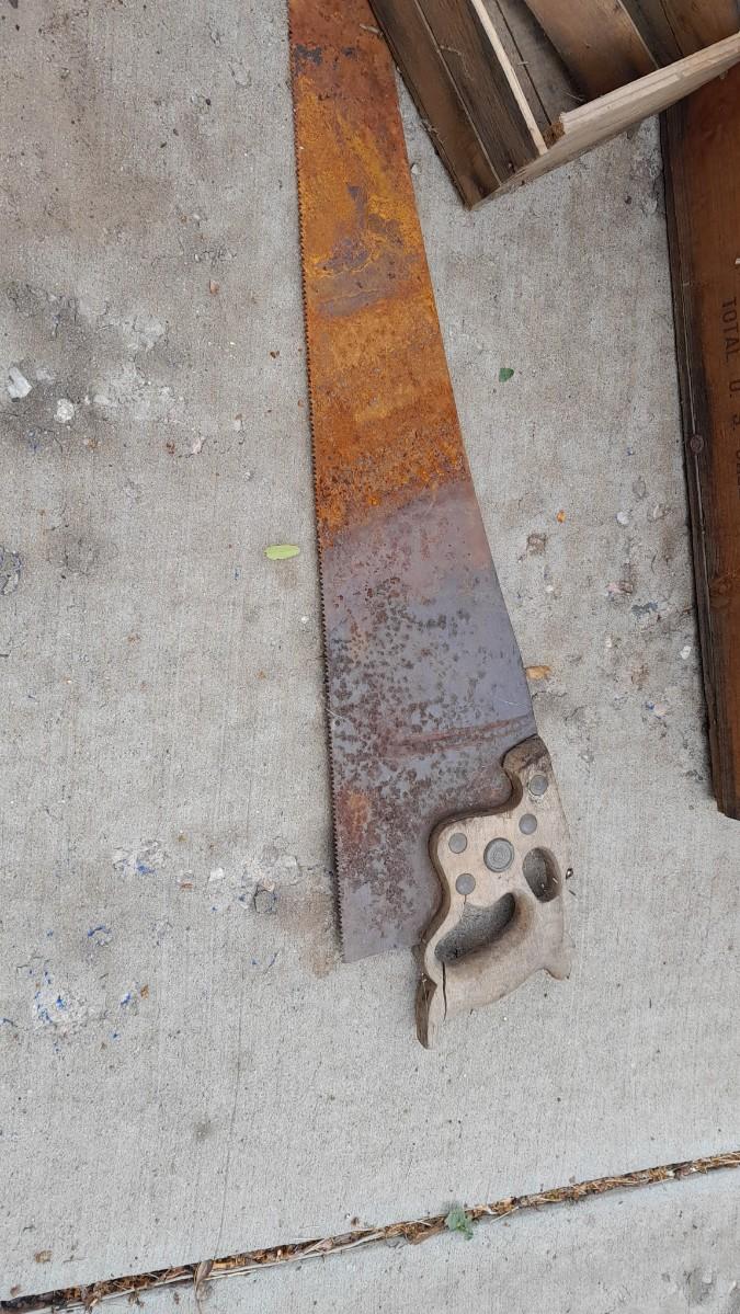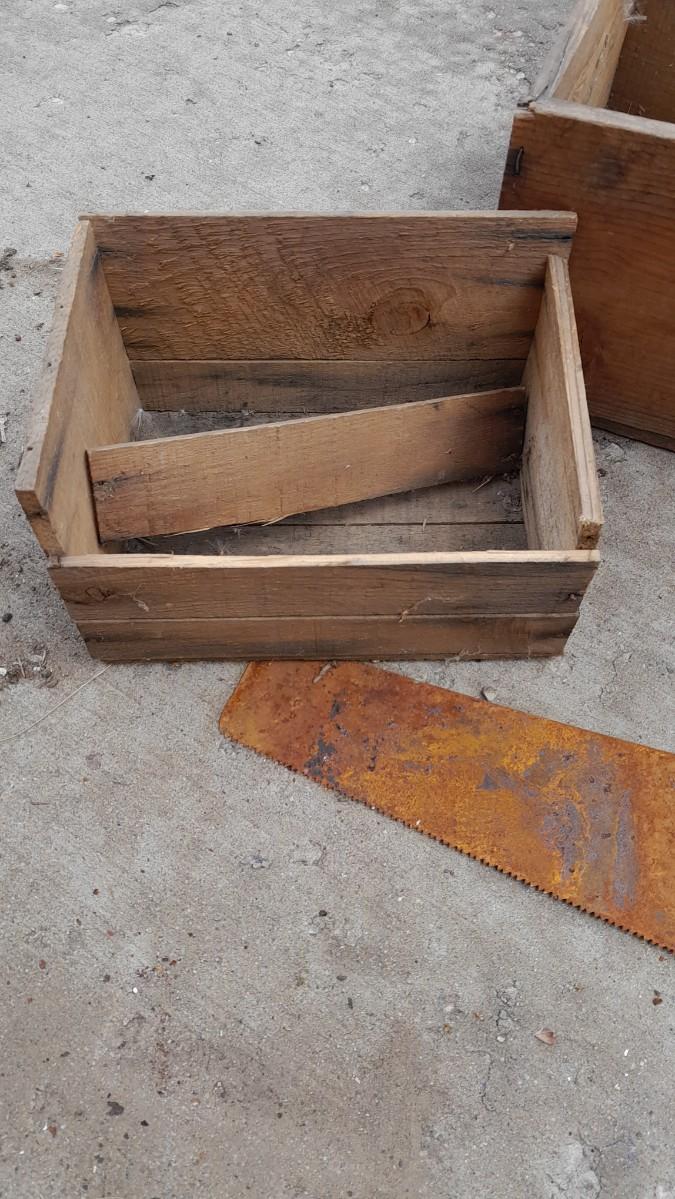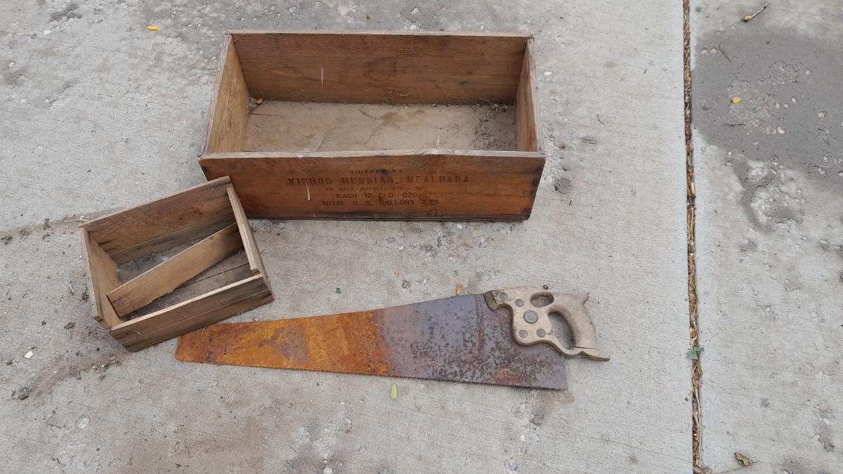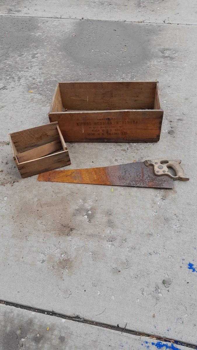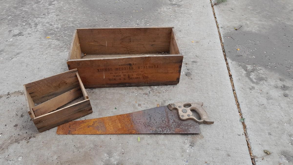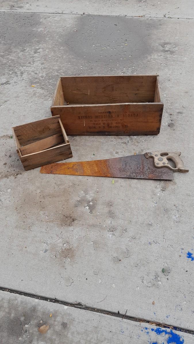 TWO VINTAGE WOODEN BOXES WITH HAND SAW